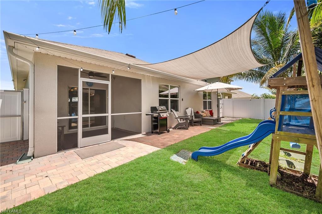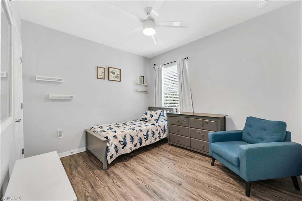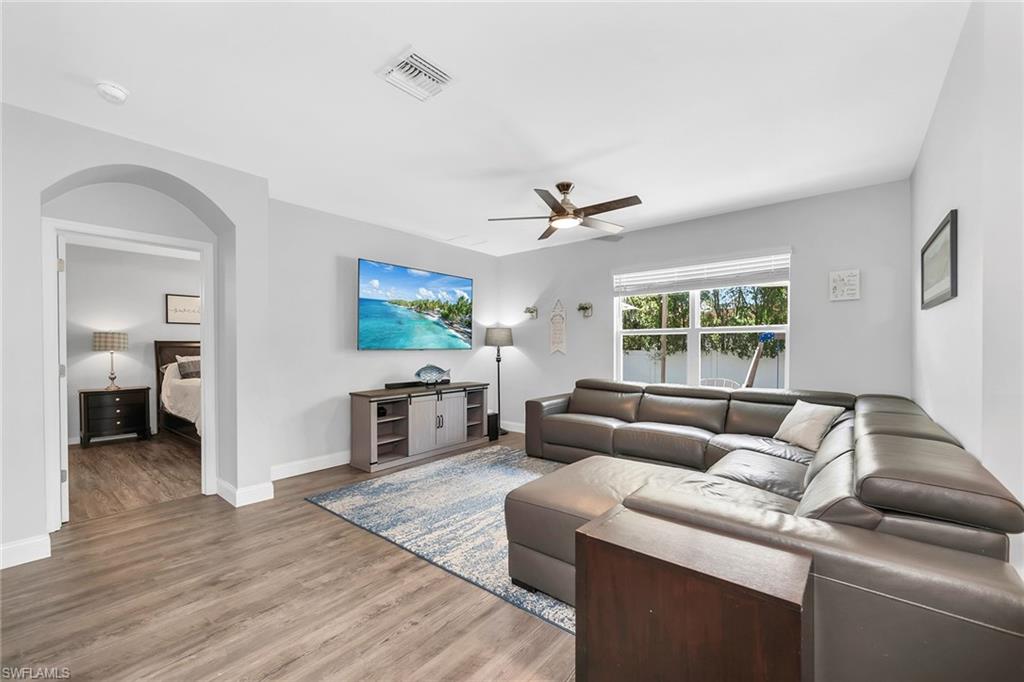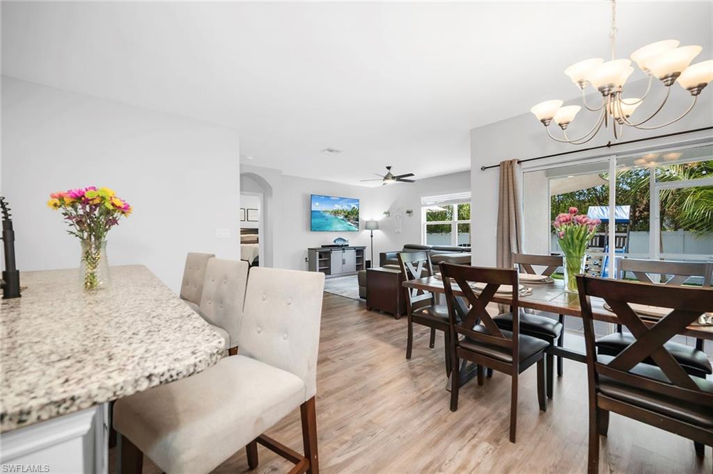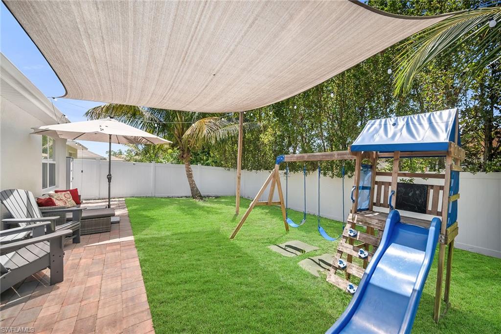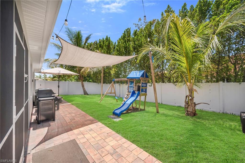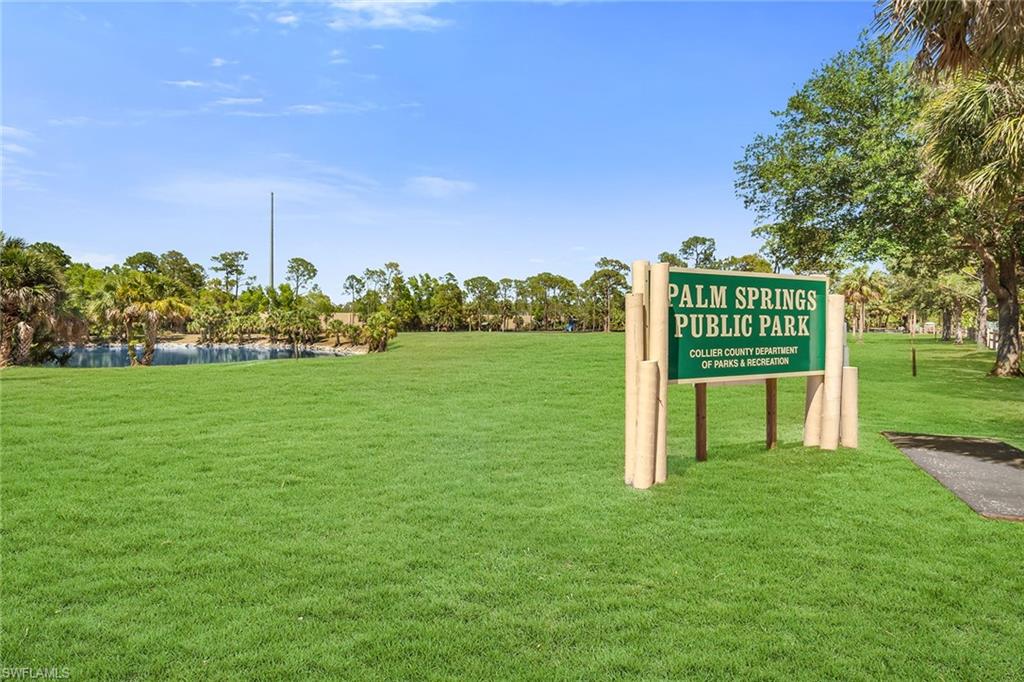 At end of a quiet cul-de-sac with desirable western exposure, this four-bedroom, two-bath home offers privacy, convenience and a prime Naples location. Tucked in a well-kept secret neighborhood with low HOA fees, the home is just minutes from Interstate 75, downtown Naples, Marco Island and the Gulf’s white sand beaches, providing easy access to city amenities and coastal escapes. The fully fenced backyard is surrounded by lush landscaping and features a large grassy area that offers exceptional privacy, ideal for outdoor activities, pets or peaceful relaxation. Inside, arched walkways and laminate flooring add charm and character throughout. The open kitchen is equipped with shaker-style cabinetry, a tile backsplash, recessed lighting, a center island with breakfast counter, pantry and stainless steel appliances including a range, microwave, dishwasher and refrigerator with icemaker. The dining area connects to the living room and opens to the screened lanai and modest brick paver patio, ideal for casual barbecues or relaxing at sunset. The primary suite includes two walk-in closets with built-in shelving and a spa-like bath with dual vanities, a walk-in shower with bench, floor-to-ceiling tile, and a frameless glass enclosure. Three guest bedrooms share a well-appointed bath with a shower tub combo. Additional features include a laundry room with overhead cabinetry, a two-car garage and manual hurricane shutters. Near Palm Springs Park—with its playground, disc golf course and fishing pond—and just around the corner from a local bowling alley, this home is made for active families and outdoor enthusiasts.