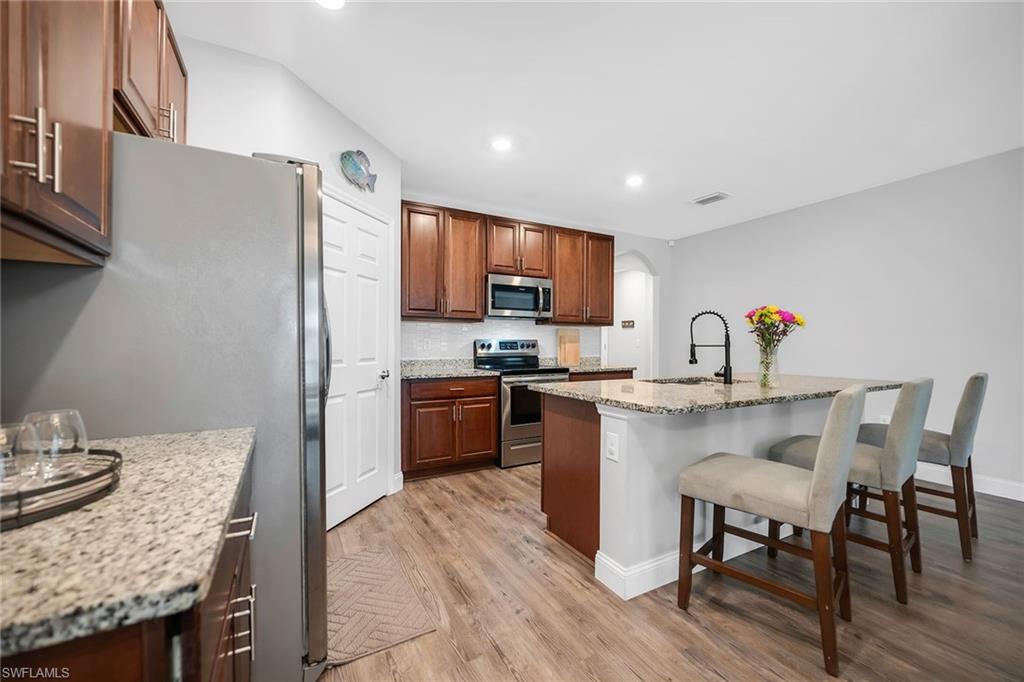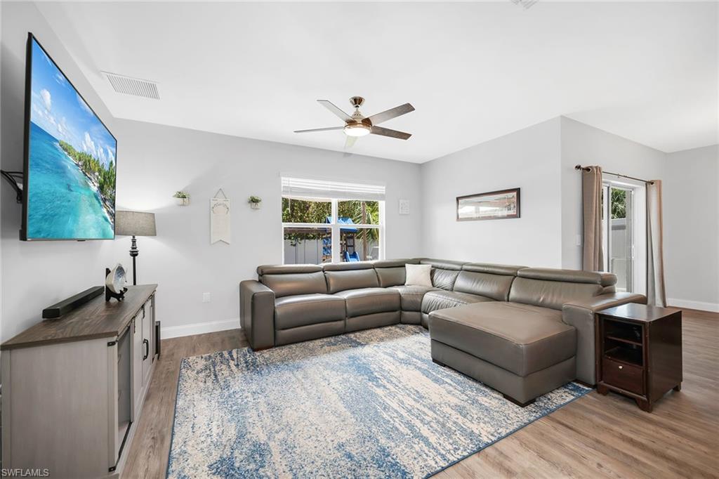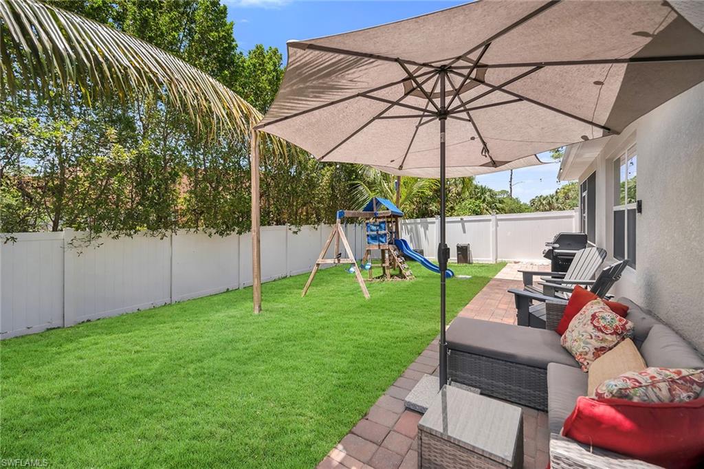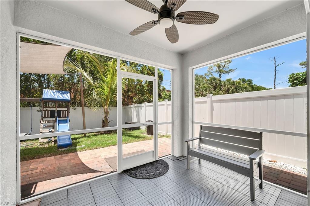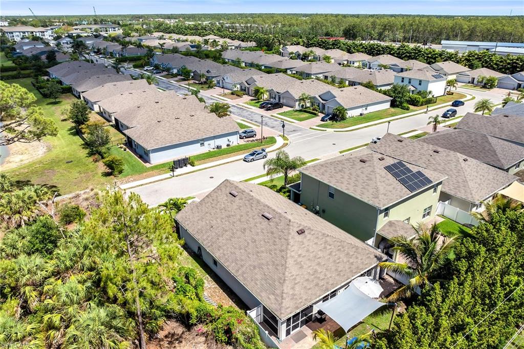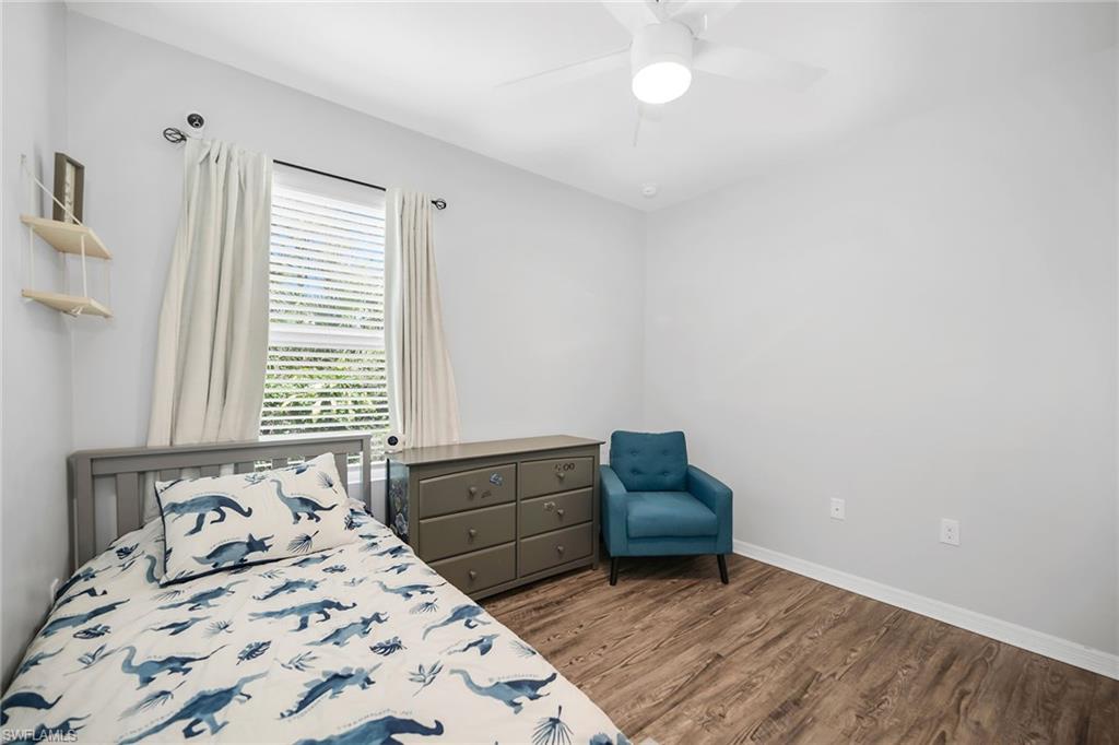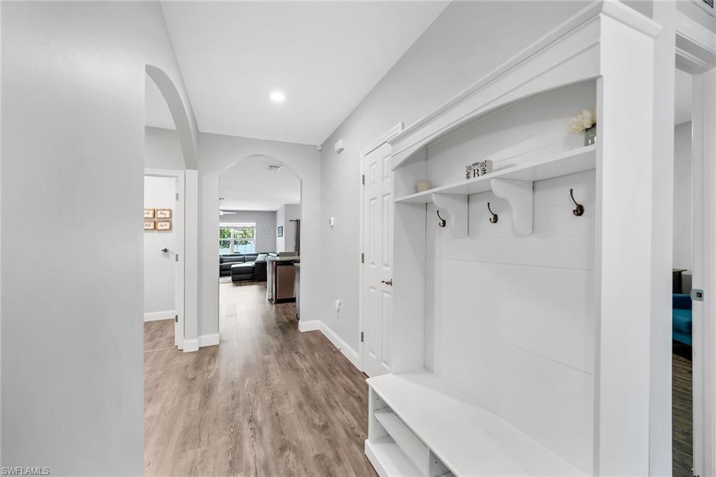 At end of a quiet cul-de-sac with desirable western exposure, this four-bedroom, two-bath home offers privacy, convenience and a prime Naples location. Tucked in a well-kept secret neighborhood with low HOA fees, the home is just minutes from Interstate 75, downtown Naples, Marco Island and the Gulf’s white sand beaches, providing easy access to city amenities and coastal escapes. The fully fenced backyard is surrounded by lush landscaping and features a large grassy area that offers exceptional privacy, ideal for outdoor activities, pets or peaceful relaxation. Inside, arched walkways and laminate flooring add charm and character throughout. The open kitchen is equipped with shaker-style cabinetry, a tile backsplash, recessed lighting, a center island with breakfast counter, pantry and stainless steel appliances including a range, microwave, dishwasher and refrigerator with icemaker. The dining area connects to the living room and opens to the screened lanai and modest brick paver patio, ideal for casual barbecues or relaxing at sunset. The primary suite includes two walk-in closets with built-in shelving and a spa-like bath with dual vanities, a walk-in shower with bench, floor-to-ceiling tile, and a frameless glass enclosure. Three guest bedrooms share a well-appointed bath with a shower tub combo. Additional features include a laundry room with overhead cabinetry, a two-car garage and manual hurricane shutters. Near Palm Springs Park—with its playground, disc golf course and fishing pond—and just around the corner from a local bowling alley, this home is made for active families and outdoor enthusiasts.