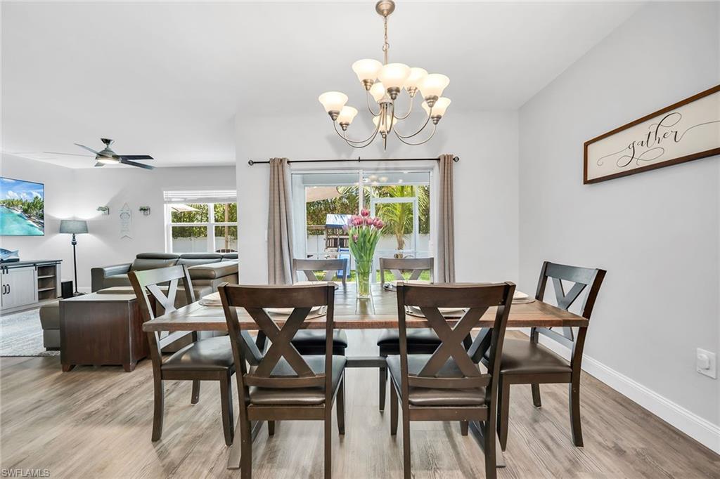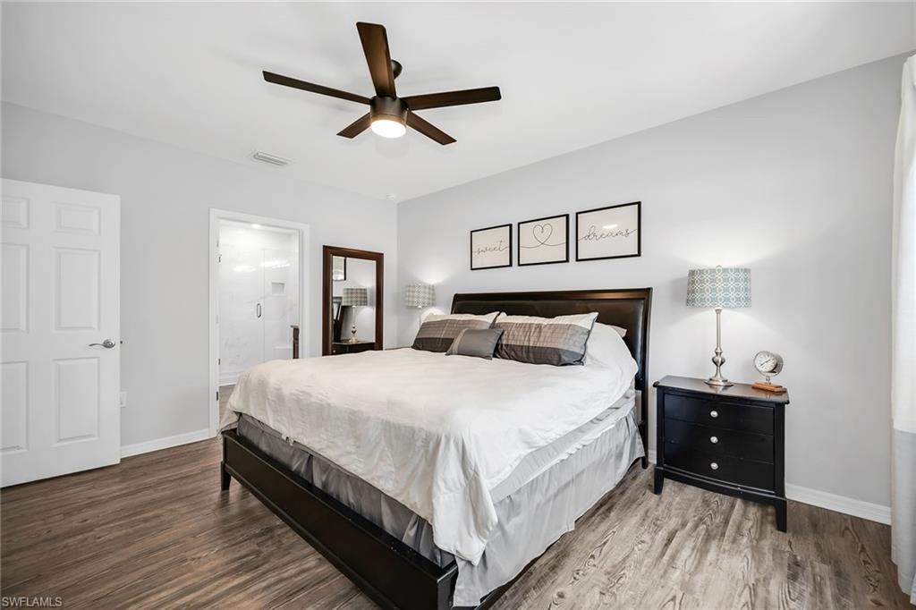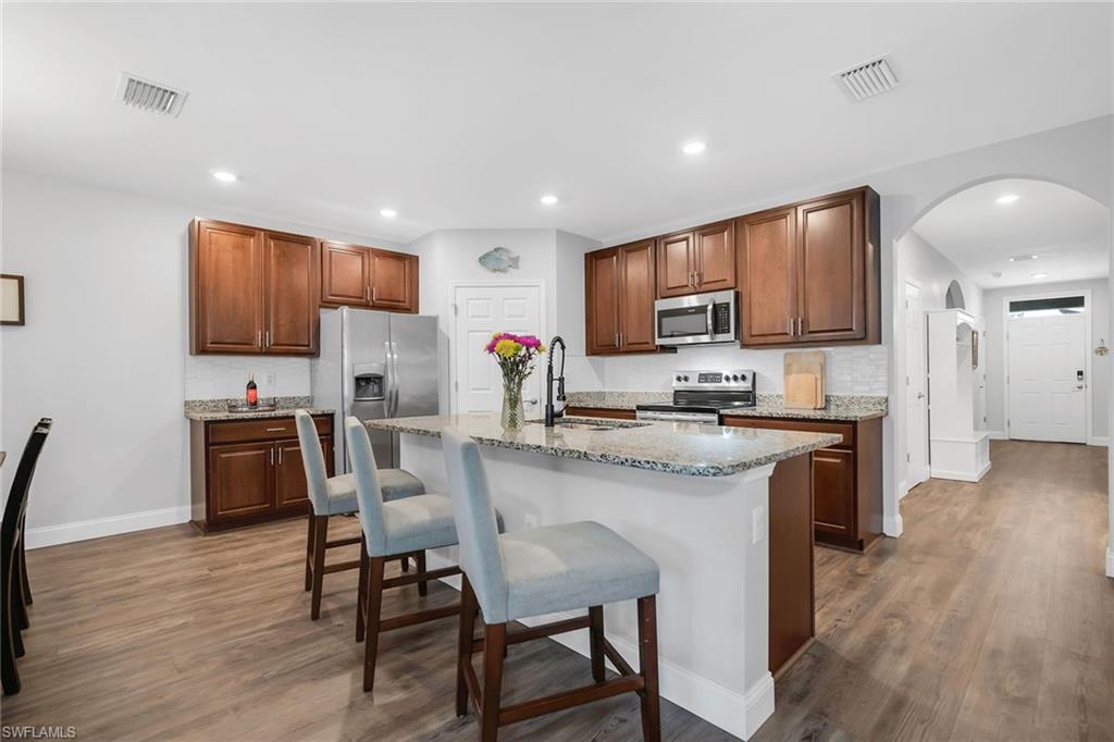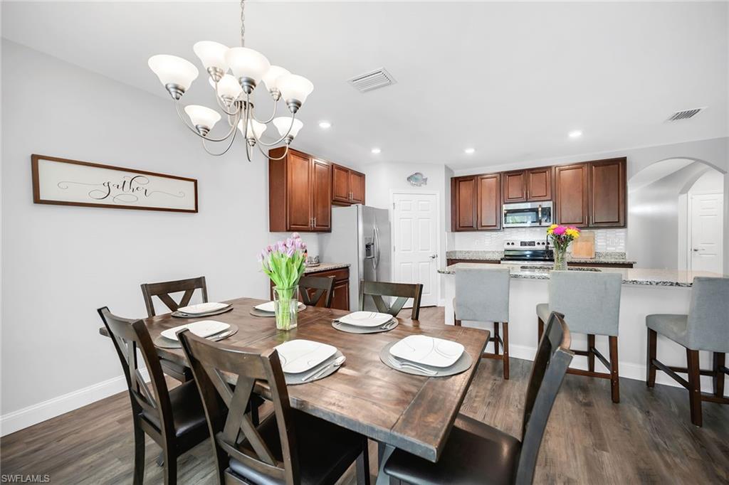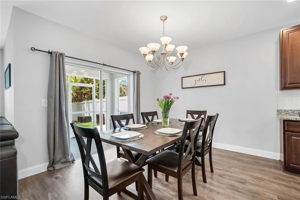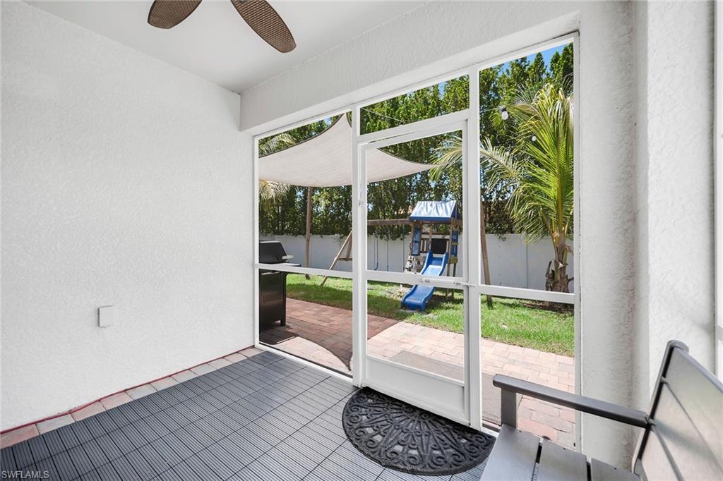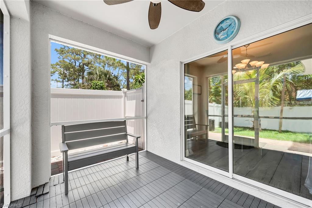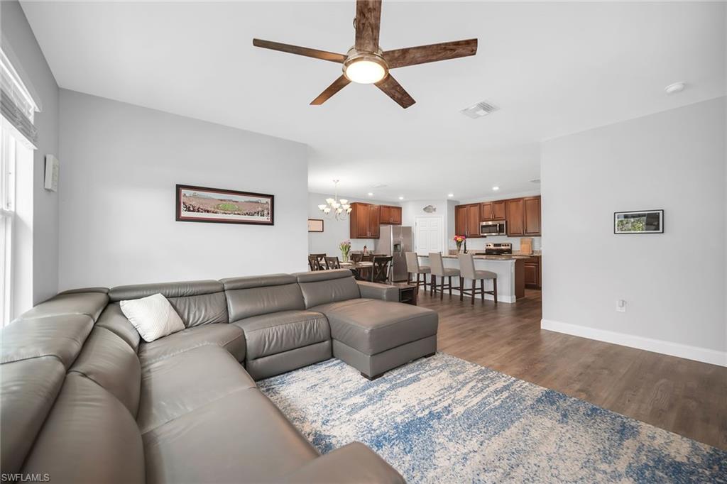 At end of a quiet cul-de-sac with desirable western exposure, this four-bedroom, two-bath home offers privacy, convenience and a prime Naples location. Tucked in a well-kept secret neighborhood with low HOA fees, the home is just minutes from Interstate 75, downtown Naples, Marco Island and the Gulf’s white sand beaches, providing easy access to city amenities and coastal escapes. The fully fenced backyard is surrounded by lush landscaping and features a large grassy area that offers exceptional privacy, ideal for outdoor activities, pets or peaceful relaxation. Inside, arched walkways and laminate flooring add charm and character throughout. The open kitchen is equipped with shaker-style cabinetry, a tile backsplash, recessed lighting, a center island with breakfast counter, pantry and stainless steel appliances including a range, microwave, dishwasher and refrigerator with icemaker. The dining area connects to the living room and opens to the screened lanai and modest brick paver patio, ideal for casual barbecues or relaxing at sunset. The primary suite includes two walk-in closets with built-in shelving and a spa-like bath with dual vanities, a walk-in shower with bench, floor-to-ceiling tile, and a frameless glass enclosure. Three guest bedrooms share a well-appointed bath with a shower tub combo. Additional features include a laundry room with overhead cabinetry, a two-car garage and manual hurricane shutters. Near Palm Springs Park—with its playground, disc golf course and fishing pond—and just around the corner from a local bowling alley, this home is made for active families and outdoor enthusiasts.