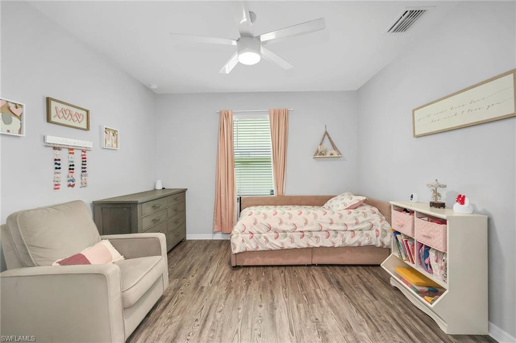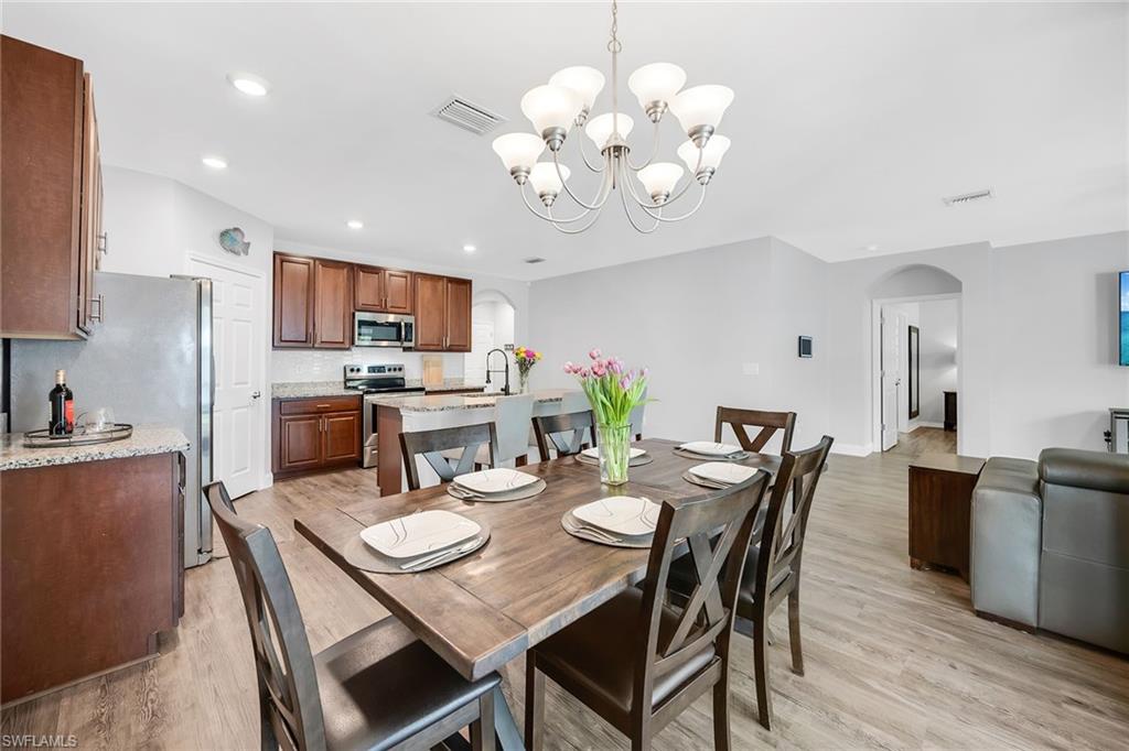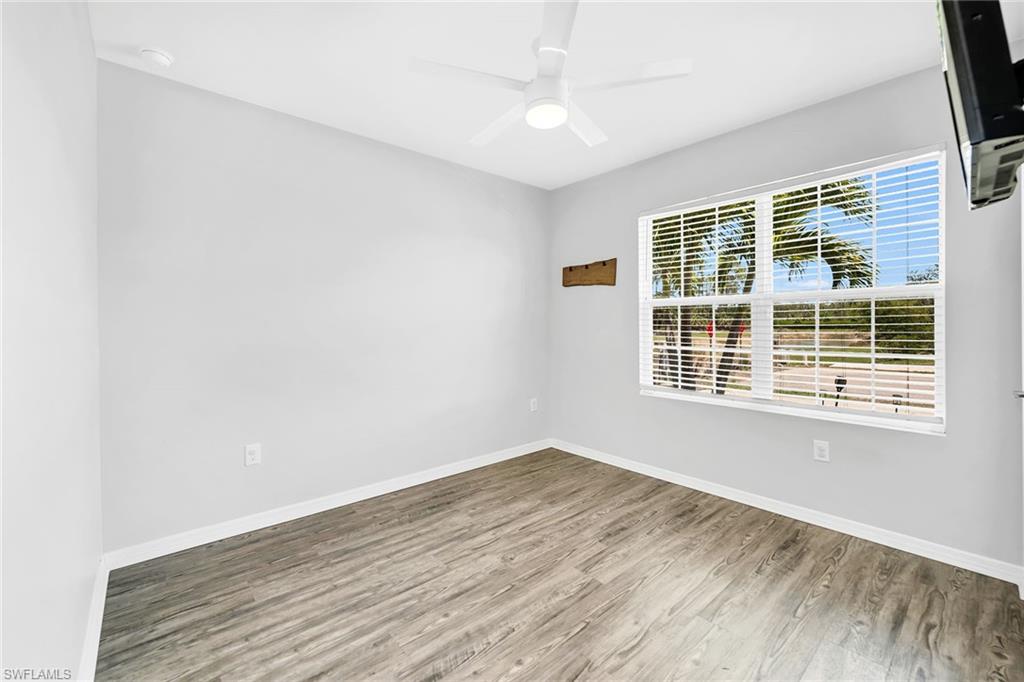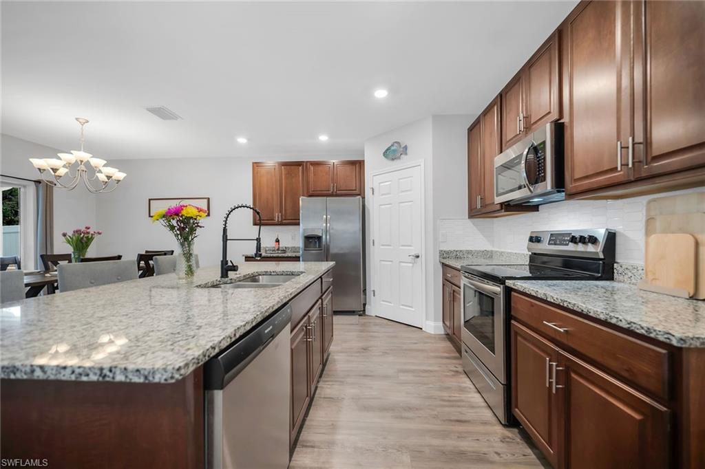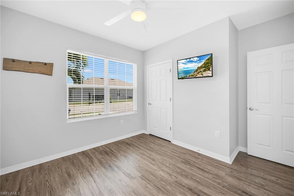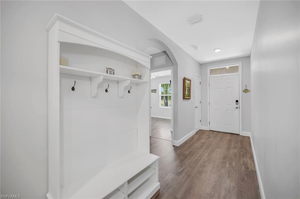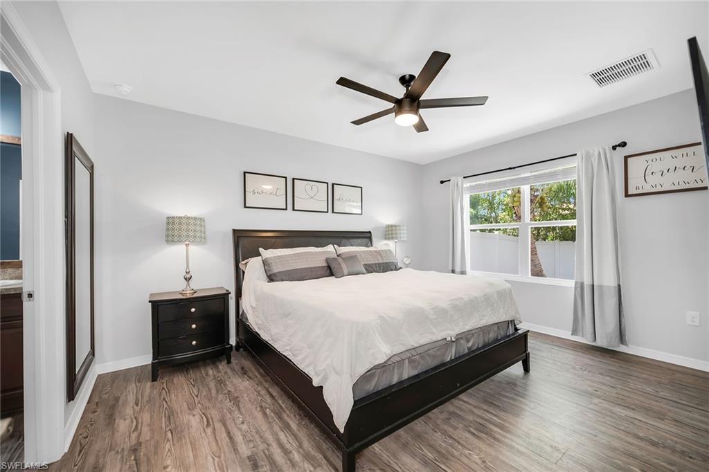 At end of a quiet cul-de-sac with desirable western exposure, this four-bedroom, two-bath home offers privacy, convenience and a prime Naples location. Tucked in a well-kept secret neighborhood with low HOA fees, the home is just minutes from Interstate 75, downtown Naples, Marco Island and the Gulf’s white sand beaches, providing easy access to city amenities and coastal escapes. The fully fenced backyard is surrounded by lush landscaping and features a large grassy area that offers exceptional privacy, ideal for outdoor activities, pets or peaceful relaxation. Inside, arched walkways and laminate flooring add charm and character throughout. The open kitchen is equipped with shaker-style cabinetry, a tile backsplash, recessed lighting, a center island with breakfast counter, pantry and stainless steel appliances including a range, microwave, dishwasher and refrigerator with icemaker. The dining area connects to the living room and opens to the screened lanai and modest brick paver patio, ideal for casual barbecues or relaxing at sunset. The primary suite includes two walk-in closets with built-in shelving and a spa-like bath with dual vanities, a walk-in shower with bench, floor-to-ceiling tile, and a frameless glass enclosure. Three guest bedrooms share a well-appointed bath with a shower tub combo. Additional features include a laundry room with overhead cabinetry, a two-car garage and manual hurricane shutters. Near Palm Springs Park—with its playground, disc golf course and fishing pond—and just around the corner from a local bowling alley, this home is made for active families and outdoor enthusiasts.