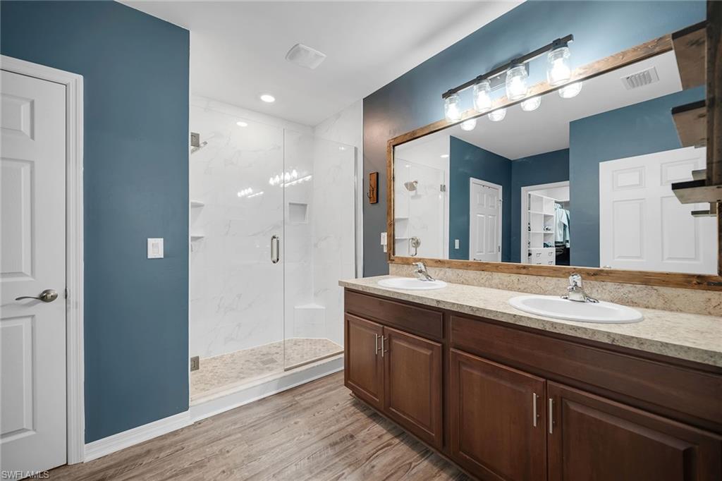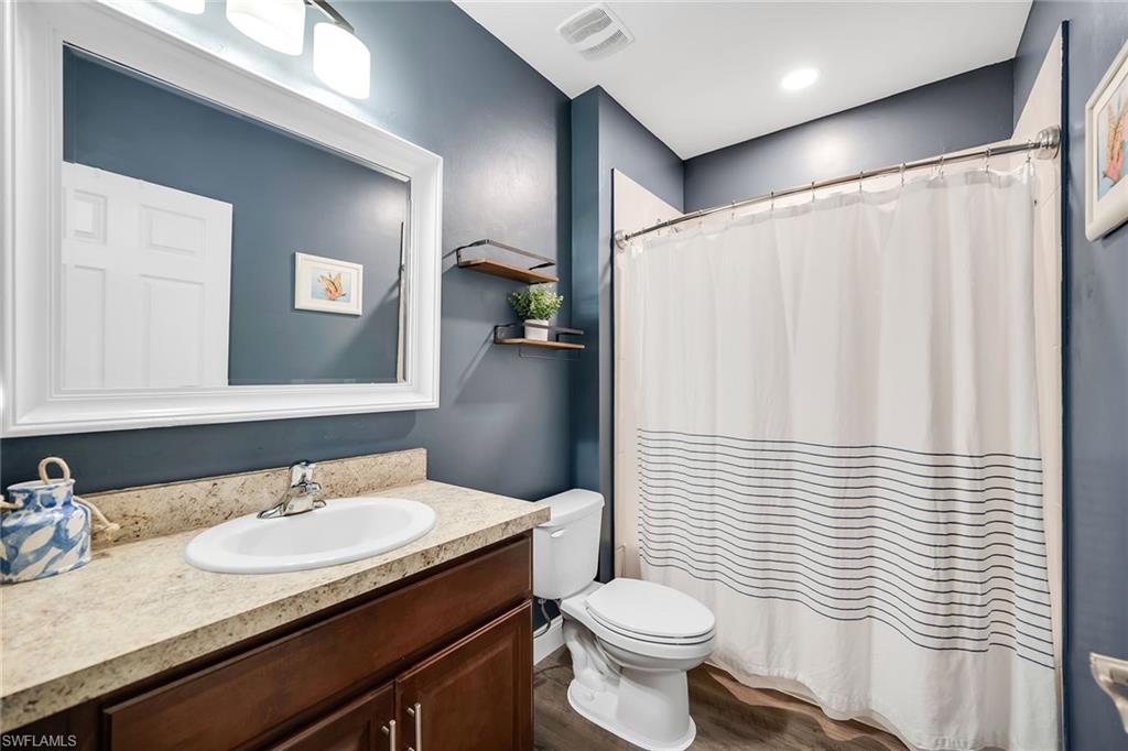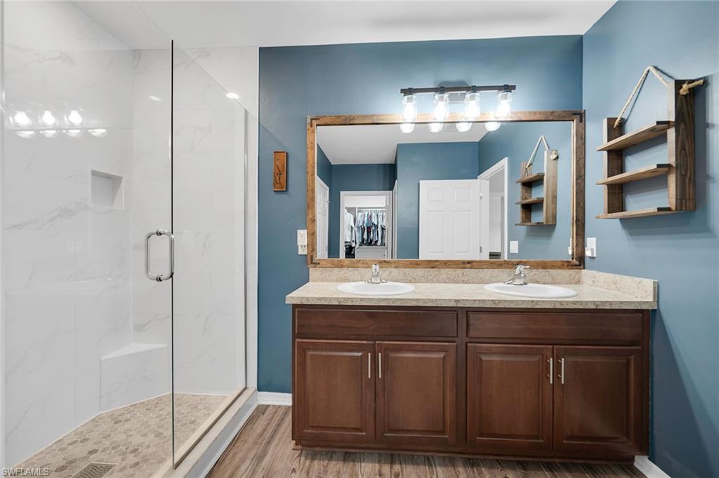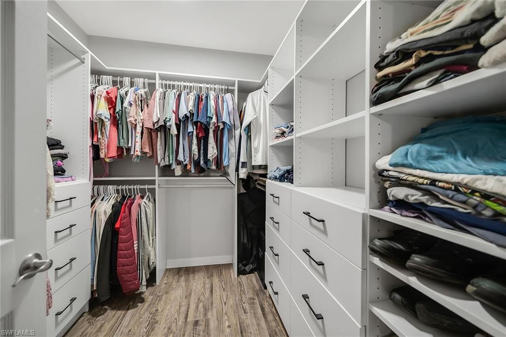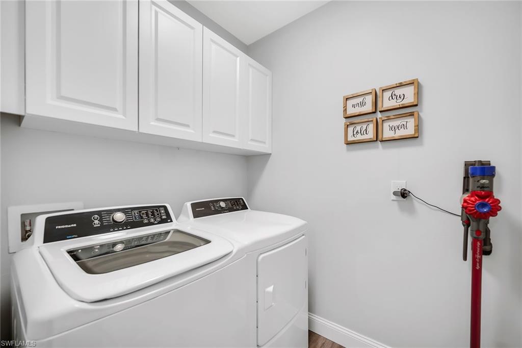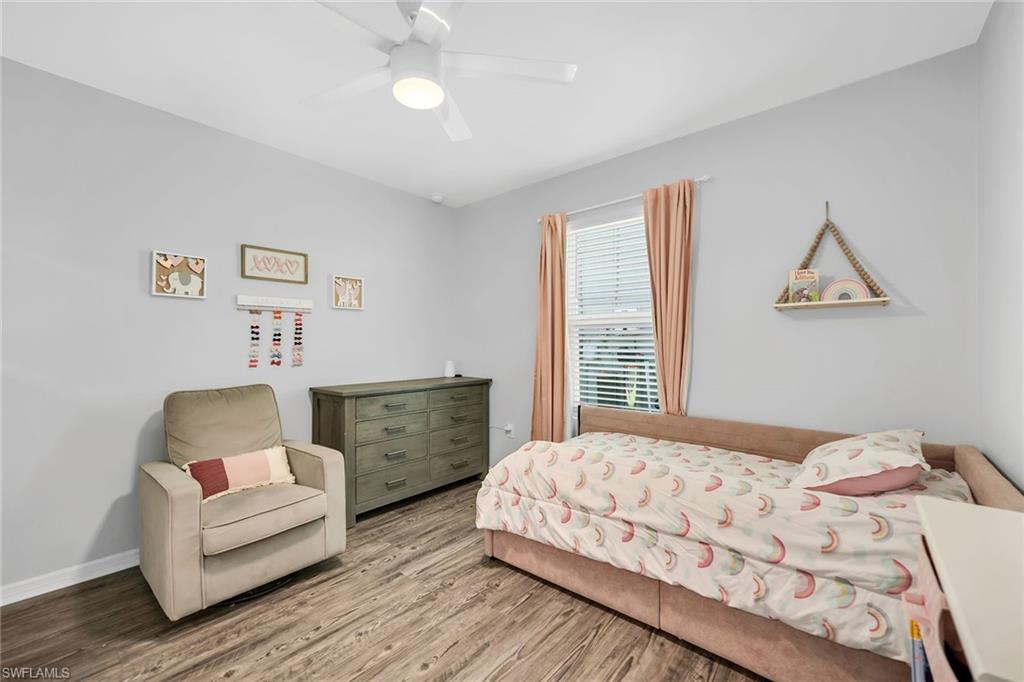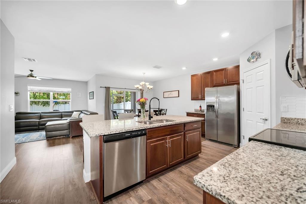 At end of a quiet cul-de-sac with desirable western exposure, this four-bedroom, two-bath home offers privacy, convenience and a prime Naples location. Tucked in a well-kept secret neighborhood with low HOA fees, the home is just minutes from Interstate 75, downtown Naples, Marco Island and the Gulf’s white sand beaches, providing easy access to city amenities and coastal escapes. The fully fenced backyard is surrounded by lush landscaping and features a large grassy area that offers exceptional privacy, ideal for outdoor activities, pets or peaceful relaxation. Inside, arched walkways and laminate flooring add charm and character throughout. The open kitchen is equipped with shaker-style cabinetry, a tile backsplash, recessed lighting, a center island with breakfast counter, pantry and stainless steel appliances including a range, microwave, dishwasher and refrigerator with icemaker. The dining area connects to the living room and opens to the screened lanai and modest brick paver patio, ideal for casual barbecues or relaxing at sunset. The primary suite includes two walk-in closets with built-in shelving and a spa-like bath with dual vanities, a walk-in shower with bench, floor-to-ceiling tile, and a frameless glass enclosure. Three guest bedrooms share a well-appointed bath with a shower tub combo. Additional features include a laundry room with overhead cabinetry, a two-car garage and manual hurricane shutters. Near Palm Springs Park—with its playground, disc golf course and fishing pond—and just around the corner from a local bowling alley, this home is made for active families and outdoor enthusiasts.