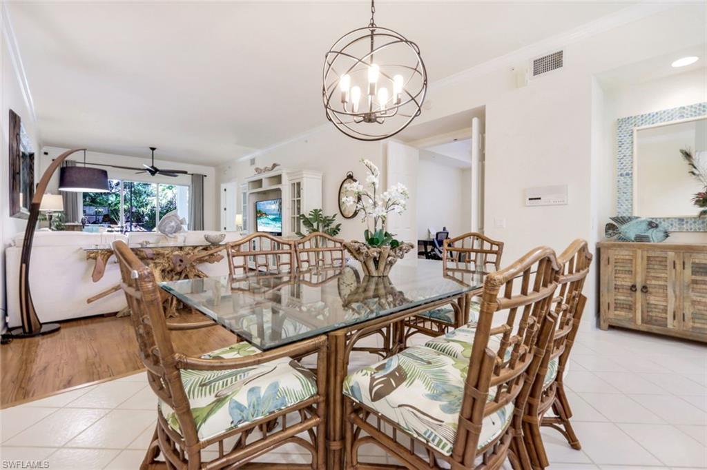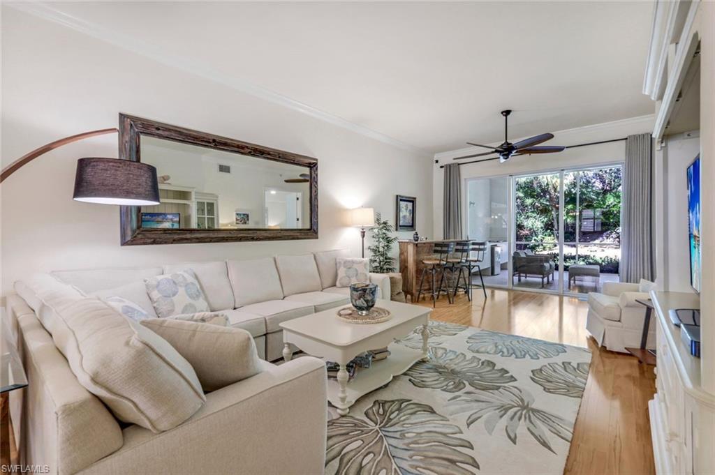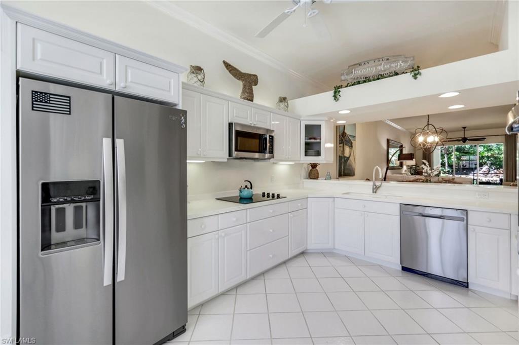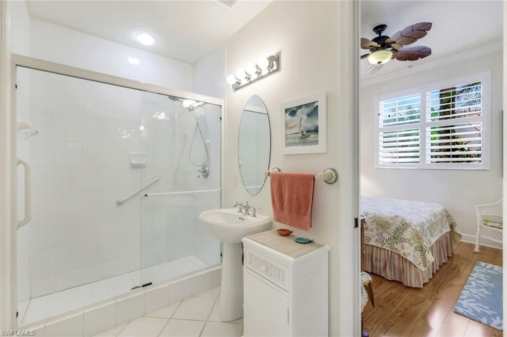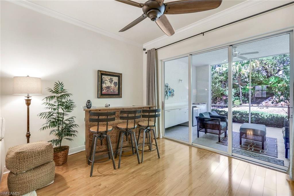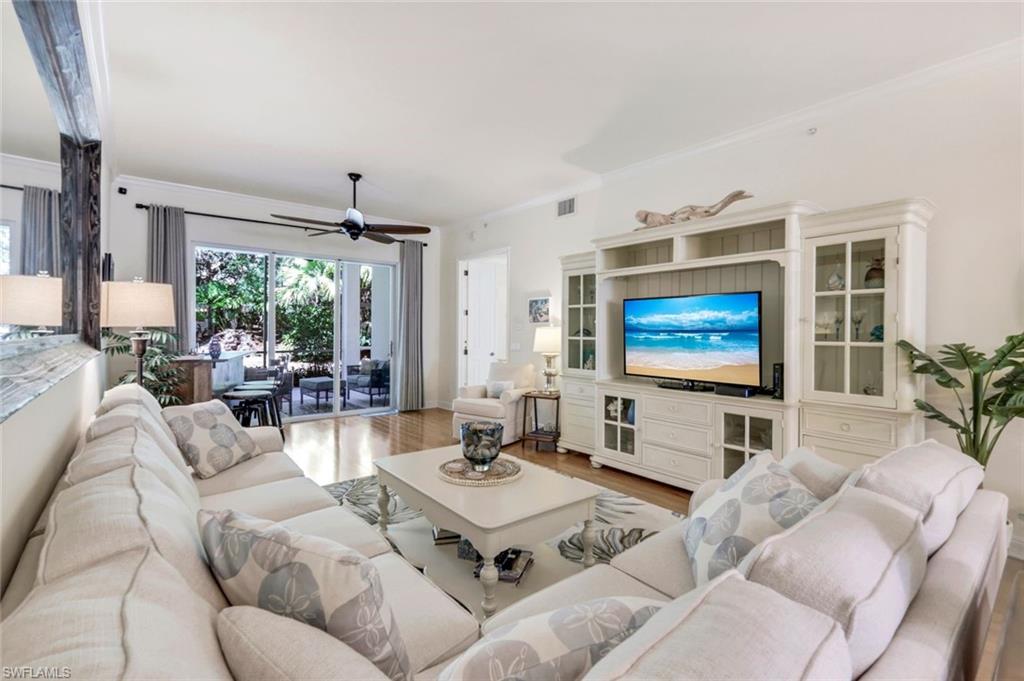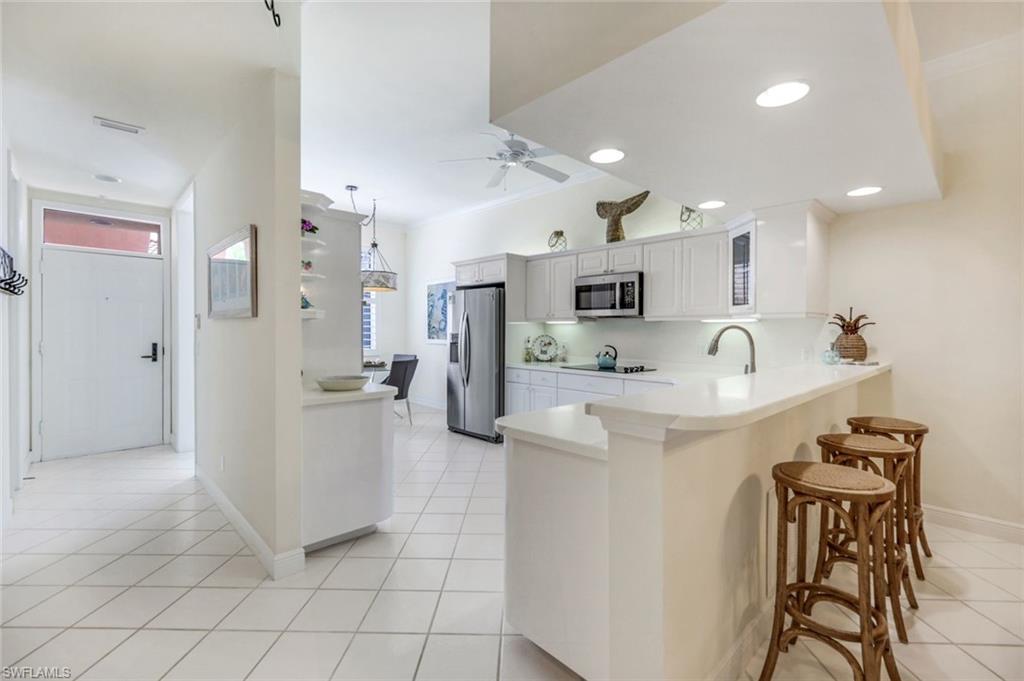 Gorgeous, and REDUCED!!! Nestled in the very private and upscale Water Crest section of Falling Waters, this stunning downstairs, 3-bedroom 2 bath home is ready for you immediately. Offered TURNKEY FURNISHED, you can start living the Naples dream and head to the beach! This end unit bathes you in light all day and provides a serene view of one of the many waterfalls. As you enter this home, you are greeted with a crisp white pallet and a kitchen to match. Stainless steel appliances, with eye level built in oven, spacious cabinetry with desk, plantation shutters throughout and gleaming white tile on the diagonal complete this chef’s delight. All new light vinyl flooring is featured in the living room, and all bedrooms. Accessing the second bedroom is the second bath featuring a walk-in shower with a lovely pedestal sink. The den currently functions as an office with sectional seating but can be easily turned into another true bedroom. The master suite features French doors to the lanai, and the adjacent large master bath has a huge soaking tub, walk in shower, and massive closet. Double sinks and a makeup area for the ladies completes this picture. The living and dining room area is one of the largest Falling Waters offers, with the entire unit encompassing 1860 sq. ft. With views out to the lanai, you will enjoy cooking on your outdoor grill and fetching a beverage from your patio refrigerator. ALL THIS AND NO POLYBUTYLENE PLUMBING!!!!! Additional parking for guests is just steps from your front door, along with access to your garage. Falling Waters provides you with the best amenities and has one of the largest community pools in Naples. Don’t miss this gem!