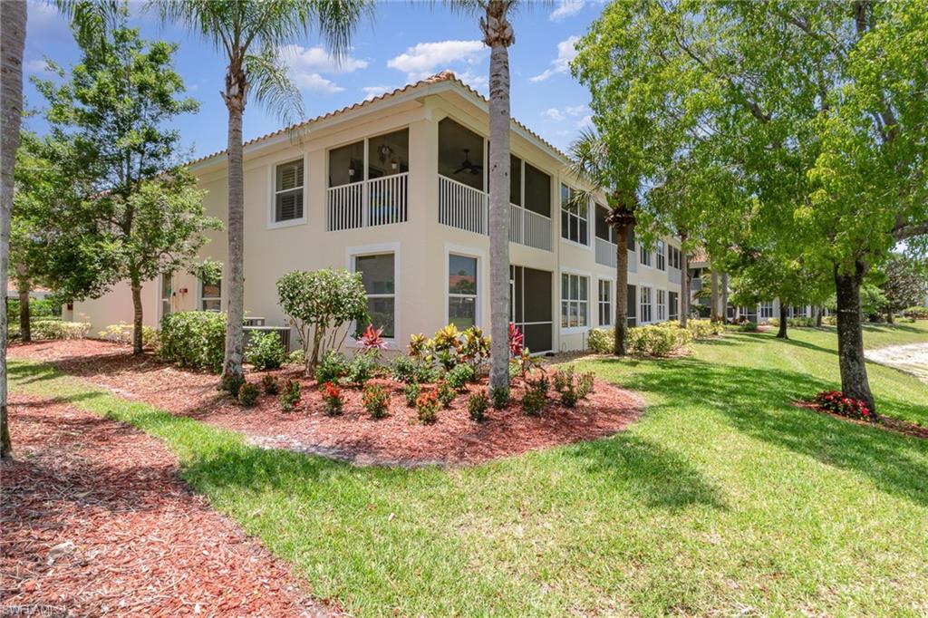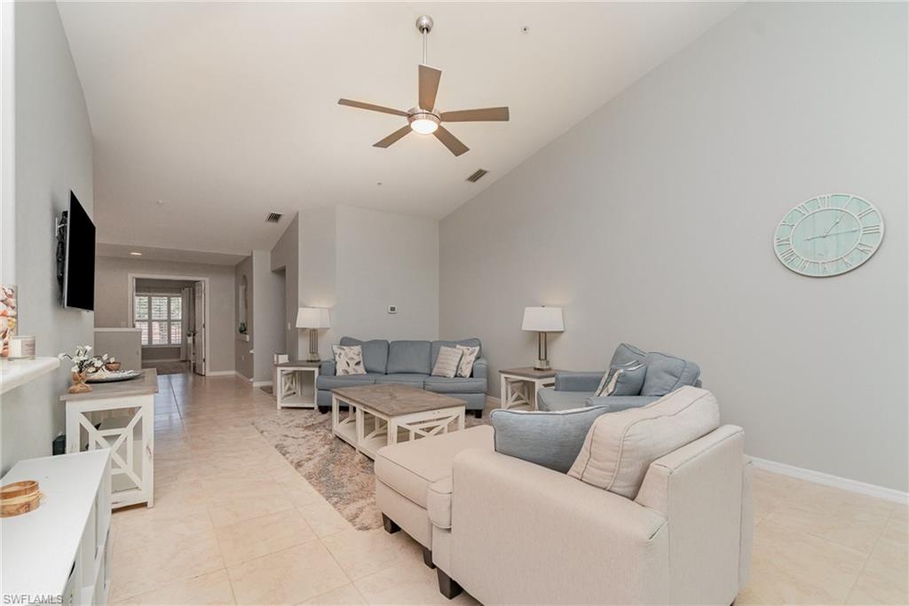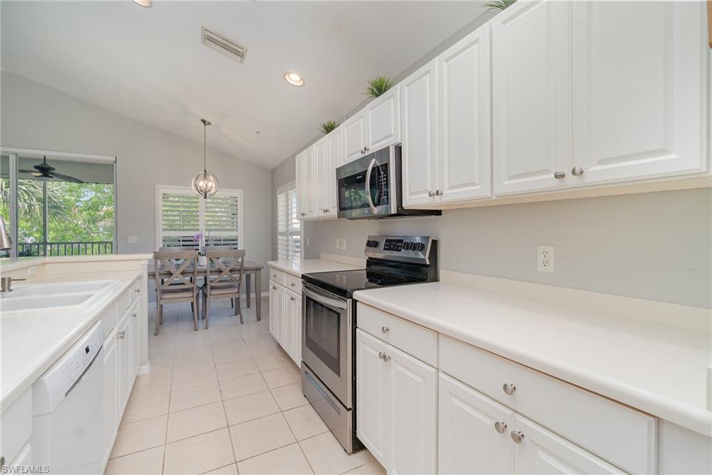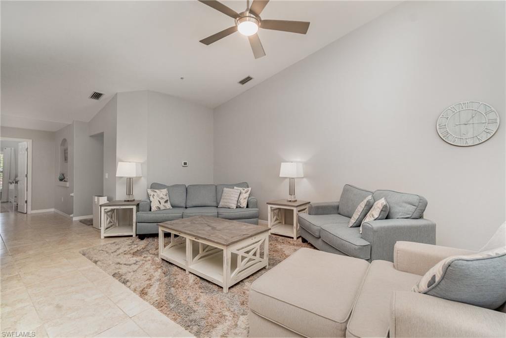 One of the MOST AFFORDABLE, UPDATED CONDOS IN THE ENTIRE ZIP CODE! Come visit us in the ever-so-desirable Coventry at Stratford Place where you will step into the “Spoonbill Model,” the BEST FLOOR PLAN in this GATED community. Boasting nearly 1800 sq ft., this END UNIT condo sports 2 bedrooms, 2 full bathrooms plus a flex den/bedroom/playroom/media/exercise room w French doors. (Third bedroom is non-conforming.) Also includes an oversized 1-car ATTACHED GARAGE with 2 EXTRA exterior garage spots (so 3-CAR SPOTS!) on a paver driveway, making it easy for your guests to visit. MASSIVE GREAT ROOM and huge dining room that could easily be converted into an office/conversation room/flex space. Enjoy your peaceful morning coffee, yoga and readings out on the GIANT PRIVATE LANAI -- also fun to host game night & BBQS -- or overlooking the pretty lake and nature preserve. This spacious, OPEN FLOOR PLAN exudes HAPPINESS with so much NATURAL LIGHT and WINDOWS GALORE. Bright white kitchen includes NEW stainless appliances, white corian countertops, cozy breakfast nook and reach-in pantry. Master bathroom features dual vanities, a BRAND NEW impressive walk-in shower, large walk-in closet, linen closet. Awesome tile throughout for easy cleaning after a fun day at the beach. PET FRIENDLY. Condo is located directly across from the community pool and mailbox center. Everything is white light and bright! As you enter into the condo, the first response by everyone is "wow, it's HUGE! and I love the high vaulted ceilings." ALL APPLIANCES REMAIN (except for garage freezer/fridge). NEWER mechanicals: HVAC 2020 and water heater 2017. INQUIRE FOR A PRIVATE SHOWING. NOTE: Buyers should verify all information represented in the MLS to guarantee accuracy. HOA dues of $1497 include Xfinity cable & internet, water, pest control, trash as well as lawn maintenance and irrigation to ensure a carefree and convenient lifestyle. Unit may not be leased in the first 12 months of ownership. The community feels likes a resort-style setting with beautifully-maintained, lush landscaping and useful amenities such as its swimming pool, spa, basketball court, bike & jog path. LOCATION: Located just East of Pine Ridge Rd and Airport Pulling, you are in walking distance to an abundance of shops, dining, and entertainment venues. Just minutes to I 75 highway, Stratford Place is a central Naples’ location to top schools, the Gulf of America pristine shores and beaches, incredible shopping, awesome restaurants and in close proximity to downtown 5th Avenue, Bayfront, Tin City, Venetian Village, Mercato Shopping Center, Vanderbilt Shoppes, Isle of Capris, Marco Island and just 20 minutes from SWFL International Airport. How blessed to have the opportunity to live in our sunny Southwest Florida weather and also take advantage of our State’s financial benefits!
