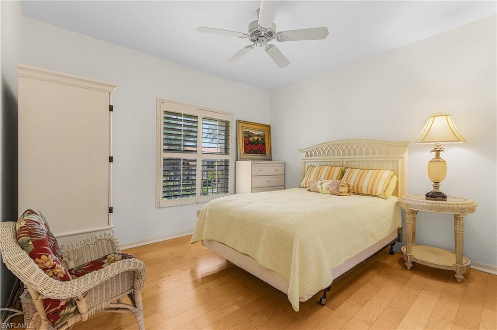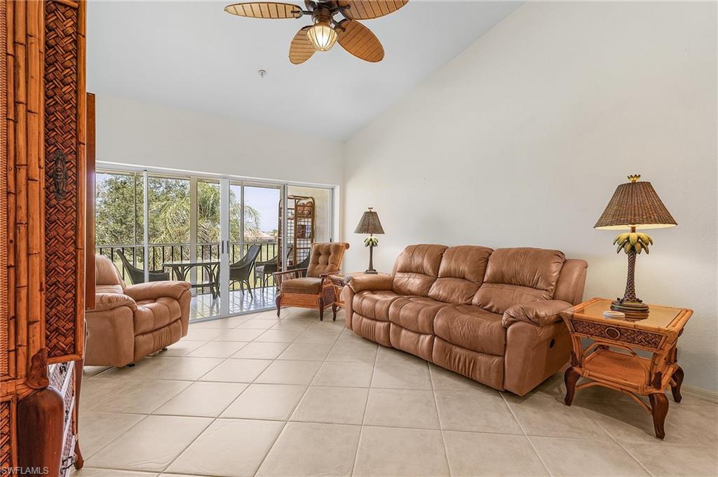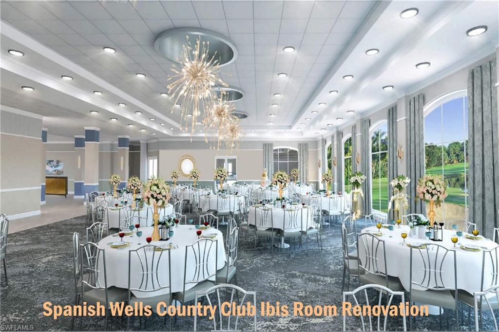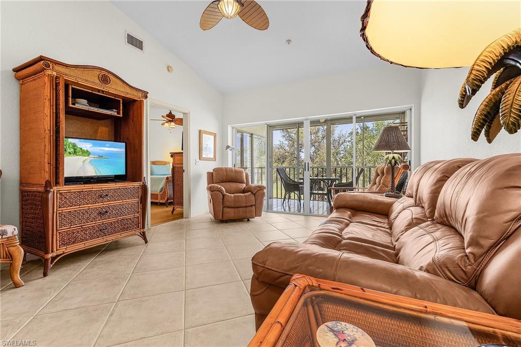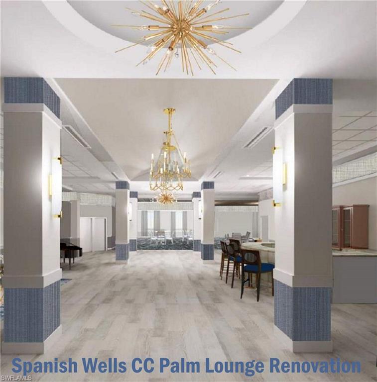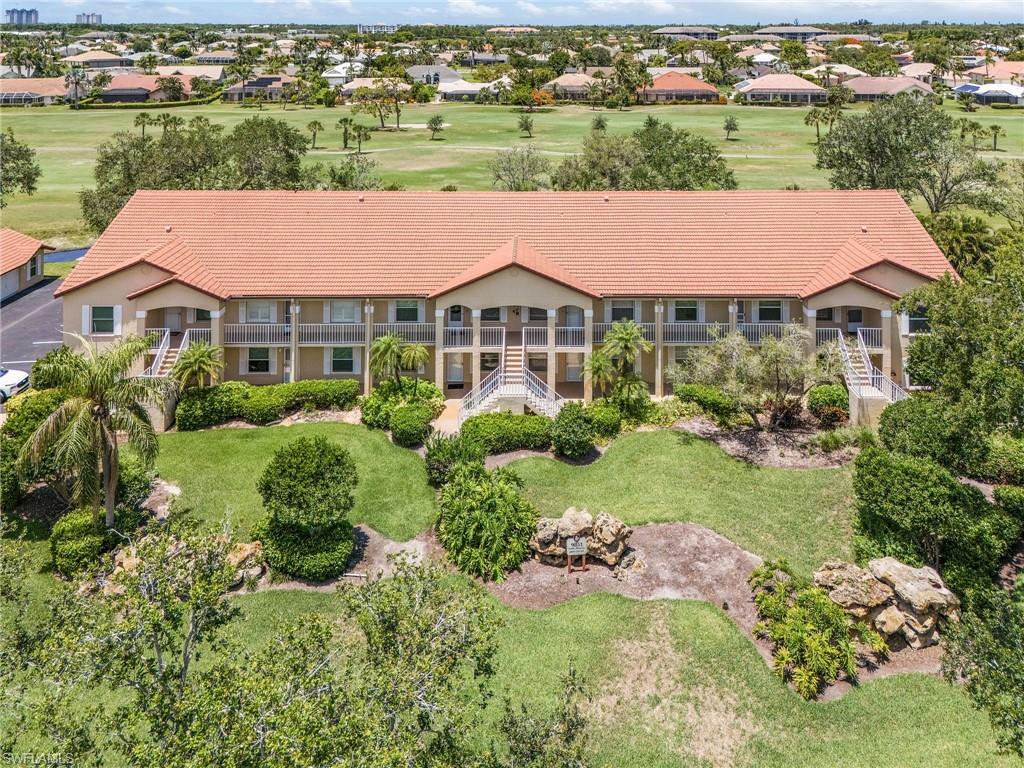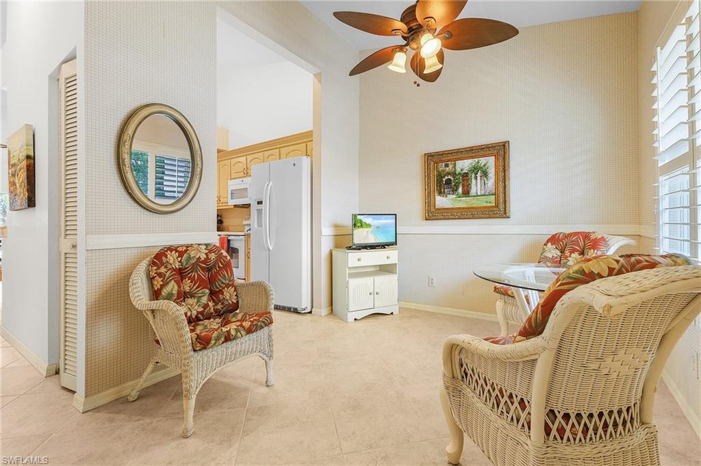 A room with a view. This lanai overlooks two fairways and you can watch the sunset in the evenings. You like to play golf? You are in luck as this condo not only comes with a one car garage, but its own golf cart garage for your private golf cart or just extra storage. This lovely 2 bedroom 2 bath condo has high vaulted ceilings and lovely tile floors on the diagonal and wood look laminate in the bedrooms. Don't worry about the summer storms as the windows are all impact resistant and the lanai has hurricane shutters. The condo has lovely plantation shutters on the windows.The dinette/sitting area could also be used as a home office area. The master shower has bee redone and the hall bath vanity has been replaced. The condo pool is just a few steps away and the location cannot be duplicated! 3 miles to Barefoot Beach and Bonita Beach, 3 miles to I75 and just a quick 20 minute ride to the airport. There are doctors, shopping and dining just outside the gates. Membership to Spanish Wells Country Club is not required although some amenities may require one of the many levels of membership. There are 27 holes of golf and YOU DO NOT have to be a member to play golf even during season. Spanish Wells is a great community with low fees and 24 hour security. Cable and Internet are included in your condo fees, so your only required bill will be your electric bill. This sale is subject to FIRPTA.