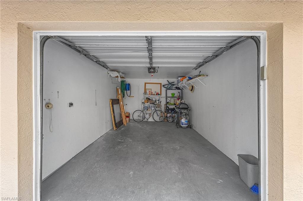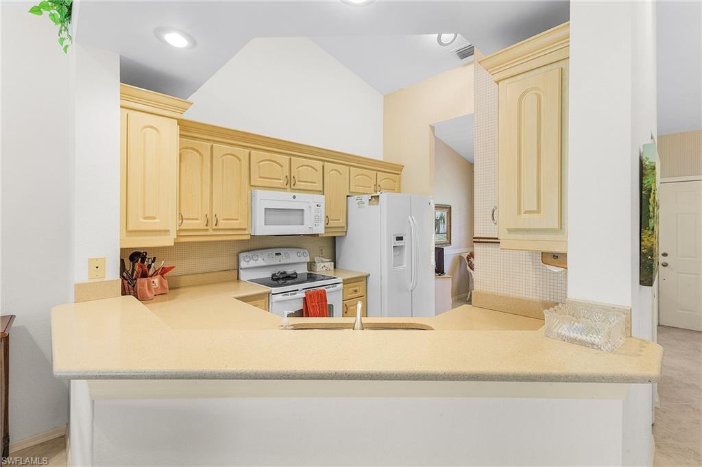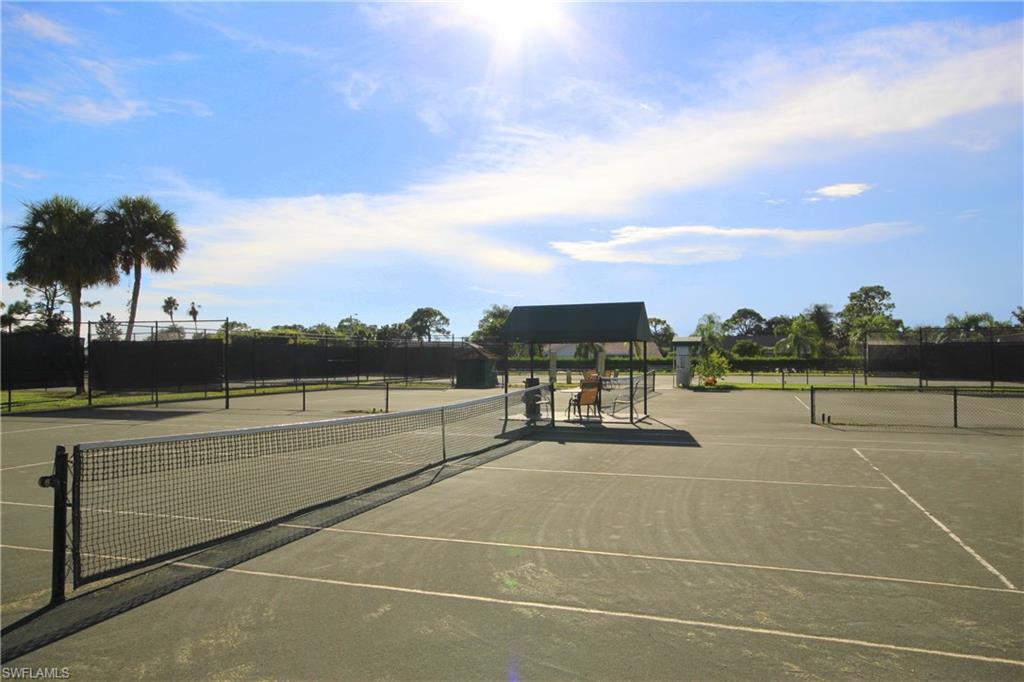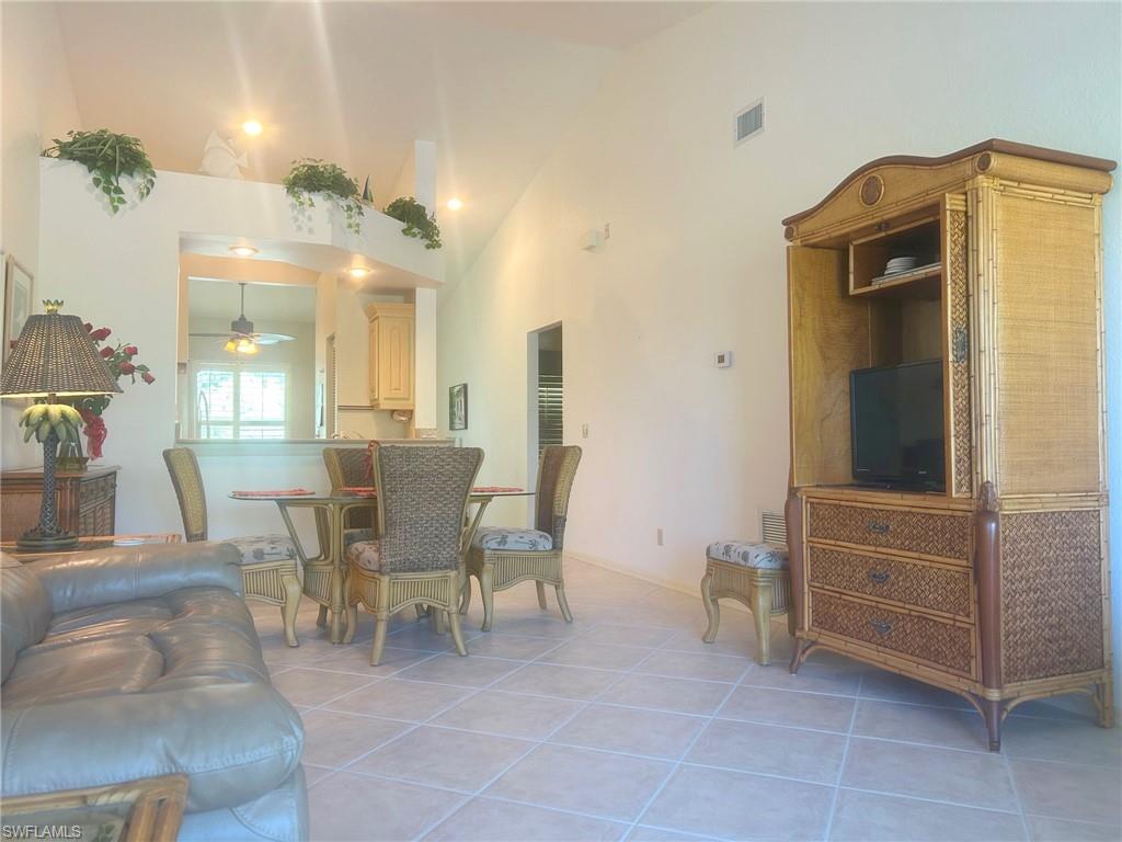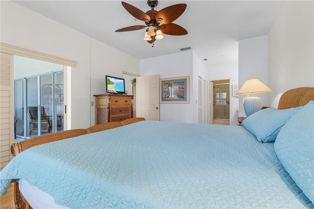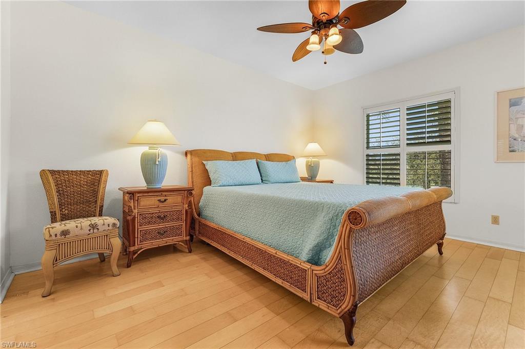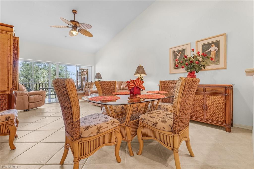 A room with a view. This lanai overlooks two fairways and you can watch the sunset in the evenings. You like to play golf? You are in luck as this condo not only comes with a one car garage, but its own golf cart garage for your private golf cart or just extra storage. This lovely 2 bedroom 2 bath condo has high vaulted ceilings and lovely tile floors on the diagonal and wood look laminate in the bedrooms. Don't worry about the summer storms as the windows are all impact resistant and the lanai has hurricane shutters. The condo has lovely plantation shutters on the windows.The dinette/sitting area could also be used as a home office area. The master shower has bee redone and the hall bath vanity has been replaced. The condo pool is just a few steps away and the location cannot be duplicated! 3 miles to Barefoot Beach and Bonita Beach, 3 miles to I75 and just a quick 20 minute ride to the airport. There are doctors, shopping and dining just outside the gates. Membership to Spanish Wells Country Club is not required although some amenities may require one of the many levels of membership. There are 27 holes of golf and YOU DO NOT have to be a member to play golf even during season. Spanish Wells is a great community with low fees and 24 hour security. Cable and Internet are included in your condo fees, so your only required bill will be your electric bill. This sale is subject to FIRPTA.
