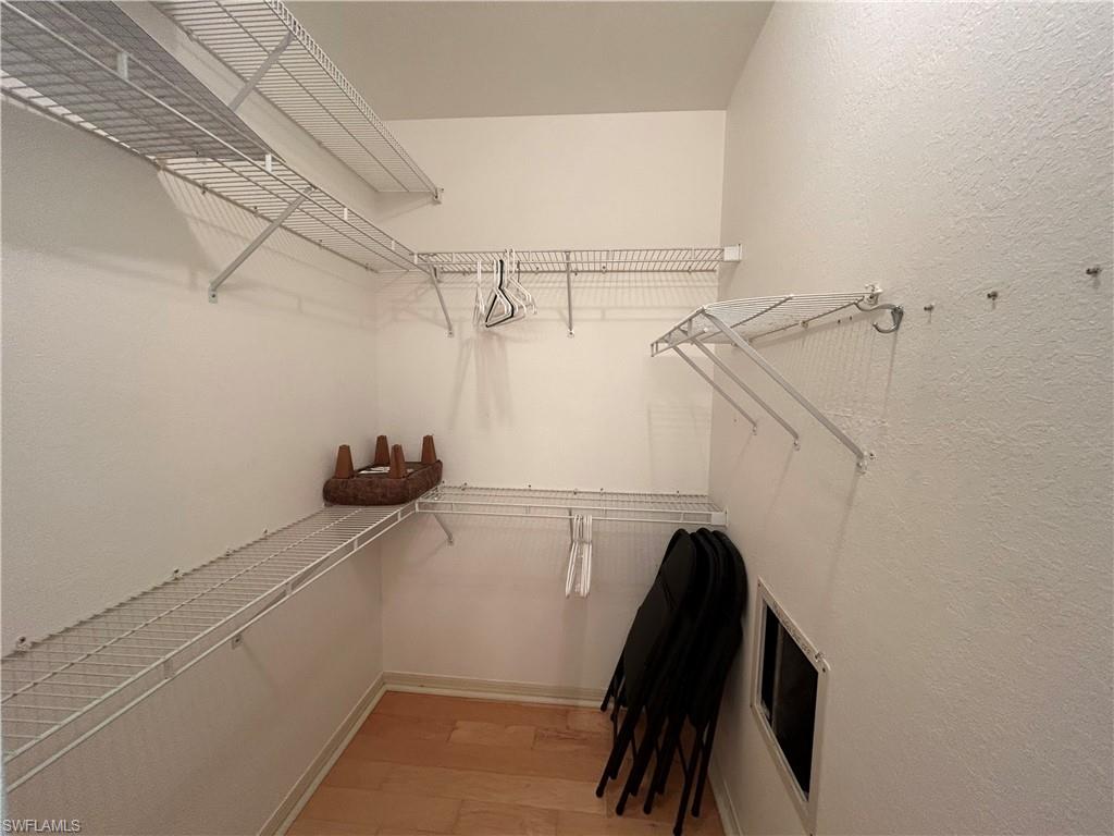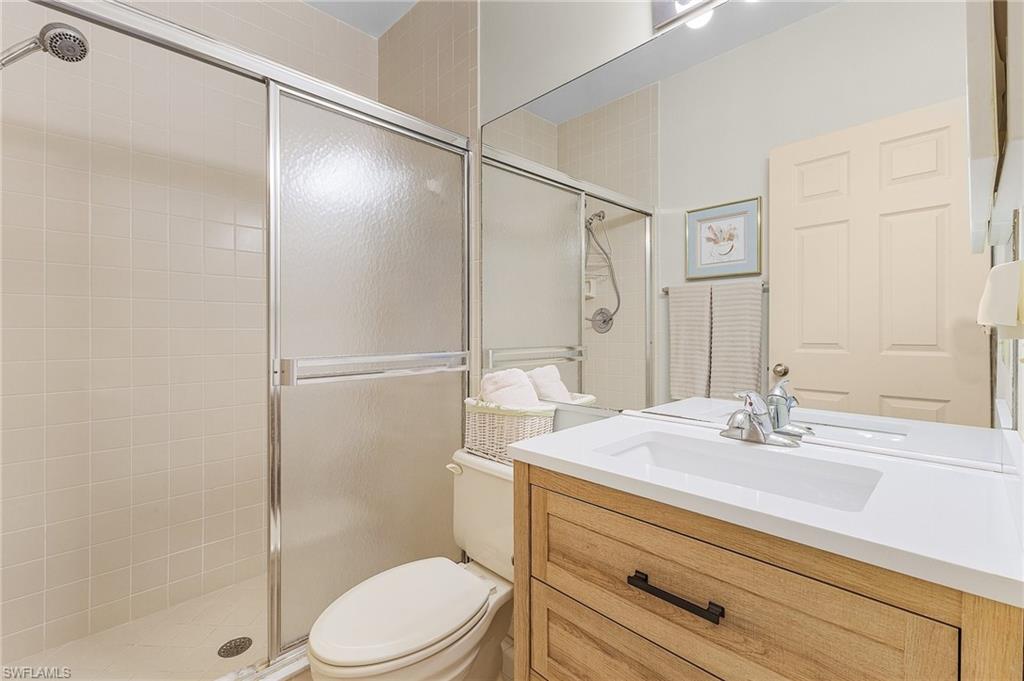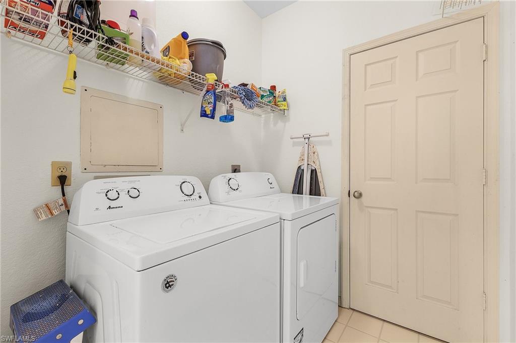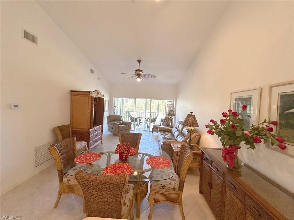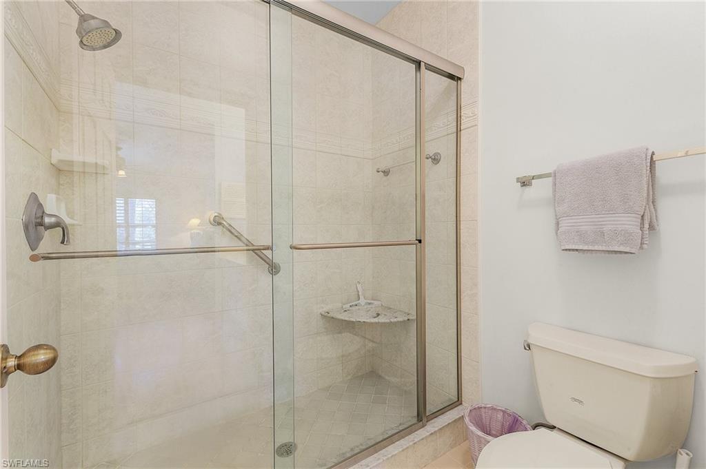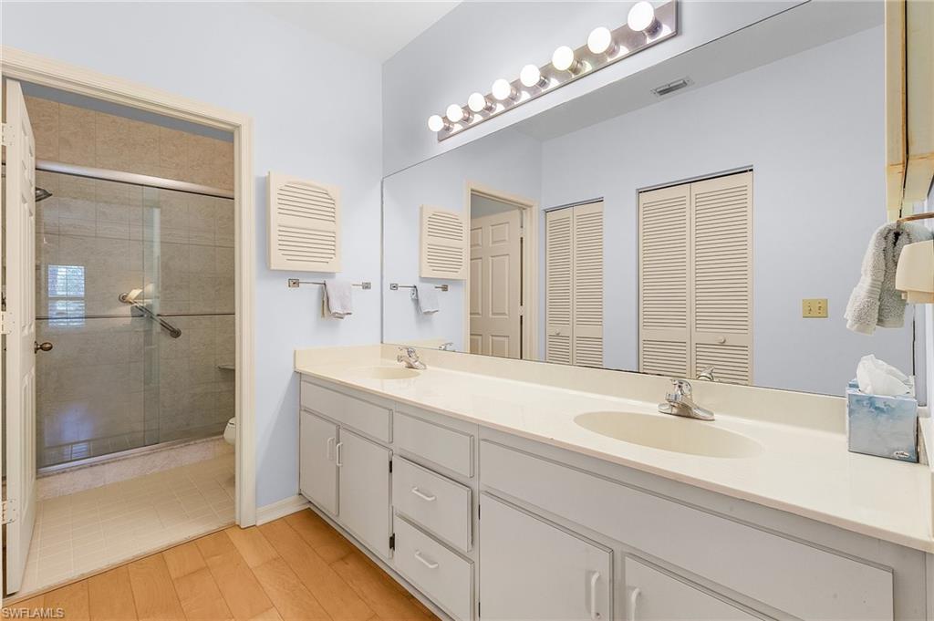 A room with a view. This lanai overlooks two fairways and you can watch the sunset in the evenings. You like to play golf? You are in luck as this condo not only comes with a one car garage, but its own golf cart garage for your private golf cart or just extra storage. This lovely 2 bedroom 2 bath condo has high vaulted ceilings and lovely tile floors on the diagonal and wood look laminate in the bedrooms. Don't worry about the summer storms as the windows are all impact resistant and the lanai has hurricane shutters. The condo has lovely plantation shutters on the windows.The dinette/sitting area could also be used as a home office area. The master shower has bee redone and the hall bath vanity has been replaced. The condo pool is just a few steps away and the location cannot be duplicated! 3 miles to Barefoot Beach and Bonita Beach, 3 miles to I75 and just a quick 20 minute ride to the airport. There are doctors, shopping and dining just outside the gates. Membership to Spanish Wells Country Club is not required although some amenities may require one of the many levels of membership. There are 27 holes of golf and YOU DO NOT have to be a member to play golf even during season. Spanish Wells is a great community with low fees and 24 hour security. Cable and Internet are included in your condo fees, so your only required bill will be your electric bill. This sale is subject to FIRPTA.