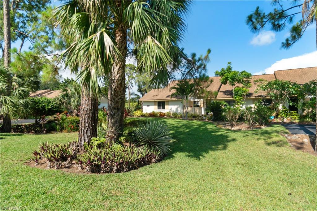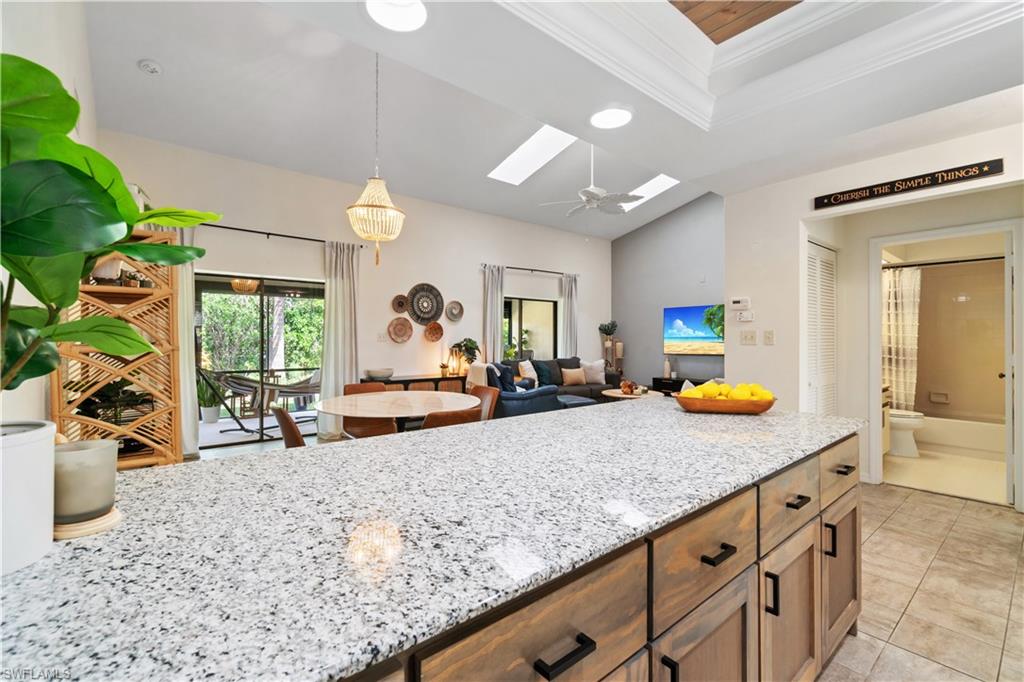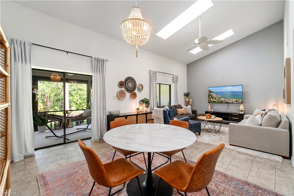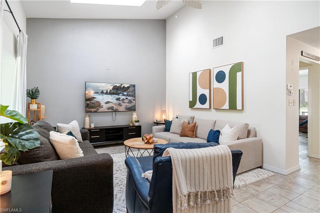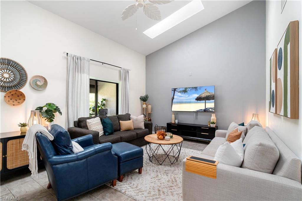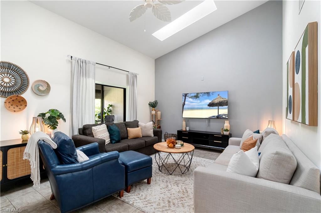 Welcome home to an enchanting residence nestled in the highly desirable community of Huntington Woods, located in the vibrant heart of Naples, Florida. This meticulously maintained end-unit villa with 2-bedroom, 2-bathroom home, complete with a dedicated oversized 2-car garage, effortlessly combines luxury, comfort, and functionality, making it ideal as a successful rental property or a delightful full-time or seasonal retreat. Upon entry, you’re instantly charmed by the thoughtfully designed open-concept floor plan, highlighted by soaring vaulted ceilings, sunlit skylights, and abundant windows that fill every room with natural light. The sophisticated living and dining spaces blend seamlessly, perfect for both relaxing and entertaining. The kitchen is a chef's delight, featuring polished granite countertops, modern stainless-steel appliances, custom cabinetry, and an exquisite wood-plank ceiling that brings warmth and elegance to the heart of the home. Unwind in the spacious primary suite, a tranquil retreat with stylish wood flooring, generous closet space, and a private en-suite bath boasting dual vanities, contemporary fixtures, and timeless finishes. The additional guest bedroom is thoughtfully appointed, ensuring privacy and comfort, accompanied by a beautifully upgraded guest bath, ideal for hosting family and friends. Step outside onto the expansive screened lanai and soak in the serene garden views, offering ample space for relaxation or entertaining. The lush, mature landscaping enhances the property’s picturesque curb appeal, setting the tone for your very own outdoor oasis. With tasteful updates throughout, this home is truly move-in ready, awaiting only your personal touches AND MOST of the FURNISHINGS ARE NEGOTIABLE. Perfectly positioned in an inviting community renowned for its charm, tranquility, and central location, you’ll enjoy proximity to Naples' pristine beaches, upscale shopping, fine dining, and numerous cultural attractions. It's also just a few minutes from Bayshore Arts district / close proximity to downtown Naples.