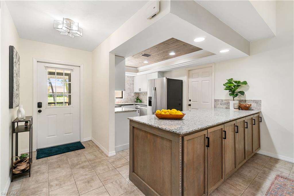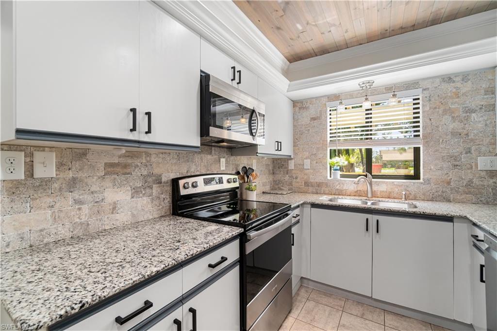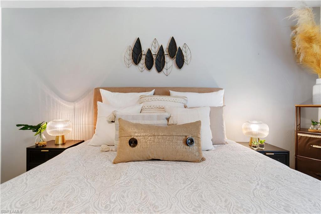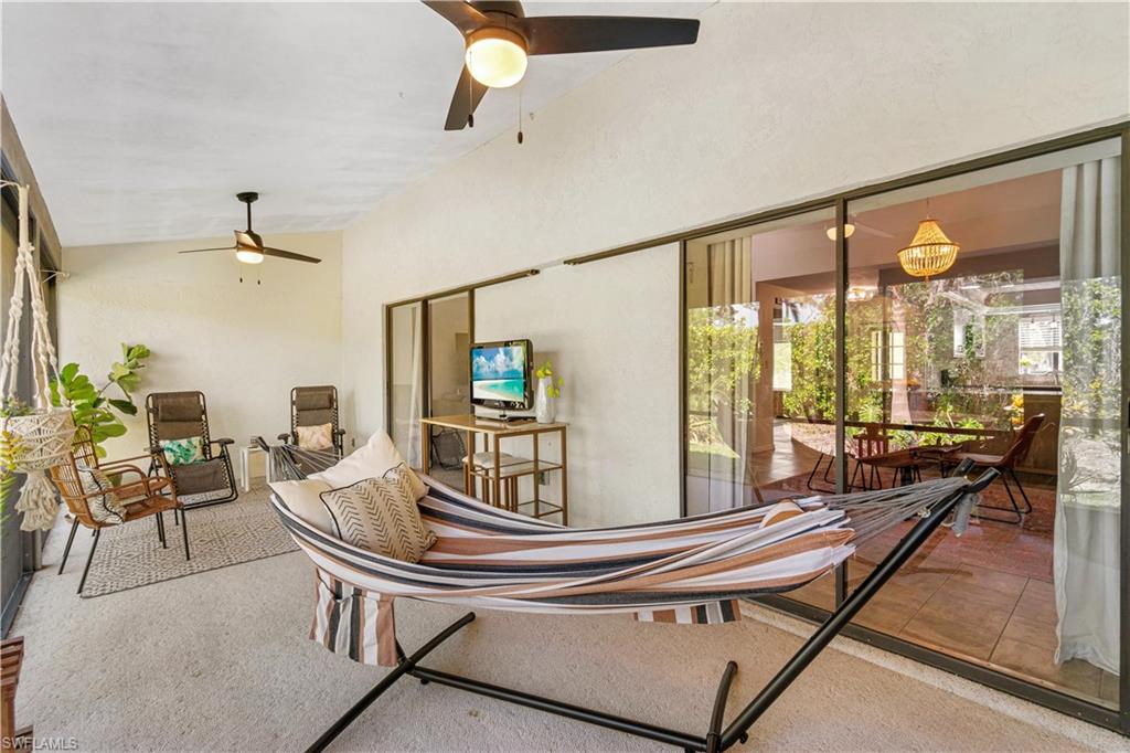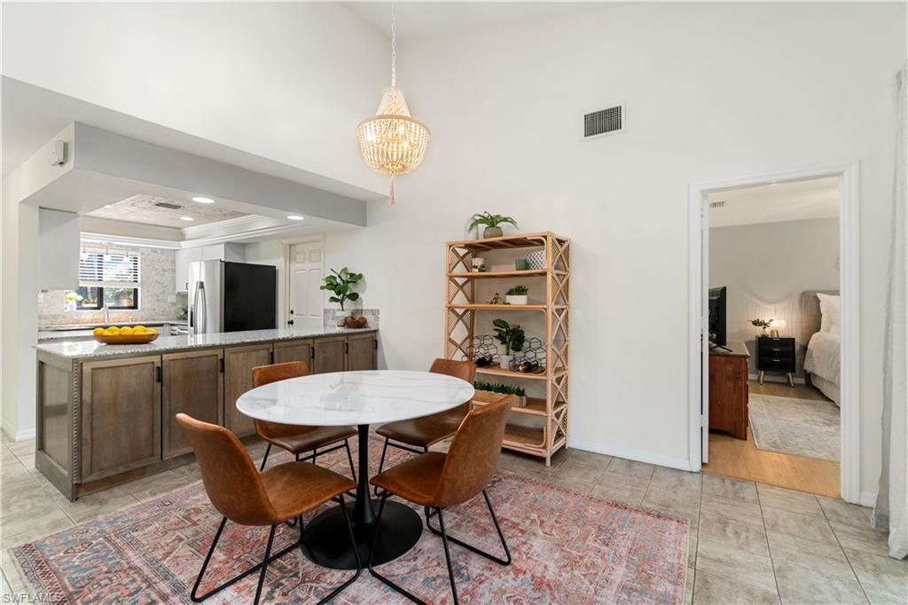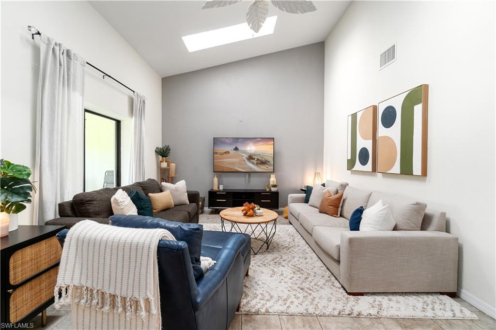 Welcome home to an enchanting residence nestled in the highly desirable community of Huntington Woods, located in the vibrant heart of Naples, Florida. This meticulously maintained end-unit villa with 2-bedroom, 2-bathroom home, complete with a dedicated oversized 2-car garage, effortlessly combines luxury, comfort, and functionality, making it ideal as a successful rental property or a delightful full-time or seasonal retreat. Upon entry, you’re instantly charmed by the thoughtfully designed open-concept floor plan, highlighted by soaring vaulted ceilings, sunlit skylights, and abundant windows that fill every room with natural light. The sophisticated living and dining spaces blend seamlessly, perfect for both relaxing and entertaining. The kitchen is a chef's delight, featuring polished granite countertops, modern stainless-steel appliances, custom cabinetry, and an exquisite wood-plank ceiling that brings warmth and elegance to the heart of the home. Unwind in the spacious primary suite, a tranquil retreat with stylish wood flooring, generous closet space, and a private en-suite bath boasting dual vanities, contemporary fixtures, and timeless finishes. The additional guest bedroom is thoughtfully appointed, ensuring privacy and comfort, accompanied by a beautifully upgraded guest bath, ideal for hosting family and friends. Step outside onto the expansive screened lanai and soak in the serene garden views, offering ample space for relaxation or entertaining. The lush, mature landscaping enhances the property’s picturesque curb appeal, setting the tone for your very own outdoor oasis. With tasteful updates throughout, this home is truly move-in ready, awaiting only your personal touches AND MOST of the FURNISHINGS ARE NEGOTIABLE. Perfectly positioned in an inviting community renowned for its charm, tranquility, and central location, you’ll enjoy proximity to Naples' pristine beaches, upscale shopping, fine dining, and numerous cultural attractions. It's also just a few minutes from Bayshore Arts district / close proximity to downtown Naples.