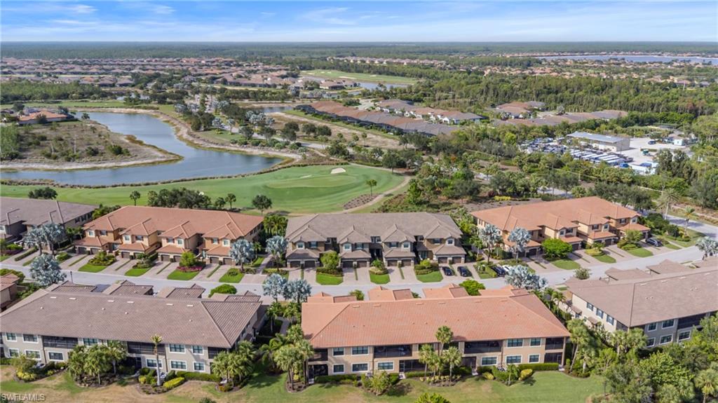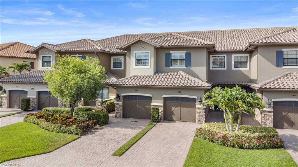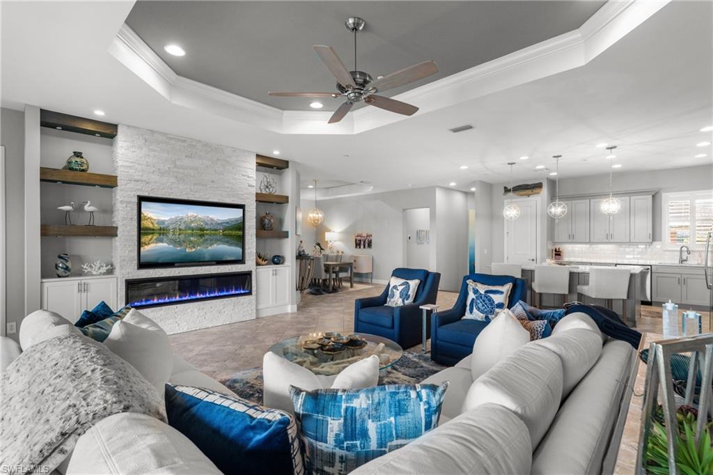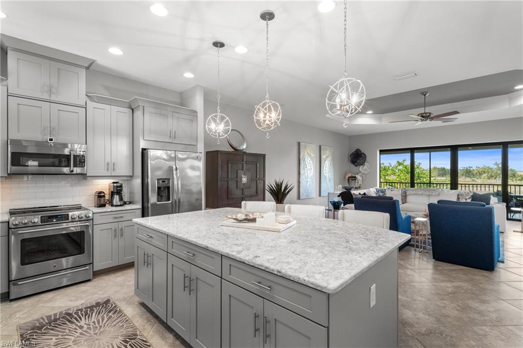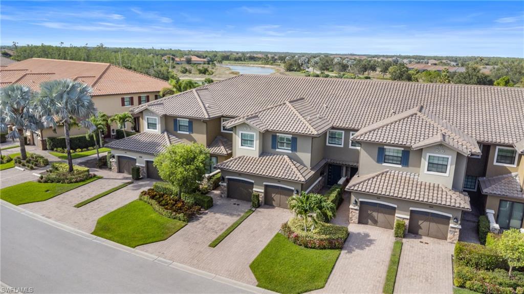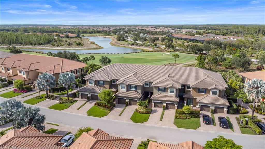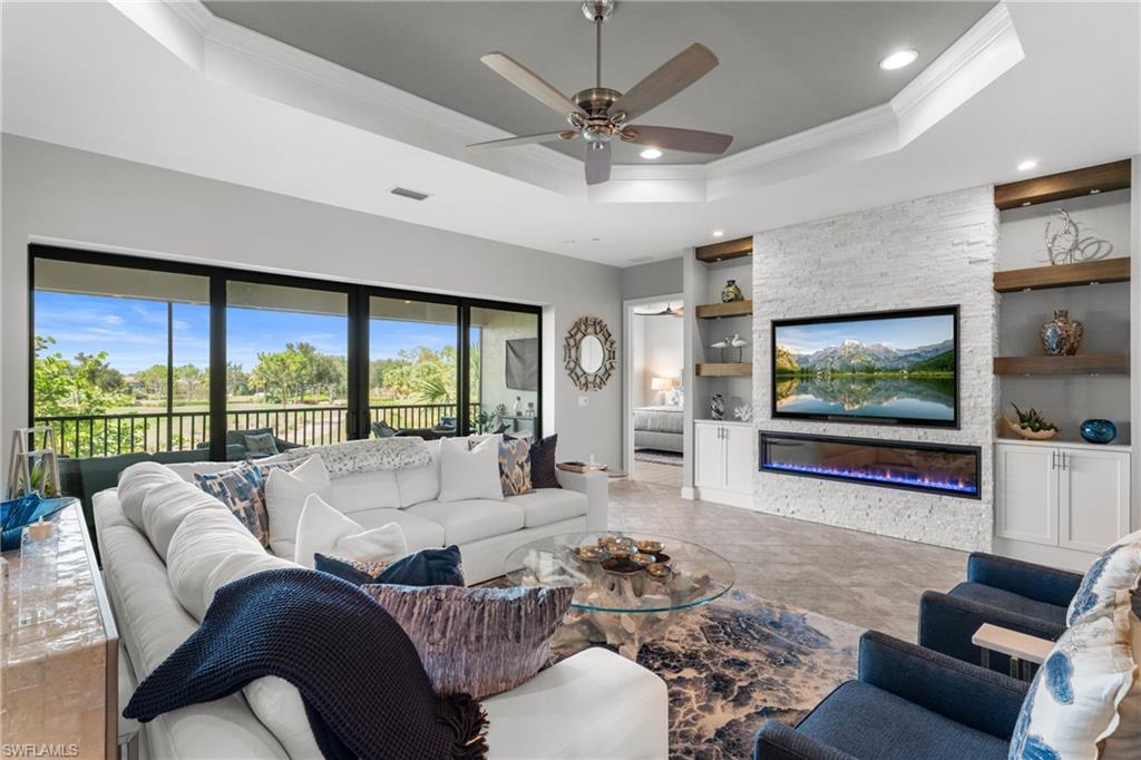 This beautifully appointed ‘Bellisimo’ second-floor coach home in Esplanade Golf & Country Club offers 2,343 square feet of elegant living space, featuring 3 bedrooms, 2.5 bathrooms, and a FULL GOLF MEMBERSHIP included. Partially furnished and thoughtfully upgraded, it seamlessly combines elegance, comfort, and scenic charm with expansive views of the tranquil lake and 8th green from the spacious 23-by-10-foot lanai that includes tile flooring. Inside, the open-concept great room makes a striking impression with a custom stone ‘feature wall’ showcasing a sleek LED fireplace, built-in cabinetry, and modern shelving—creating a cozy yet sophisticated ambiance. Crown molding and tray ceilings add refined architectural detail, while stylish diagonal tile flooring extends throughout the main living areas. At the heart of the home is the kitchen, designed to be both functional and beautiful. It features a large quartz-topped center island, stainless steel appliances, and abundant cabinetry, making it ideal for cooking and entertaining alike. Both guest bedrooms are versatile in use, with one offering convenient single Murphy beds to maximize space. Additional upgrades include luxury vinyl plank flooring in the bedrooms and staircase, no-see-um screens on the lanai, and high-impact hurricane windows/doors for enhanced safety and peace of mind. The HVAC system was replaced just 1.5 years ago, ensuring energy efficiency and modern reliability. Elegant lighting fixtures, premium finishes, and meticulous attention to detail throughout further elevate the home’s appeal. Many of the upgrades noted were added in the last 2-3 years. Entering Esplanade, you will notice why Esplanade Golf & CC was awarded this year's Outstanding Landscaping Award for the front entrance by the National Association of Landscape Professionals. As a resident of Esplanade, you'll enjoy an unmatched lifestyle with access to world-class amenities, including a championship golf course, state-of-the-art clubhouse, resort-style pool with food and beverage service, private cabanas, tennis and pickleball courts, walking and biking trails, a dog park, fitness center, full-service salon and spa, wellness center, tiki bar, and more. Ideally located in North Naples, Esplanade Golf & Country Club offers convenient access to I-75, the airport, top-rated restaurants, premier shopping, and the stunning beaches of the Gulf Coast. Known for its vibrant, active social scene, the community delivers the perfect blend of luxury, recreation, and lifestyle. Don’t miss the opportunity to make this exceptional home yours—and start living the Esplanade dream.