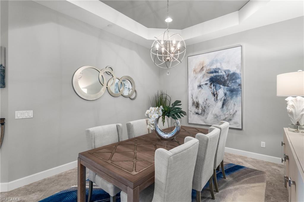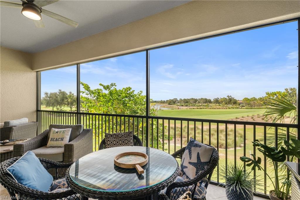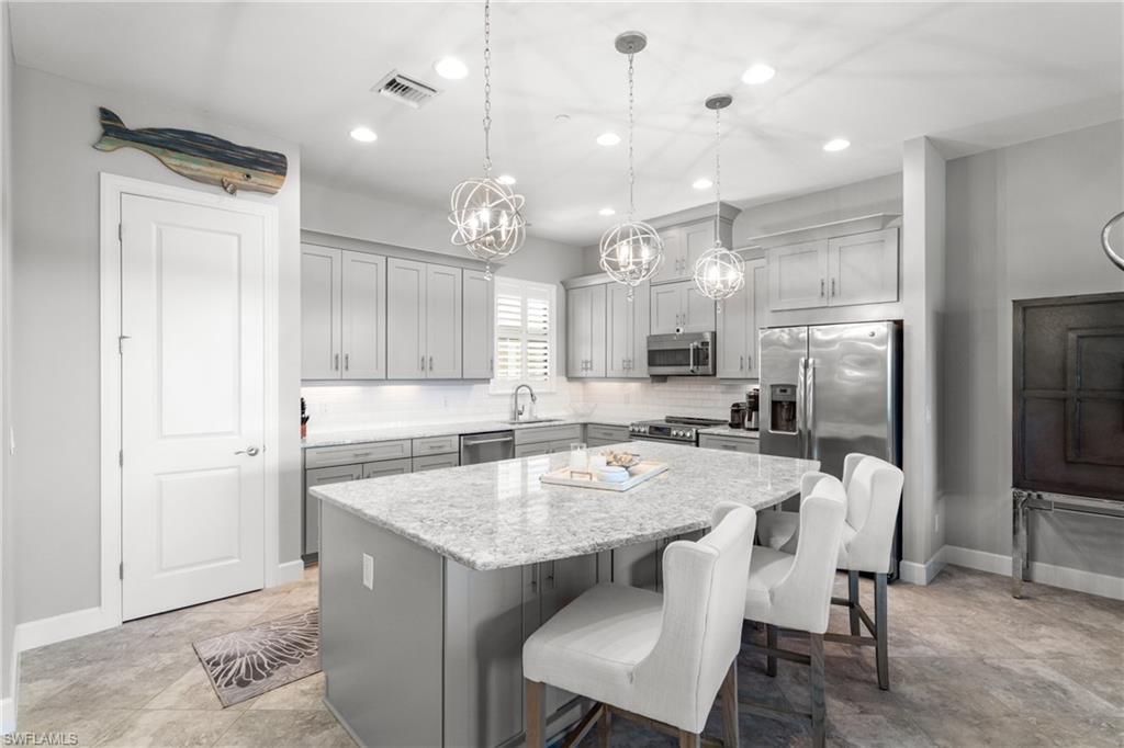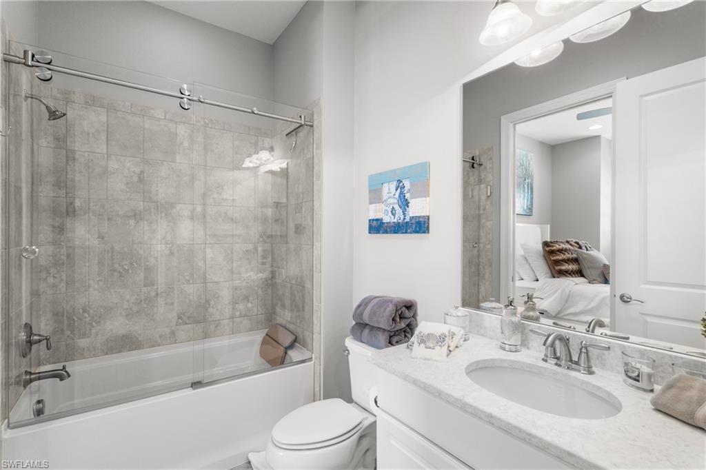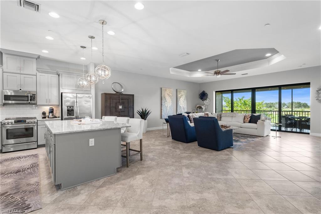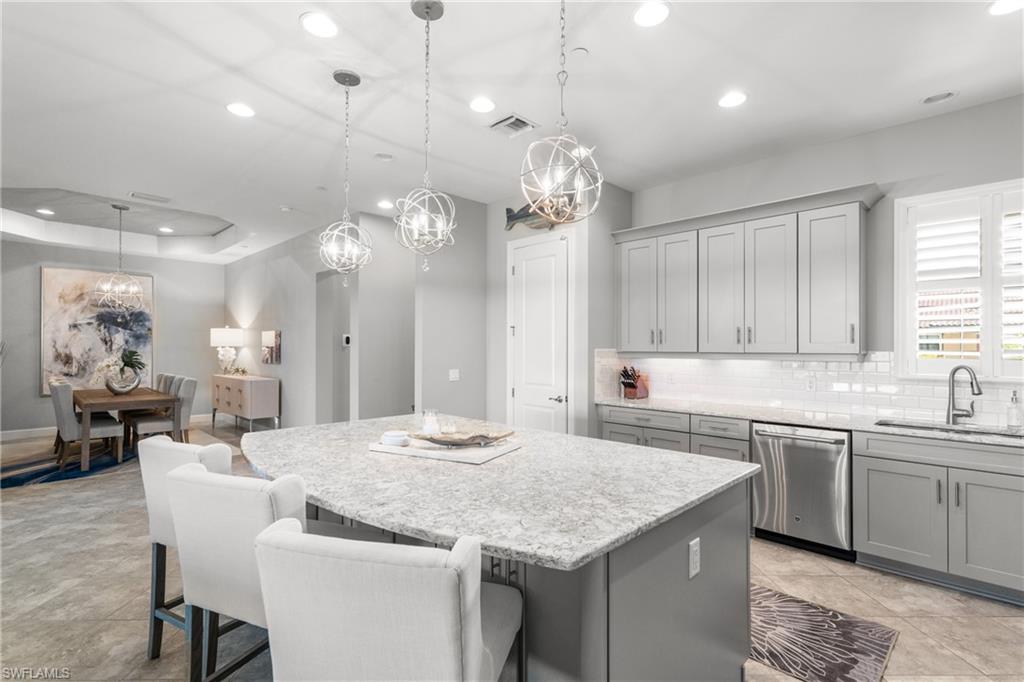 This beautifully appointed ‘Bellisimo’ second-floor coach home in Esplanade Golf & Country Club offers 2,343 square feet of elegant living space, featuring 3 bedrooms, 2.5 bathrooms, and a FULL GOLF MEMBERSHIP included. Partially furnished and thoughtfully upgraded, it seamlessly combines elegance, comfort, and scenic charm with expansive views of the tranquil lake and 8th green from the spacious 23-by-10-foot lanai that includes tile flooring. Inside, the open-concept great room makes a striking impression with a custom stone ‘feature wall’ showcasing a sleek LED fireplace, built-in cabinetry, and modern shelving—creating a cozy yet sophisticated ambiance. Crown molding and tray ceilings add refined architectural detail, while stylish diagonal tile flooring extends throughout the main living areas. At the heart of the home is the kitchen, designed to be both functional and beautiful. It features a large quartz-topped center island, stainless steel appliances, and abundant cabinetry, making it ideal for cooking and entertaining alike. Both guest bedrooms are versatile in use, with one offering convenient single Murphy beds to maximize space. Additional upgrades include luxury vinyl plank flooring in the bedrooms and staircase, no-see-um screens on the lanai, and high-impact hurricane windows/doors for enhanced safety and peace of mind. The HVAC system was replaced just 1.5 years ago, ensuring energy efficiency and modern reliability. Elegant lighting fixtures, premium finishes, and meticulous attention to detail throughout further elevate the home’s appeal. Many of the upgrades noted were added in the last 2-3 years. Entering Esplanade, you will notice why Esplanade Golf & CC was awarded this year's Outstanding Landscaping Award for the front entrance by the National Association of Landscape Professionals. As a resident of Esplanade, you'll enjoy an unmatched lifestyle with access to world-class amenities, including a championship golf course, state-of-the-art clubhouse, resort-style pool with food and beverage service, private cabanas, tennis and pickleball courts, walking and biking trails, a dog park, fitness center, full-service salon and spa, wellness center, tiki bar, and more. Ideally located in North Naples, Esplanade Golf & Country Club offers convenient access to I-75, the airport, top-rated restaurants, premier shopping, and the stunning beaches of the Gulf Coast. Known for its vibrant, active social scene, the community delivers the perfect blend of luxury, recreation, and lifestyle. Don’t miss the opportunity to make this exceptional home yours—and start living the Esplanade dream.