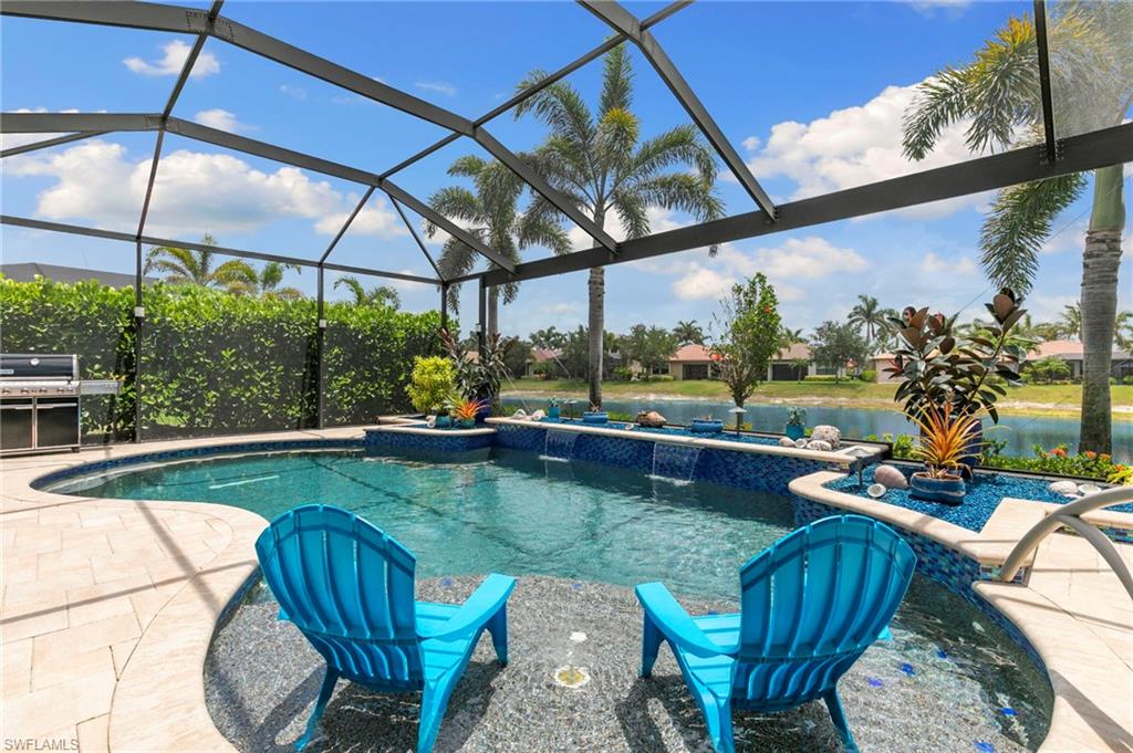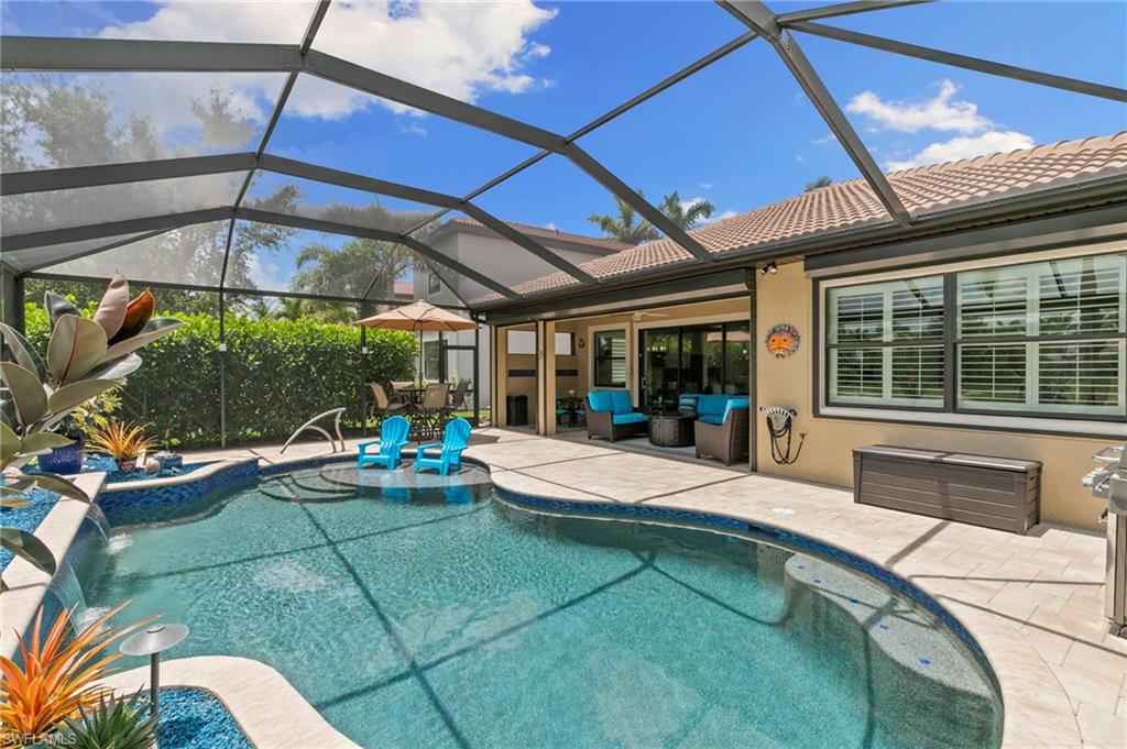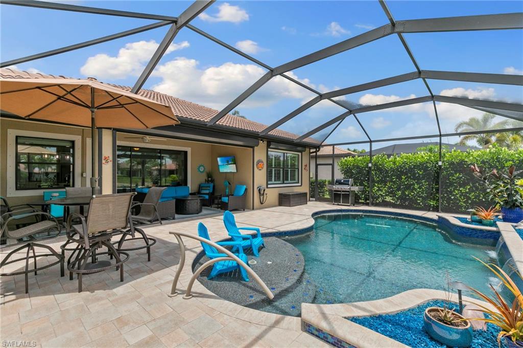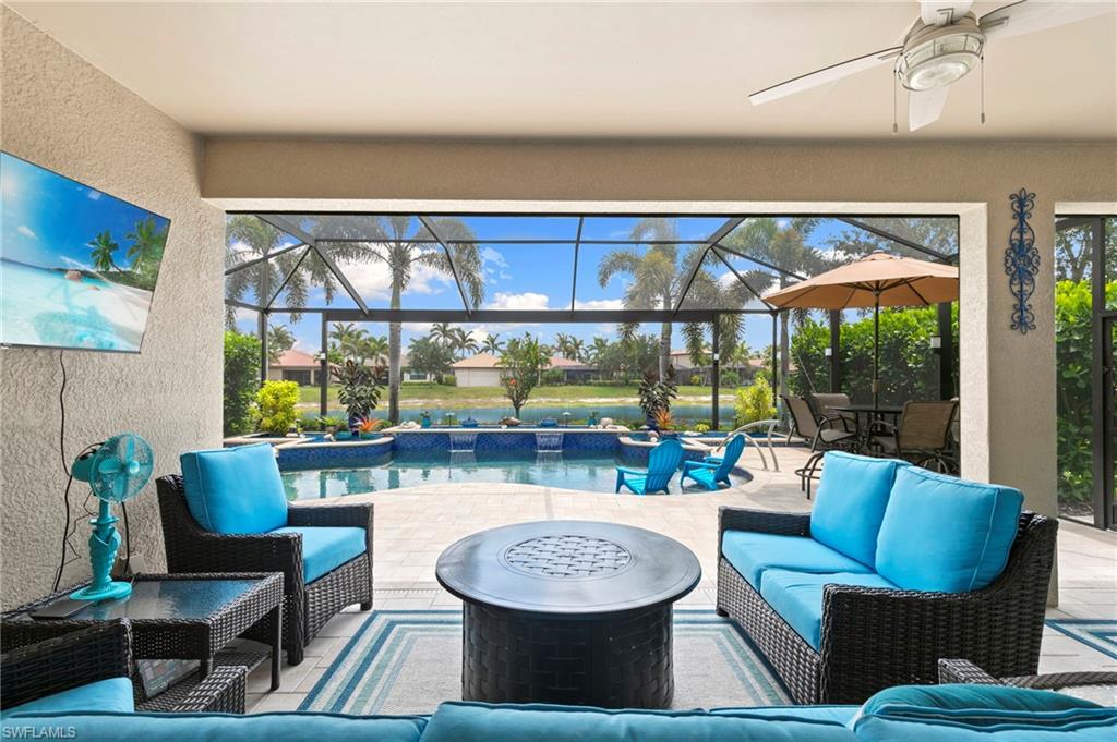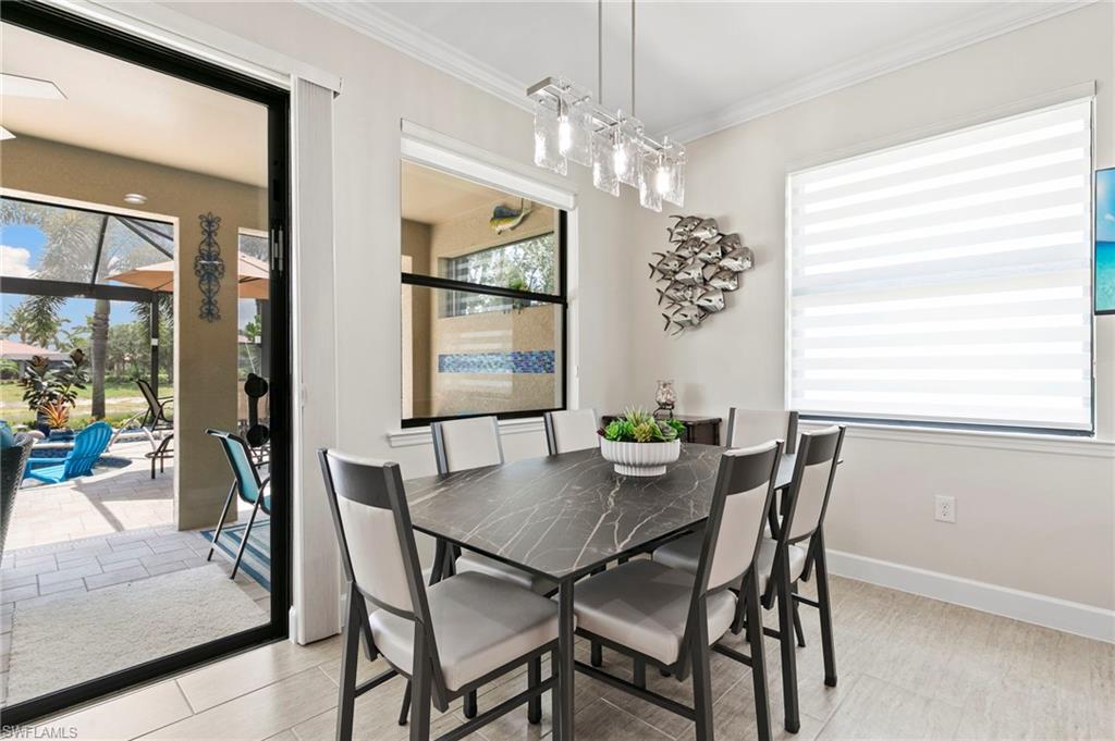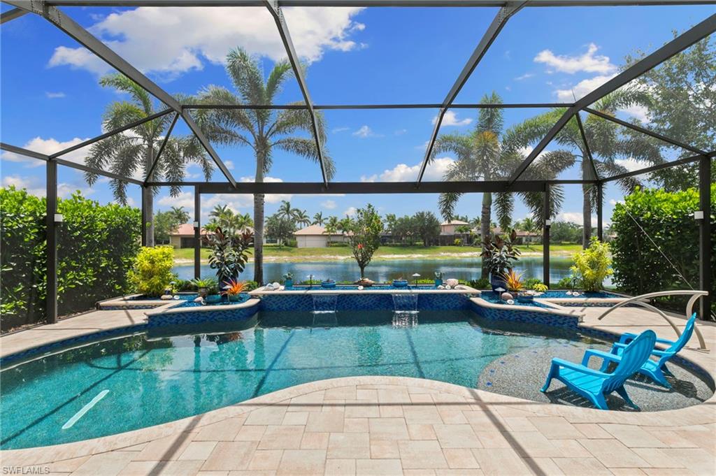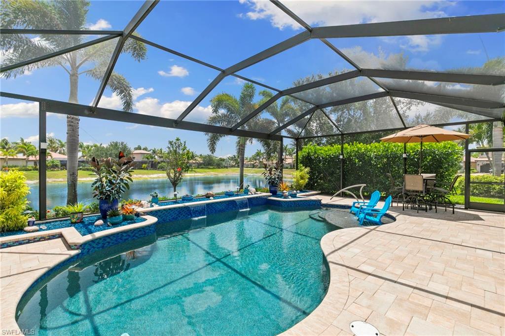 Rarely Available Edison Model with Lake Views & Custom Pool! Offered furnished and ready to enjoy, this beautiful 3BR + Den / 2BA home in the gated community of Paloma—features a custom heated saltwater pool with sun shelf, lighting, panoramic enclosure w/new screening, and overlooking the lake. This open-concept home offers split bedrooms, tile throughout, and hurricane protection with electric roll-down and accordion shutters. Interior highlights include: spacious kitchen w/granite countertops, 42” white cabinets, large island, & newer slate-finish appliances, tray ceilings, crown molding, plantation shutters, custom lighting/fans, extra closet shelving, owner’s suite w/dual sinks, walk-in shower & soaking tub, finished laundry room w/utility sink, recent interior/exterior paint, and extended garage for added storage. Low-maintenance living with HOA just $318/month, covering lawn care and access to resort-style amenities: pool, renovated clubhouse, fitness center, tennis & bocce courts. No CDD! Excellent location west of I-75—just minutes to Bonita/Naples beaches, RSW airport, Coconut Point, Miromar Outlets, and Mercato. Florida lifestyle at its best—perfect for seasonal or year-round living. Video tour available – schedule your private showing today!