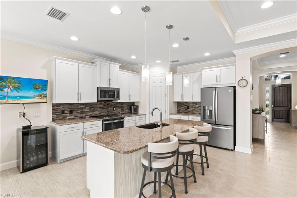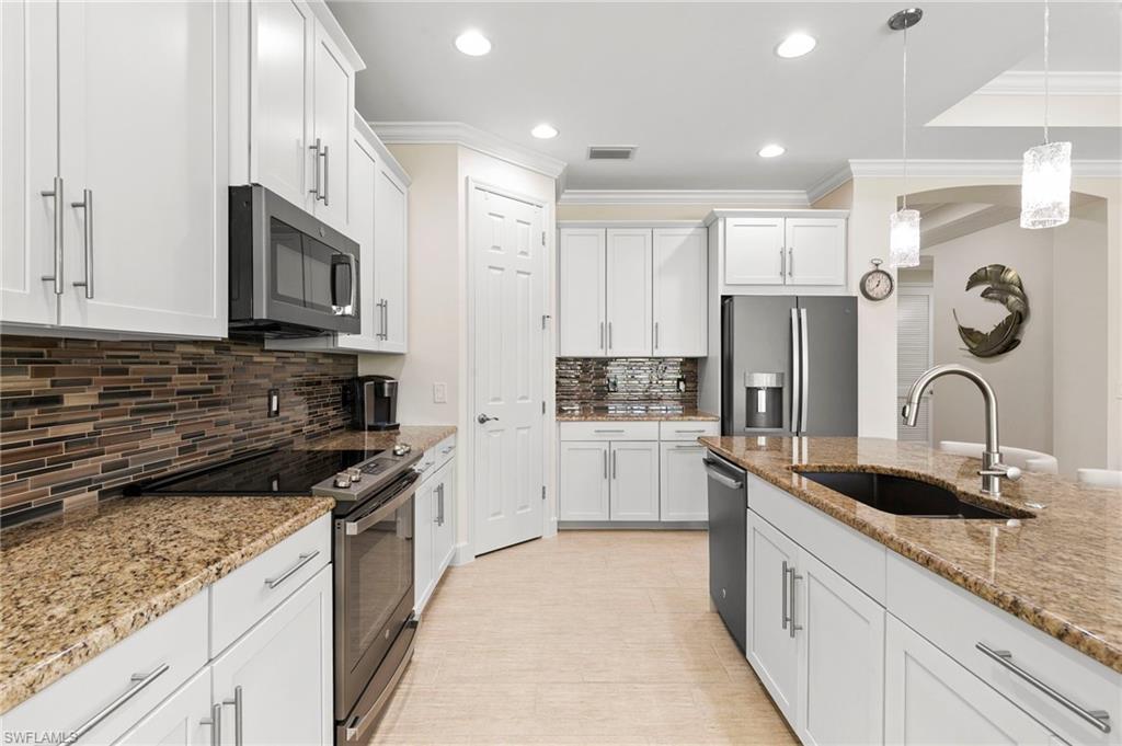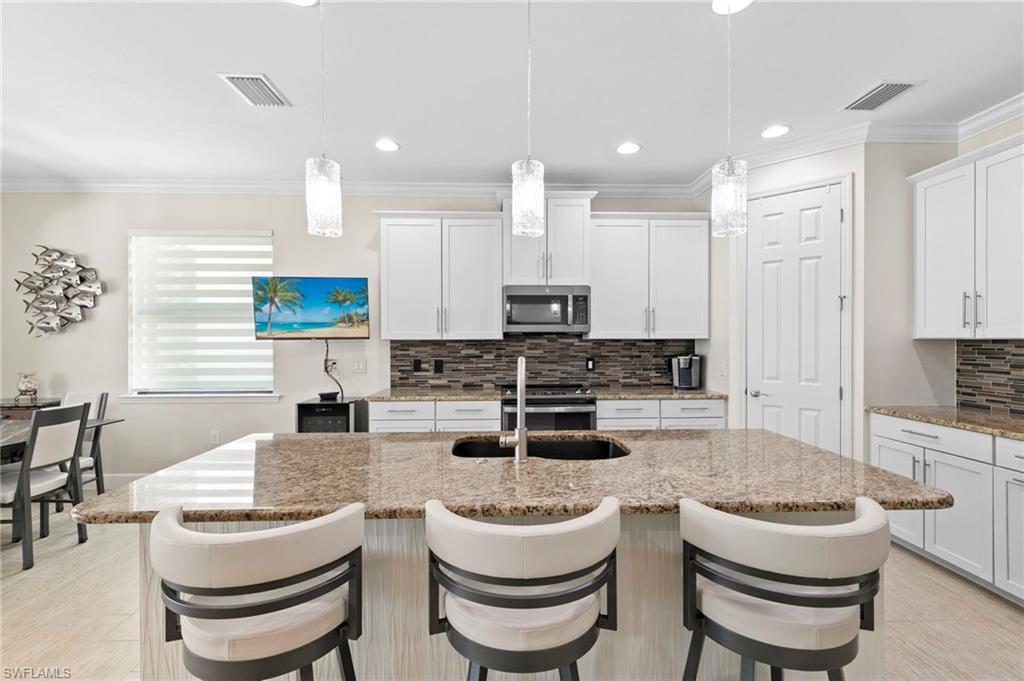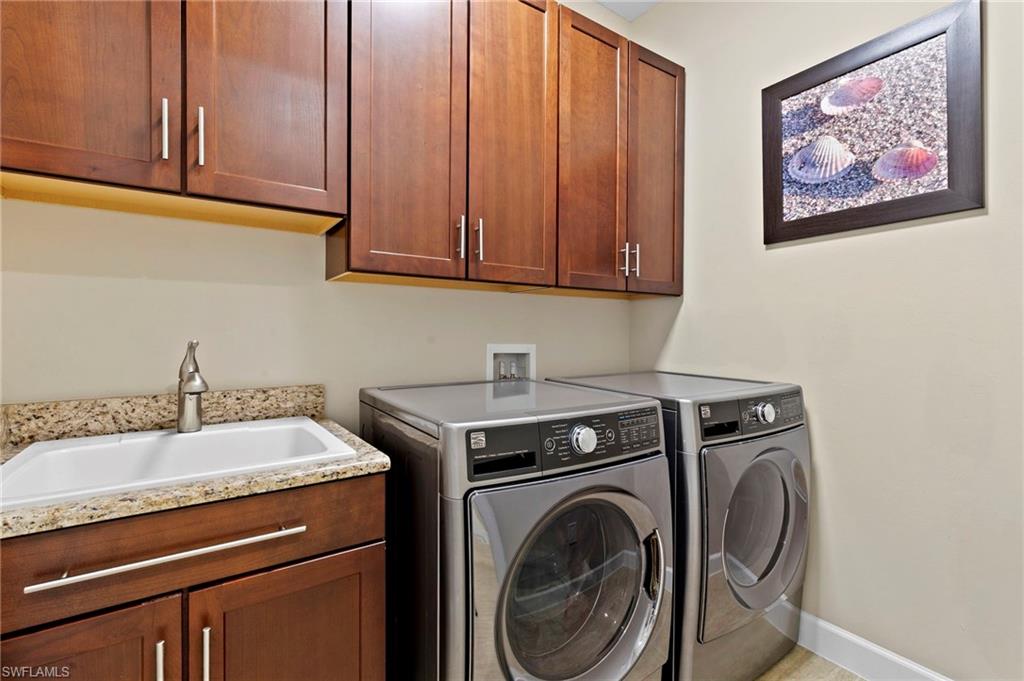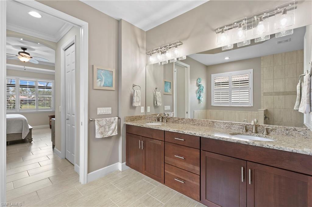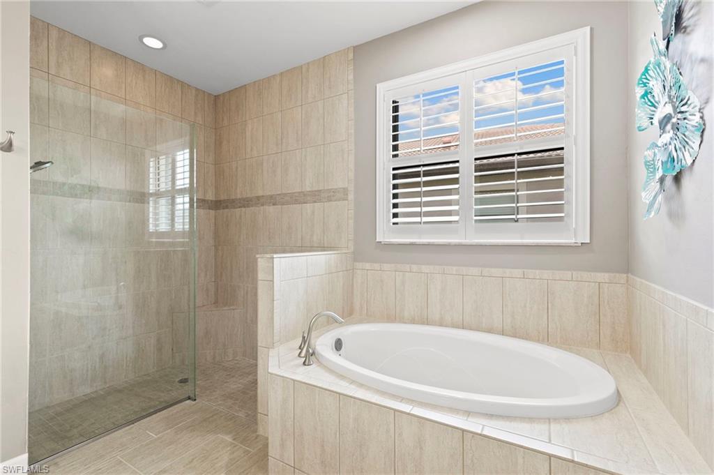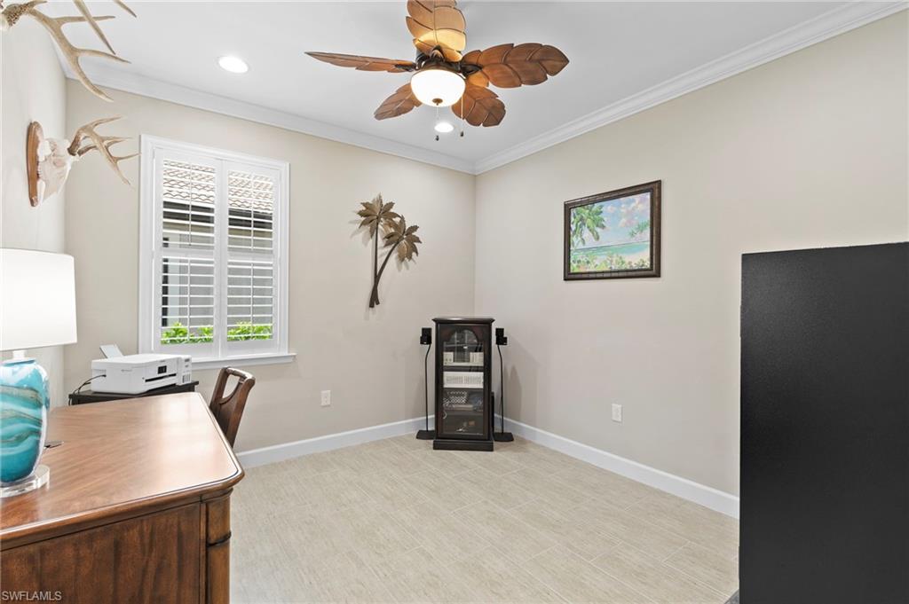 Rarely Available Edison Model with Lake Views & Custom Pool! Offered furnished and ready to enjoy, this beautiful 3BR + Den / 2BA home in the gated community of Paloma—features a custom heated saltwater pool with sun shelf, lighting, panoramic enclosure w/new screening, and overlooking the lake. This open-concept home offers split bedrooms, tile throughout, and hurricane protection with electric roll-down and accordion shutters. Interior highlights include: spacious kitchen w/granite countertops, 42” white cabinets, large island, & newer slate-finish appliances, tray ceilings, crown molding, plantation shutters, custom lighting/fans, extra closet shelving, owner’s suite w/dual sinks, walk-in shower & soaking tub, finished laundry room w/utility sink, recent interior/exterior paint, and extended garage for added storage. Low-maintenance living with HOA just $318/month, covering lawn care and access to resort-style amenities: pool, renovated clubhouse, fitness center, tennis & bocce courts. No CDD! Excellent location west of I-75—just minutes to Bonita/Naples beaches, RSW airport, Coconut Point, Miromar Outlets, and Mercato. Florida lifestyle at its best—perfect for seasonal or year-round living. Video tour available – schedule your private showing today!