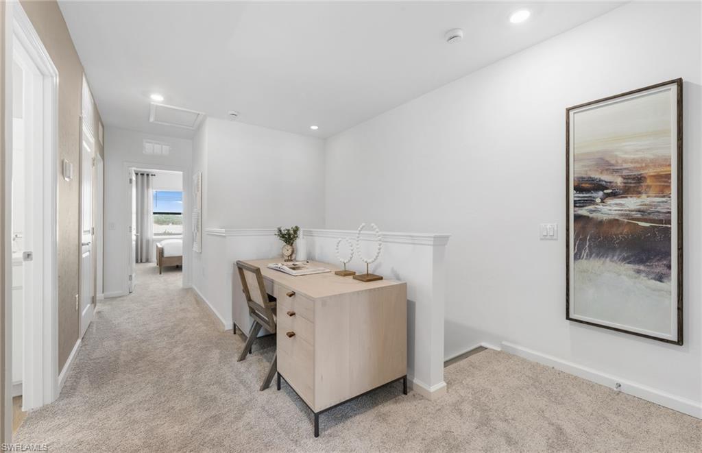 Welcome to the Rowan, a beautifully designed end-unit townhouse offering 3 bedrooms, 2.5 bathrooms, and a 2-car garage. This home is filled with stylish upgrades, including white cabinets with quartz countertops and a stunning mosaic backsplash in the kitchen. Enjoy the durability and elegance of LVP flooring in the main living areas, tile in the wet areas, and plush carpet in the bedrooms. The home also features stainless steel appliances, impact windows for added safety and energy efficiency, and a durable tile roof. With an eastern rear exposure, you'll enjoy bright mornings and shaded afternoons. Low HOA fees and NO CDD make this home an exceptional value in a prime location. Photos are from a furnished model. Options for this home may vary.