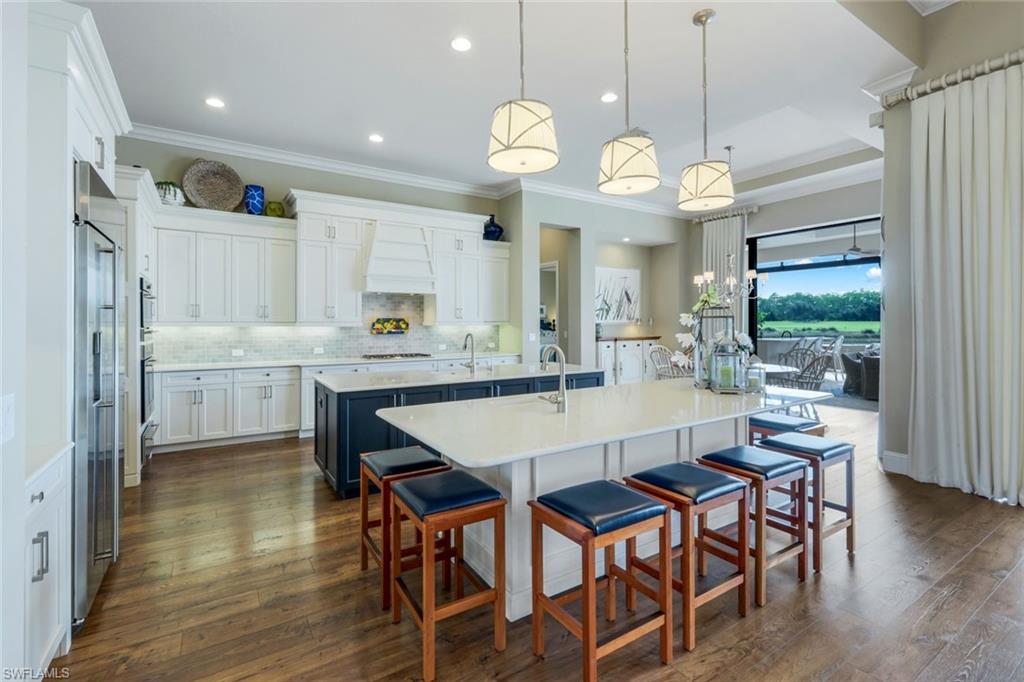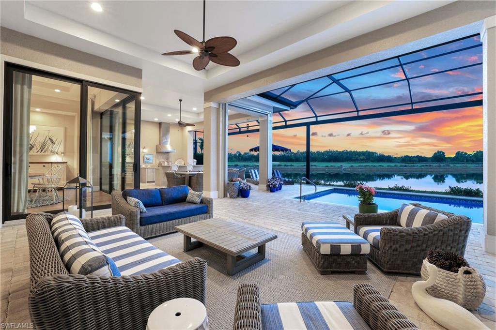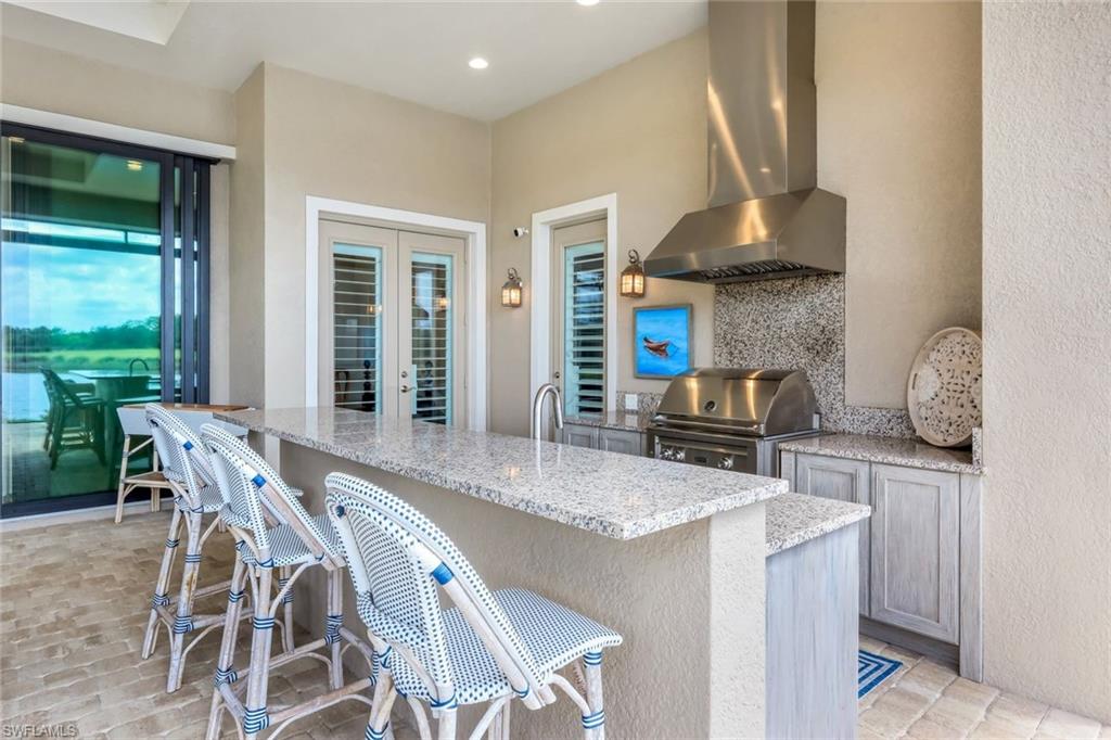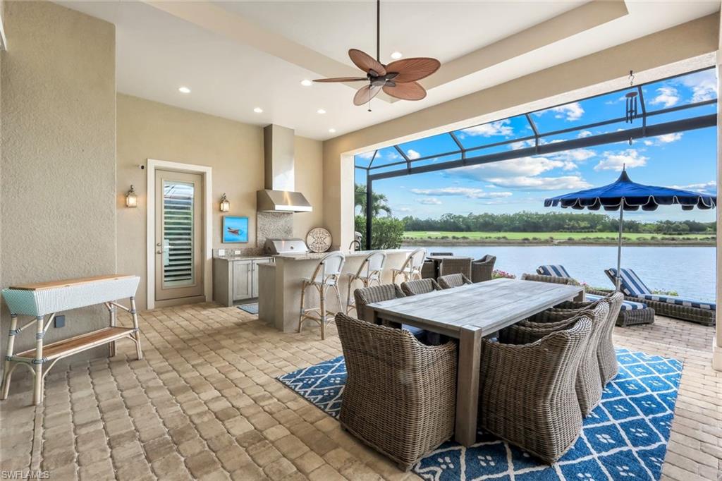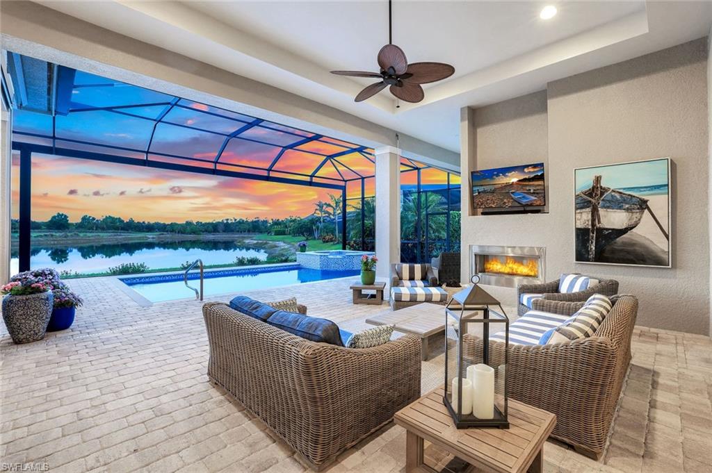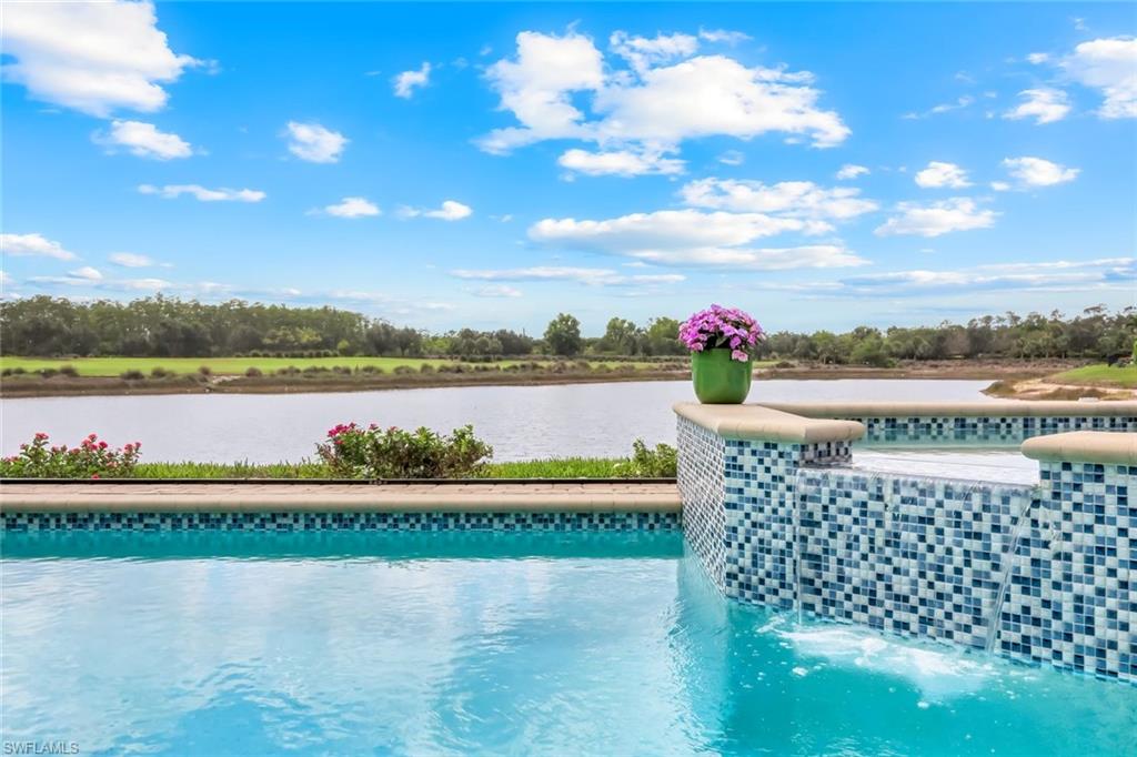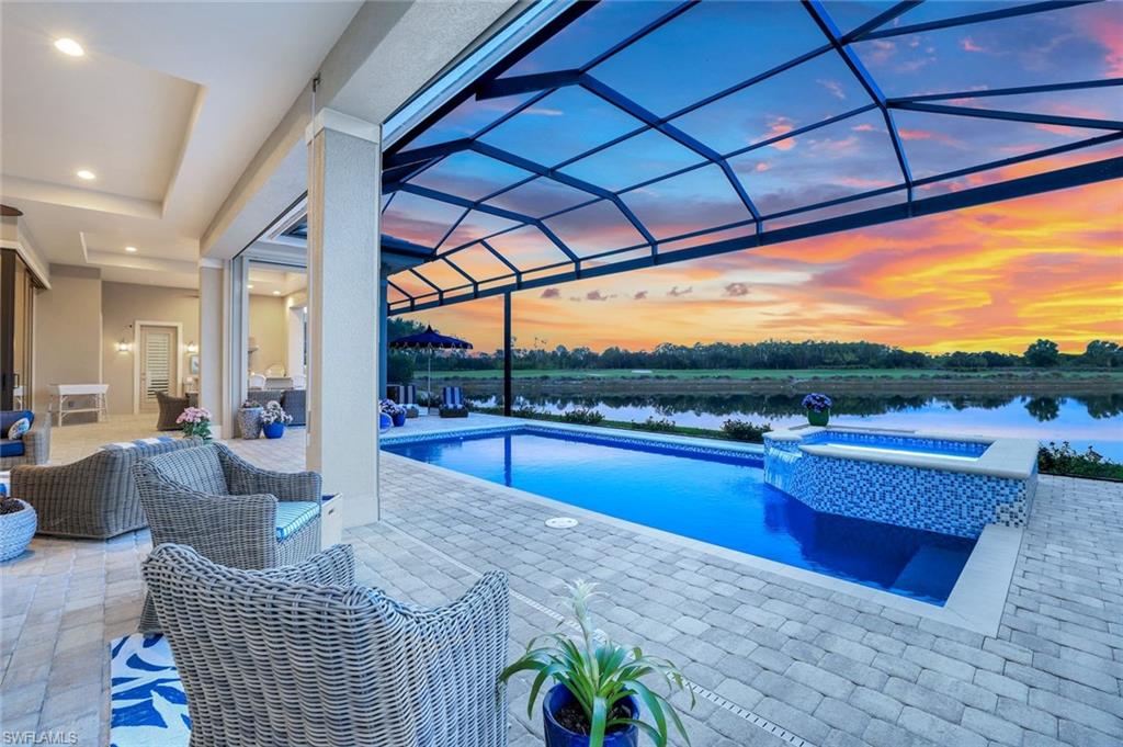 A rare opportunity awaits on Esplanade’s most private enclave of custom estates. FULL GOLF MEMBERSHIP INCLUDED. This exquisite Glenmore floor plan custom built by STOCK Development is ideally situated on a quiet, coveted street, offering an unmatched blend of privacy, sophistication, and panoramic views of the lake, golf course, and natural preserve. From the moment you enter, you’ll be captivated by the elegant finishes and breathtaking scenery that frame every window, a perfect harmony of resort-style luxury and timeless design. Thoughtfully designed for both everyday living and grand entertaining, this 4-bedroom plus den, 4.5-bathroom home welcomes you with an expansive open layout and seamless indoor-outdoor flow. The heart of the home is a designer chef’s kitchen featuring TWO, 9-foot islands and one that comfortably seats eight, GE Monogram appliances, custom cabinetry with under-cabinet lighting, and a Dual Zoned Wine and Beverage Refrigerator. The adjacent living and dining spaces are adorned with custom millwork, tray and coffered ceilings, elegant light fixtures, plantation shutters, crown molding and custom drapery, all adding layers of warmth and sophistication. The luxurious primary suite offers a serene escape with dual walk-in closets, a cozy reading nook, and a spa-like bathroom complete with a freestanding soaking tub, oversized walk-in shower, double vanities, and a dedicated makeup area. Each guest bedroom enjoys its own private en-suite bath, providing comfort and privacy for family and friends alike. Step outside and experience true resort living on your private lanai, where brick paver flooring extends to an inviting outdoor fireplace and TV lounge, a full summer kitchen with bar seating, an outdoor shower, and a spectacular saltwater pool and spa with spillover feature, all under cover and protected by Storm Smart motorized screens. The home is further enhanced by a whole-house generator, impact-rated windows and doors, a full-home water filtration and reverse osmosis system, and an air-conditioned three-car garage with built-in storage. Located within Naples’ premier bundled golf community, Esplanade offers an unmatched lifestyle including an 18-hole private golf course, resort pool with cabana bar, full-service spa, tennis, pickleball, bocce, state-of-the-art fitness center, and 11 miles of walking and biking trails. The 54,000-square-foot clubhouse features fine dining, wine lockers, and a calendar full of social events and activities. This is more than a home, it’s a private sanctuary where luxury, lifestyle, and location come together in perfect harmony. ALL THE GOLF, TENNIS, FITNESS, PICKLE BALL AND LIFESTLYE AMENITES ARE INCLUDED WITH THE PURCHASE OF THIS HOME.