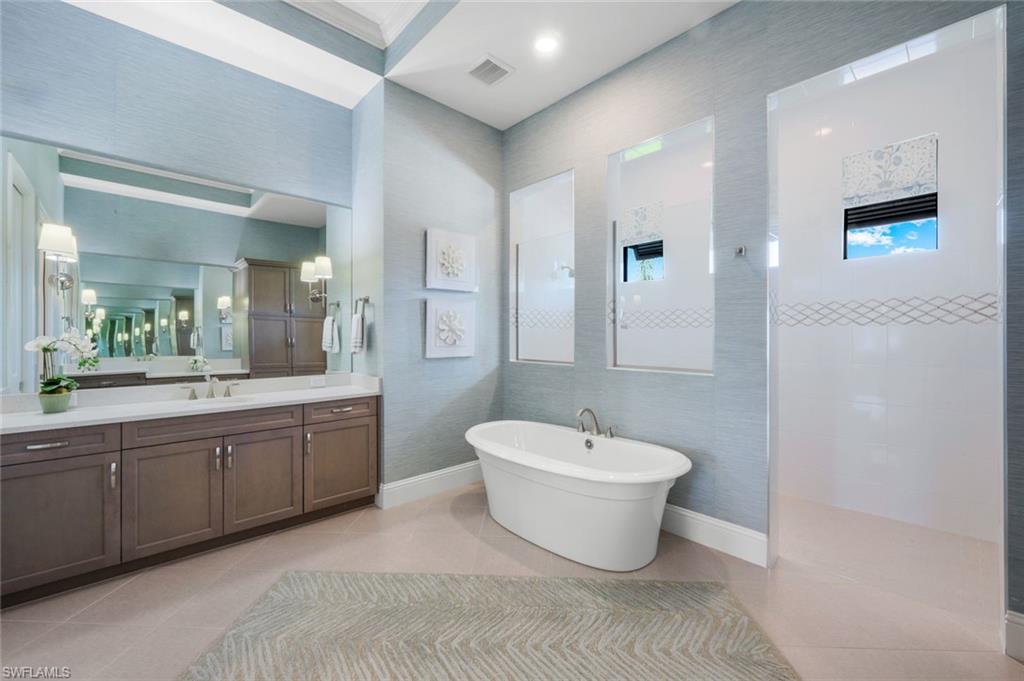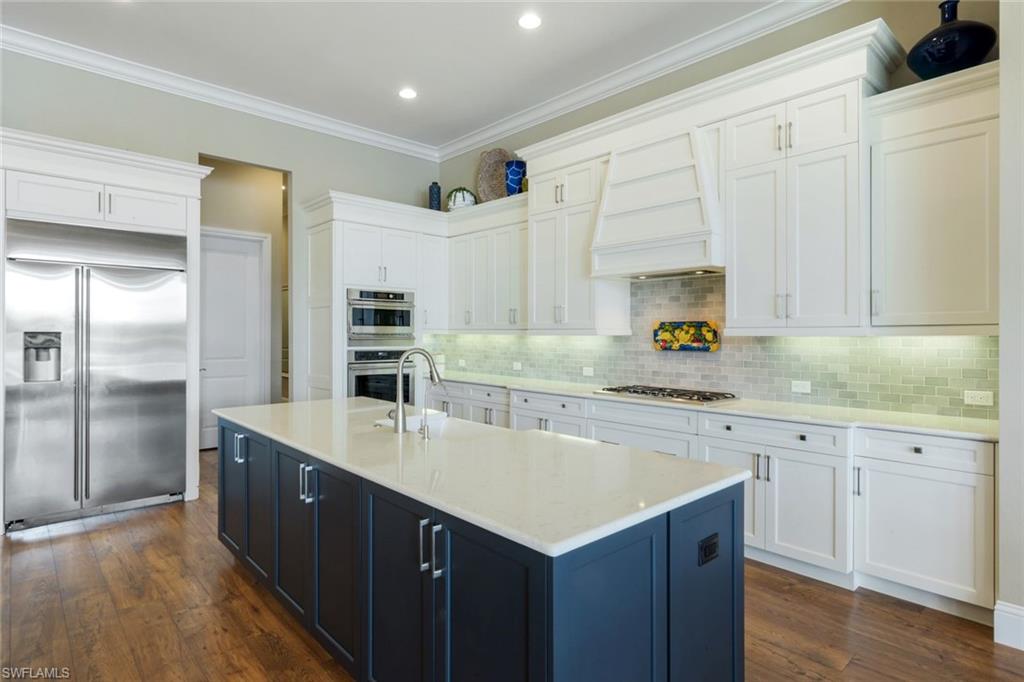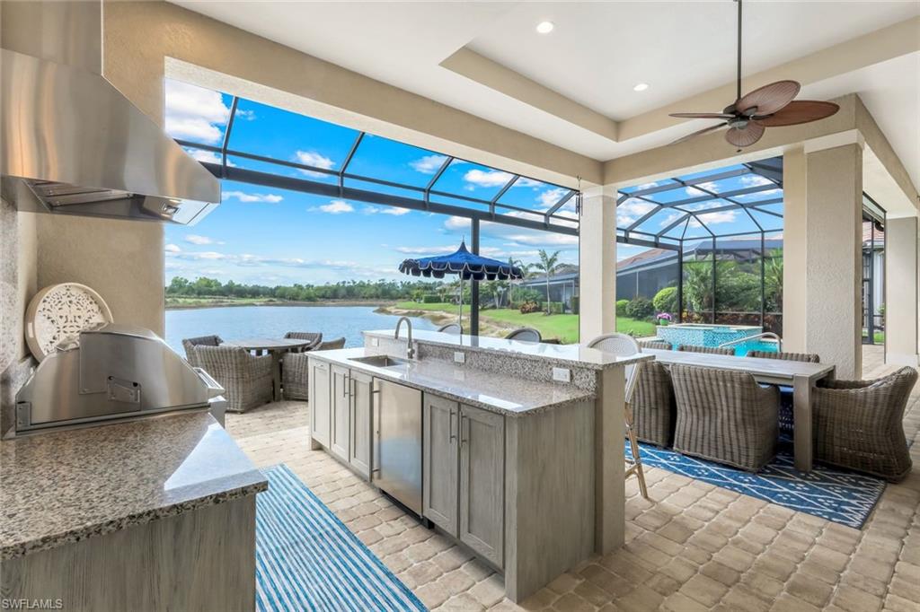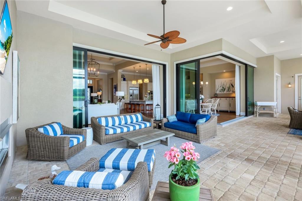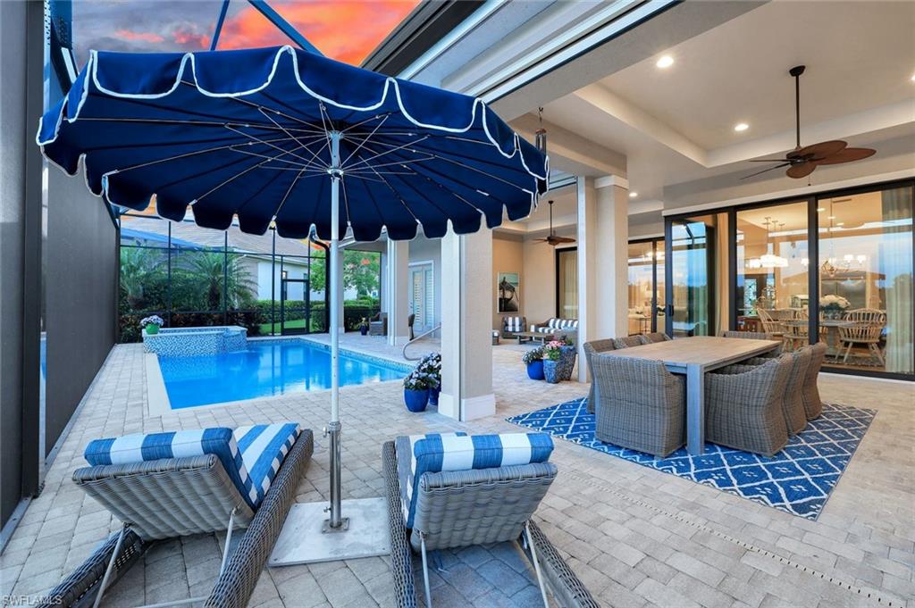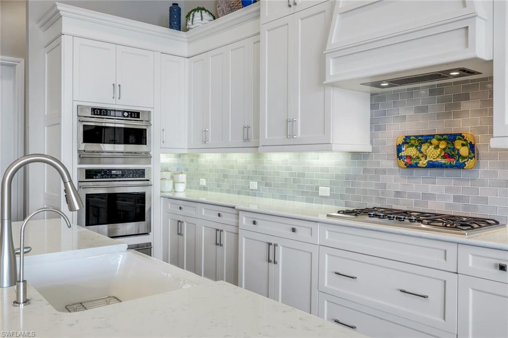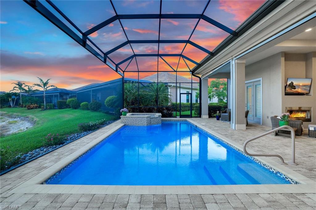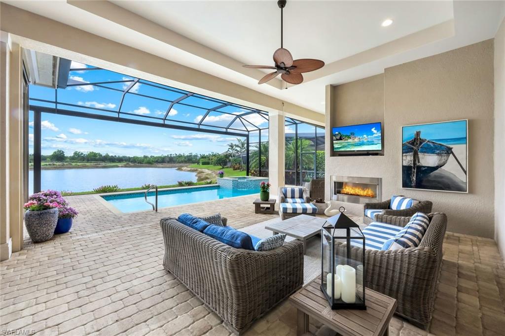 A rare opportunity awaits on Esplanade’s most private enclave of custom estates. FULL GOLF MEMBERSHIP INCLUDED. This exquisite Glenmore floor plan custom built by STOCK Development is ideally situated on a quiet, coveted street, offering an unmatched blend of privacy, sophistication, and panoramic views of the lake, golf course, and natural preserve. From the moment you enter, you’ll be captivated by the elegant finishes and breathtaking scenery that frame every window, a perfect harmony of resort-style luxury and timeless design. Thoughtfully designed for both everyday living and grand entertaining, this 4-bedroom plus den, 4.5-bathroom home welcomes you with an expansive open layout and seamless indoor-outdoor flow. The heart of the home is a designer chef’s kitchen featuring TWO, 9-foot islands and one that comfortably seats eight, GE Monogram appliances, custom cabinetry with under-cabinet lighting, and a Dual Zoned Wine and Beverage Refrigerator. The adjacent living and dining spaces are adorned with custom millwork, tray and coffered ceilings, elegant light fixtures, plantation shutters, crown molding and custom drapery, all adding layers of warmth and sophistication. The luxurious primary suite offers a serene escape with dual walk-in closets, a cozy reading nook, and a spa-like bathroom complete with a freestanding soaking tub, oversized walk-in shower, double vanities, and a dedicated makeup area. Each guest bedroom enjoys its own private en-suite bath, providing comfort and privacy for family and friends alike. Step outside and experience true resort living on your private lanai, where brick paver flooring extends to an inviting outdoor fireplace and TV lounge, a full summer kitchen with bar seating, an outdoor shower, and a spectacular saltwater pool and spa with spillover feature, all under cover and protected by Storm Smart motorized screens. The home is further enhanced by a whole-house generator, impact-rated windows and doors, a full-home water filtration and reverse osmosis system, and an air-conditioned three-car garage with built-in storage. Located within Naples’ premier bundled golf community, Esplanade offers an unmatched lifestyle including an 18-hole private golf course, resort pool with cabana bar, full-service spa, tennis, pickleball, bocce, state-of-the-art fitness center, and 11 miles of walking and biking trails. The 54,000-square-foot clubhouse features fine dining, wine lockers, and a calendar full of social events and activities. This is more than a home, it’s a private sanctuary where luxury, lifestyle, and location come together in perfect harmony. ALL THE GOLF, TENNIS, FITNESS, PICKLE BALL AND LIFESTLYE AMENITES ARE INCLUDED WITH THE PURCHASE OF THIS HOME.