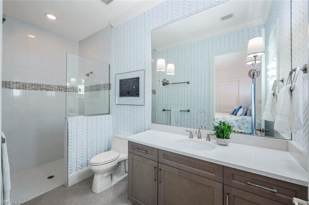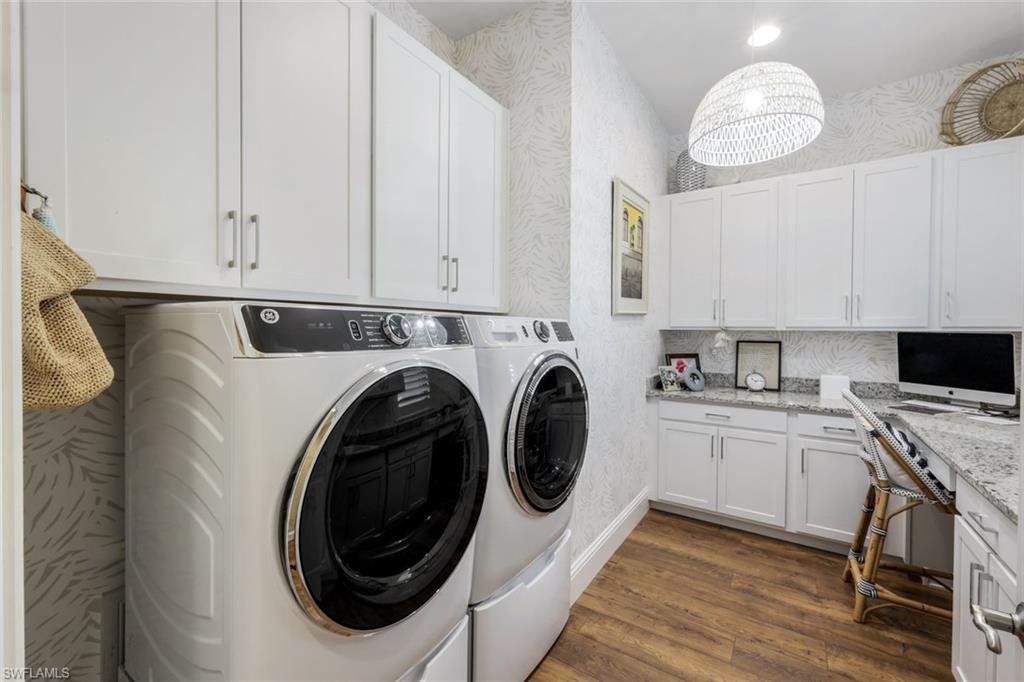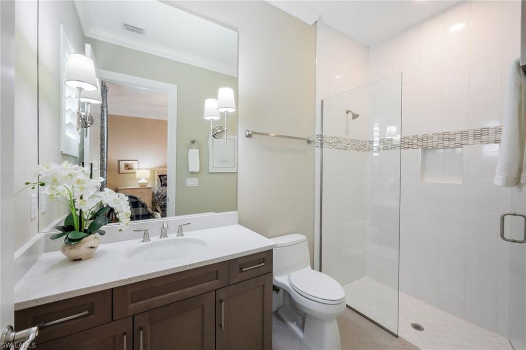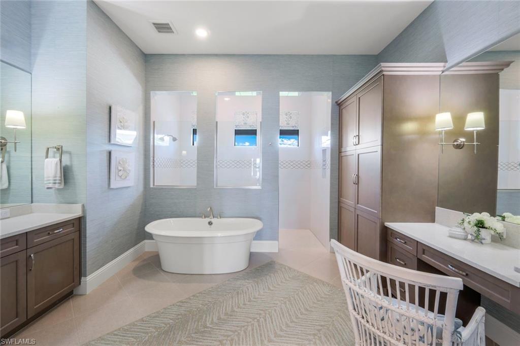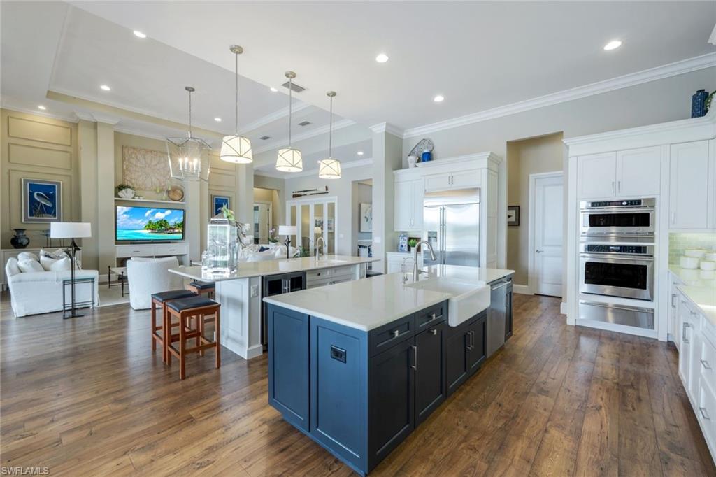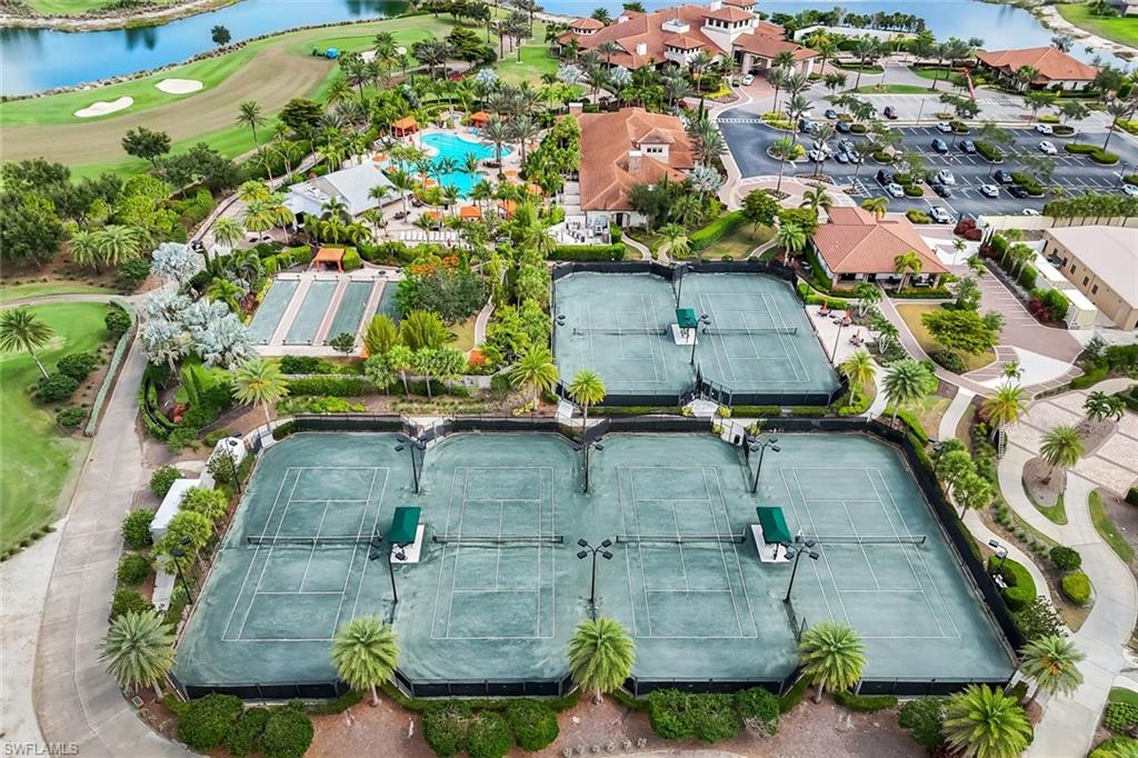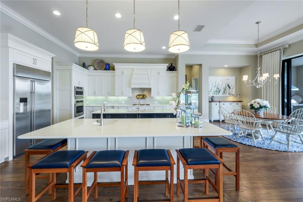 A rare opportunity awaits on Esplanade’s most private enclave of custom estates. FULL GOLF MEMBERSHIP INCLUDED. This exquisite Glenmore floor plan custom built by STOCK Development is ideally situated on a quiet, coveted street, offering an unmatched blend of privacy, sophistication, and panoramic views of the lake, golf course, and natural preserve. From the moment you enter, you’ll be captivated by the elegant finishes and breathtaking scenery that frame every window, a perfect harmony of resort-style luxury and timeless design. Thoughtfully designed for both everyday living and grand entertaining, this 4-bedroom plus den, 4.5-bathroom home welcomes you with an expansive open layout and seamless indoor-outdoor flow. The heart of the home is a designer chef’s kitchen featuring TWO, 9-foot islands and one that comfortably seats eight, GE Monogram appliances, custom cabinetry with under-cabinet lighting, and a Dual Zoned Wine and Beverage Refrigerator. The adjacent living and dining spaces are adorned with custom millwork, tray and coffered ceilings, elegant light fixtures, plantation shutters, crown molding and custom drapery, all adding layers of warmth and sophistication. The luxurious primary suite offers a serene escape with dual walk-in closets, a cozy reading nook, and a spa-like bathroom complete with a freestanding soaking tub, oversized walk-in shower, double vanities, and a dedicated makeup area. Each guest bedroom enjoys its own private en-suite bath, providing comfort and privacy for family and friends alike. Step outside and experience true resort living on your private lanai, where brick paver flooring extends to an inviting outdoor fireplace and TV lounge, a full summer kitchen with bar seating, an outdoor shower, and a spectacular saltwater pool and spa with spillover feature, all under cover and protected by Storm Smart motorized screens. The home is further enhanced by a whole-house generator, impact-rated windows and doors, a full-home water filtration and reverse osmosis system, and an air-conditioned three-car garage with built-in storage. Located within Naples’ premier bundled golf community, Esplanade offers an unmatched lifestyle including an 18-hole private golf course, resort pool with cabana bar, full-service spa, tennis, pickleball, bocce, state-of-the-art fitness center, and 11 miles of walking and biking trails. The 54,000-square-foot clubhouse features fine dining, wine lockers, and a calendar full of social events and activities. This is more than a home, it’s a private sanctuary where luxury, lifestyle, and location come together in perfect harmony. ALL THE GOLF, TENNIS, FITNESS, PICKLE BALL AND LIFESTLYE AMENITES ARE INCLUDED WITH THE PURCHASE OF THIS HOME.