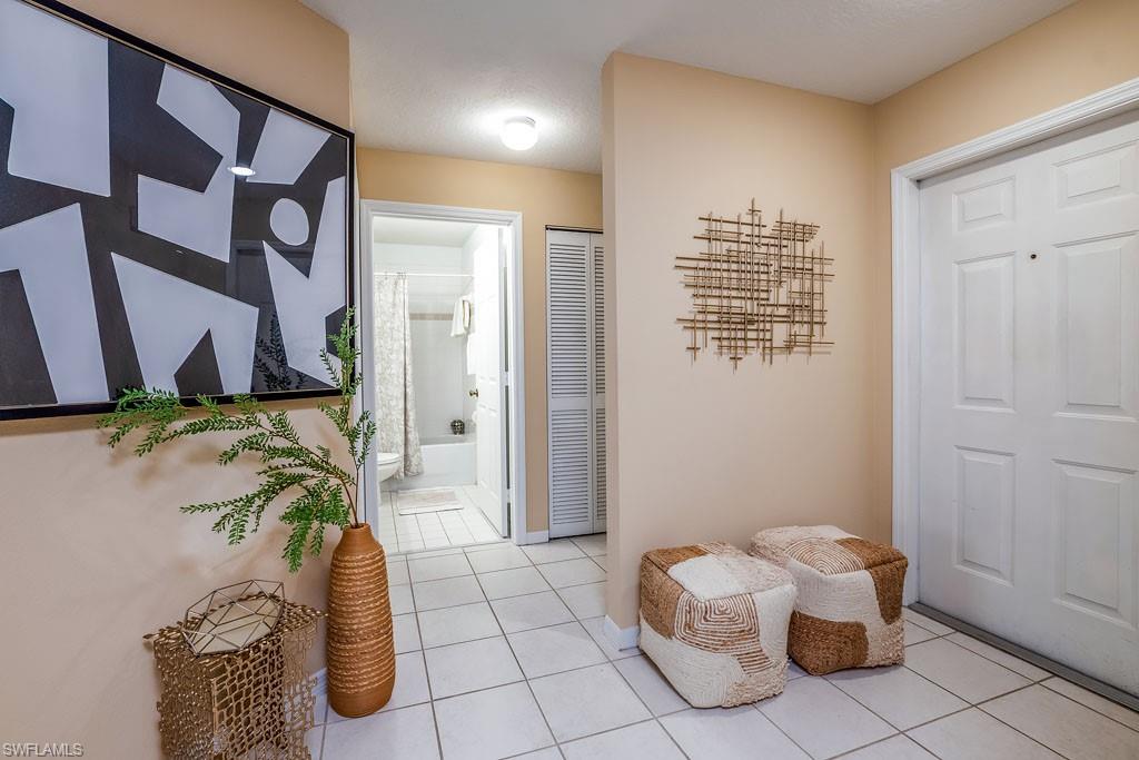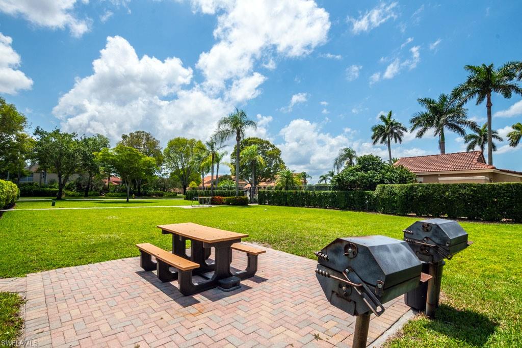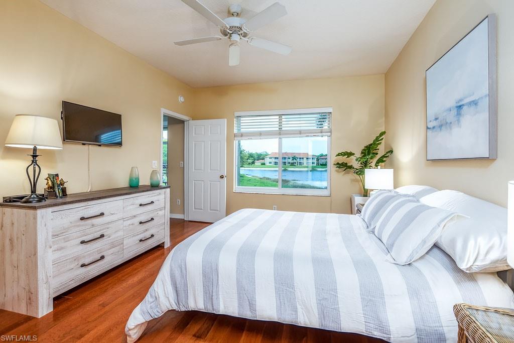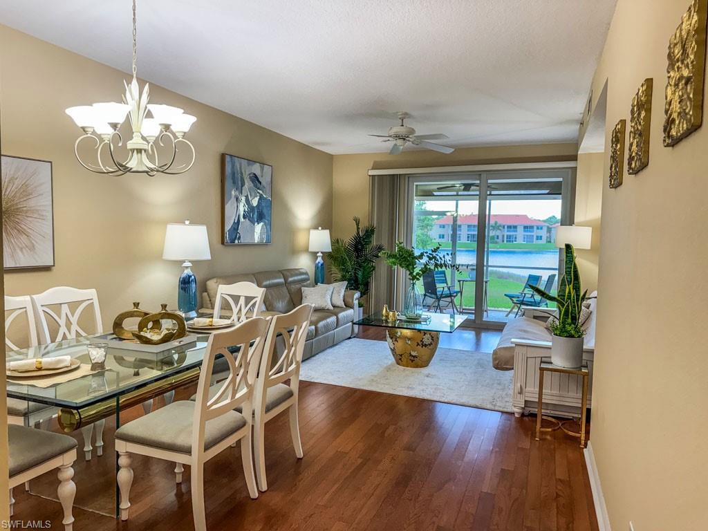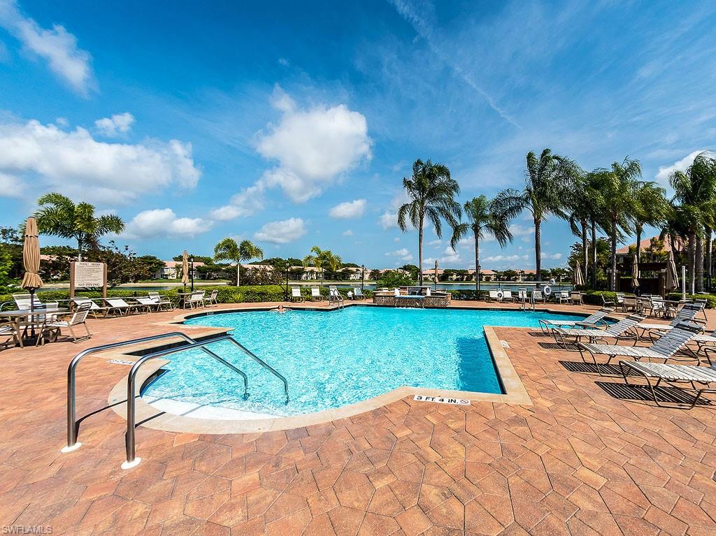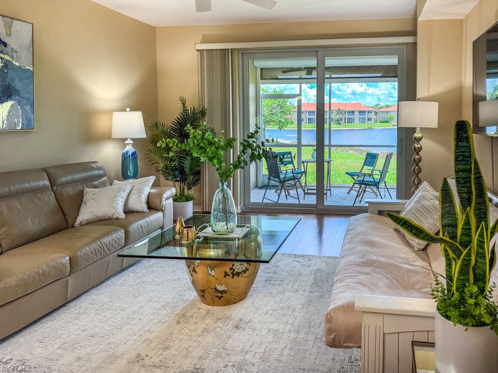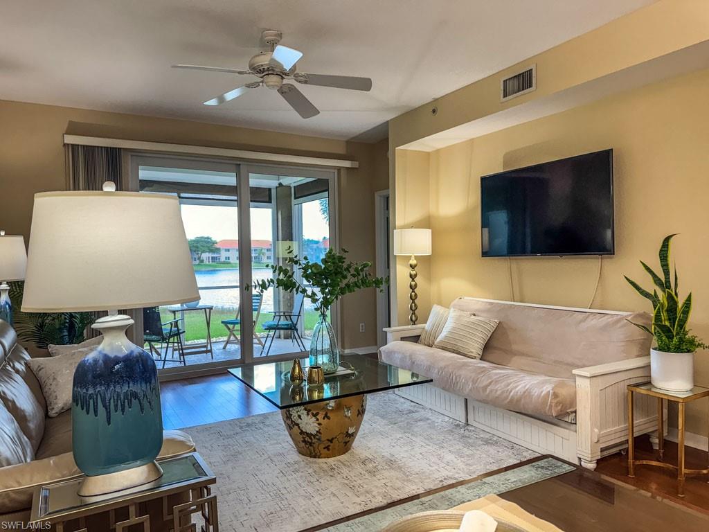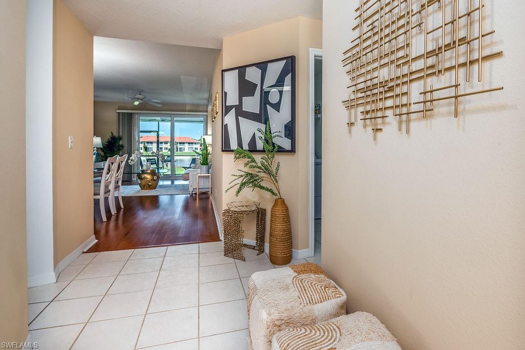 Fully furnished! Beautiful tropical view for sale! The condo comes with it. This is your chance to enjoy stunning Naples, Florida sunsets over tranquil waters of the lake with a fountain from the lanai of this beautiful, light, and bright 2-bedroom, 2-bathroom condo with a 1-car detached garage. No stairs, no carpets. Built in 2000, it features newer hurricane (impact resistant) windows and sliding doors, roof, as well as a newer air conditioner, kitchen appliances, sink, and faucet with a water filtration system. Additionally, Windsafe hurricane shutters are installed on the lanai. Huntington Lakes is a gated community offering a spacious clubhouse with a resort-style pool and spa/hot tub, a fitness center, billiards, Bocce Courts, and 4 tennis courts with Har-Tru surfaces, providing the 'true' nature of the bounce experienced on the court. The community also includes two smaller pools located closer to the center and back. Conveniently located in one of North Naples' most desired areas, Huntington Lakes is just minutes from Naples' sugar sand beaches (Delnor-Wiggins Pass Beach State Park being the closest), Seed To Table Market, shopping plazas, and restaurants. A short drive south leads to Mercato, Waterside Shops, Artis Center, Venetian Bay, Bayfront, or Olde Naples Downtown with its famous attractions. A short drive north brings to Coconut Point Mall, Miromar Outlets Mall, Hertz Arena, and Gulf Coast Town Center Mall. Located in one of the most popular school districts, the community boasts competitive HOA/Condo fees for the Naples area. Make this waterfront condo yours today!