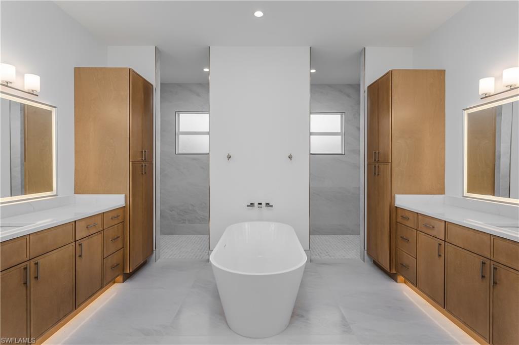 Step into luxury with this brand-new, fully custom pool home, perfectly situated at the end of a private cul-de-sac in the heart of Naples. This stunning two-story masterpiece offers 3 bedrooms plus a spacious office/den, 3 full bathrooms, and 1 half bathroom, all designed with impeccable attention to detail. With soaring 12-foot ceilings, stepping up to 13 feet in elegant tray designs, the open-concept living space feels bright, airy, and grand. The extra-large great room, formal dining area, and gourmet kitchen seamlessly flow together, creating the perfect setting for entertaining. Wide European French Oak hardwood flooring spans most of the home, adding warmth and sophistication, while the bathrooms dazzle with lavish tile finishes and the laundry room exudes elegance with marble surfaces. At the heart of the home, the chef’s dream kitchen features a massive island, premium Thermador stainless steel appliances, and sleek custom cabinetry. Extra-tall sliding glass doors flood the space with natural light and provide unobstructed views of the resort-style outdoor oasis. Step outside and indulge in a private paradise—a sprawling covered lanai with an outdoor kitchen and shower, all leading to a breathtaking heated pool with sun shelf, water feature, and integrated spa. Whether you’re hosting guests or unwinding in tranquility, this space delivers ultimate relaxation. The primary suite, located on the main floor, is a sanctuary of its own. Natural light highlights the nickel gap shiplap-trimmed tray ceiling, while his-and-hers oversized closets provide abundant storage. The luxurious en-suite bathroom boasts a standalone soaking tub, dual vanities, and a walk-in shower with a rain head and handheld sprayer—pure bliss. Upstairs, two generously sized bedrooms extend to an expansive private balcony, perfect for enjoying serene Florida evenings. Nestled in a prime location, this home places you minutes away from Naples finest beaches, shopping, dining, and entertainment. It checks off all the “must-haves” on your list—don't miss the chance to make it yours! Schedule your private tour today.