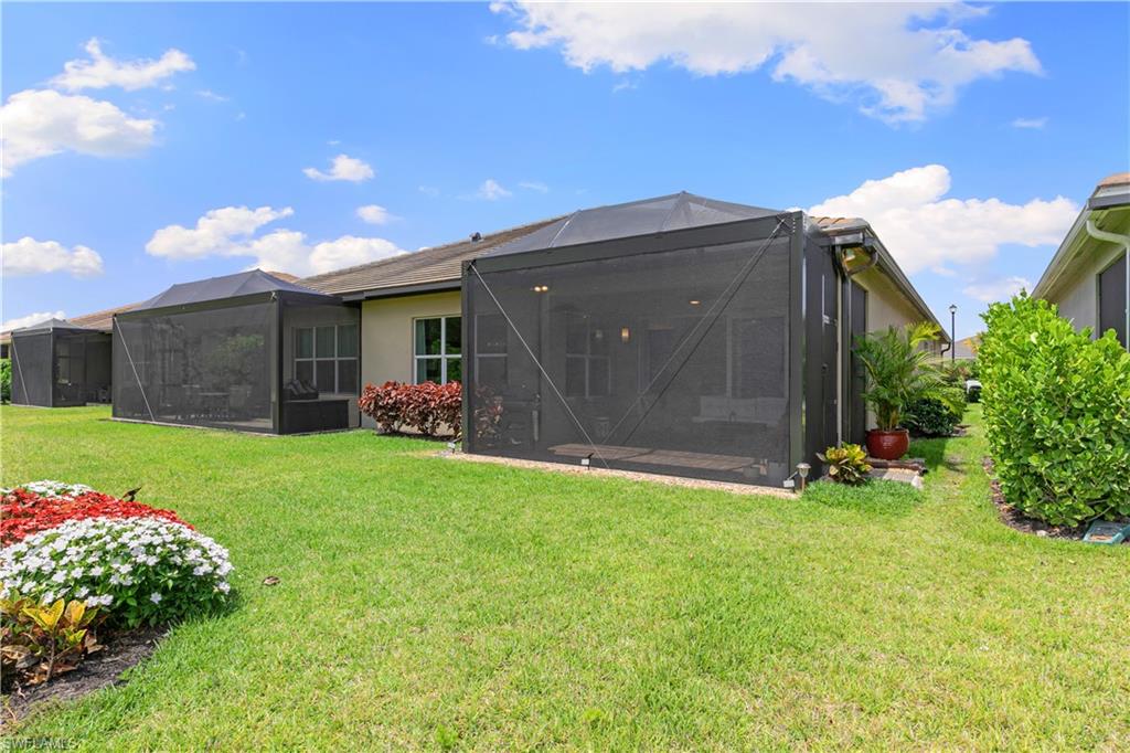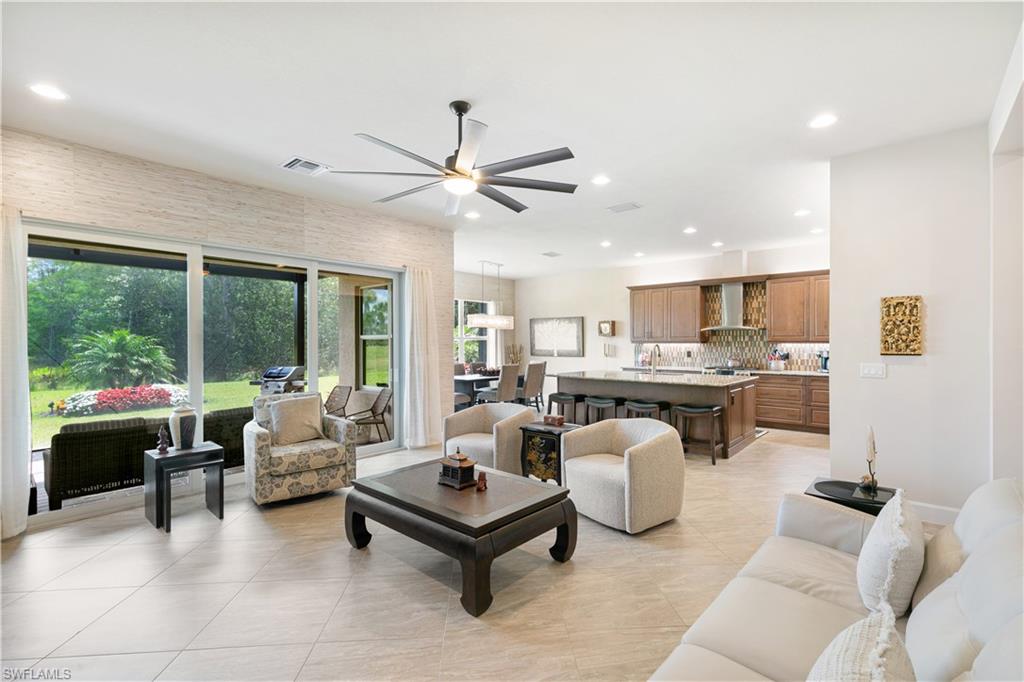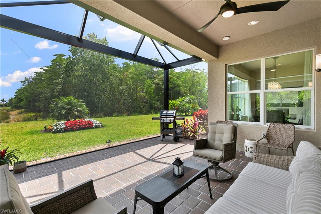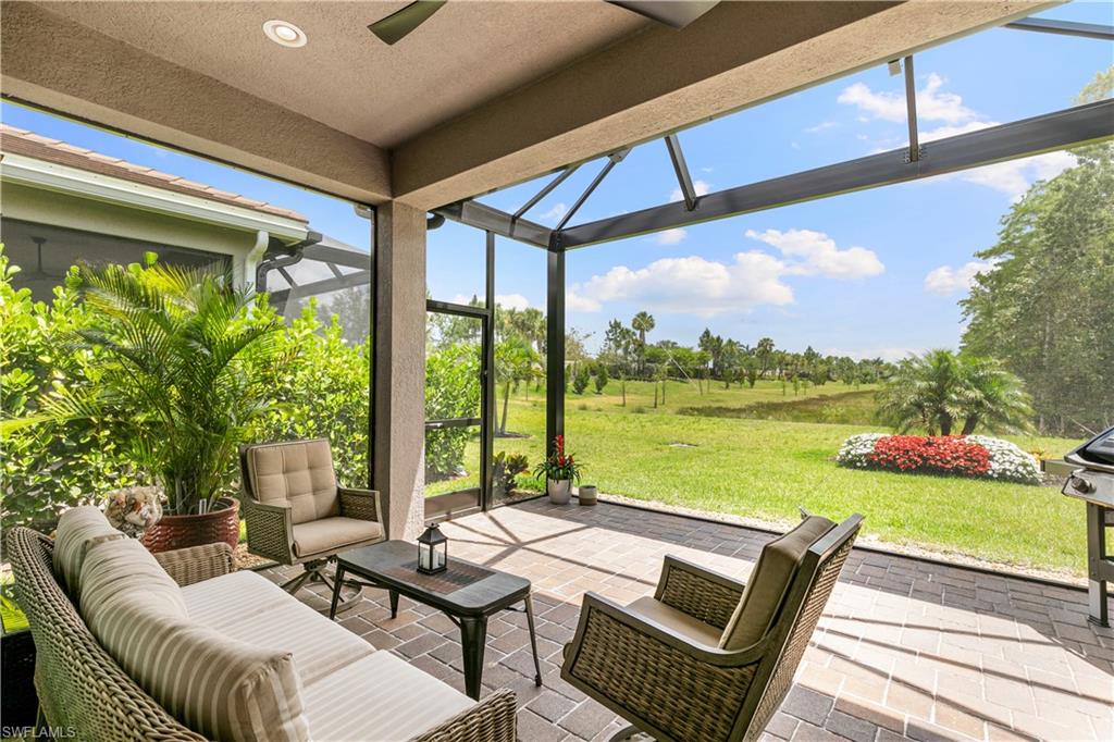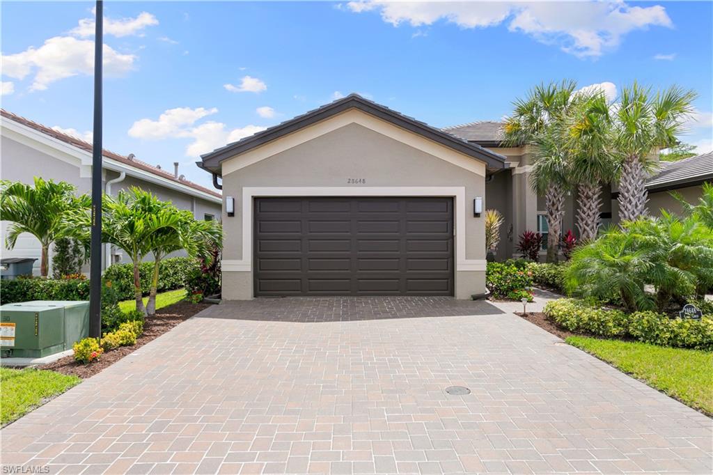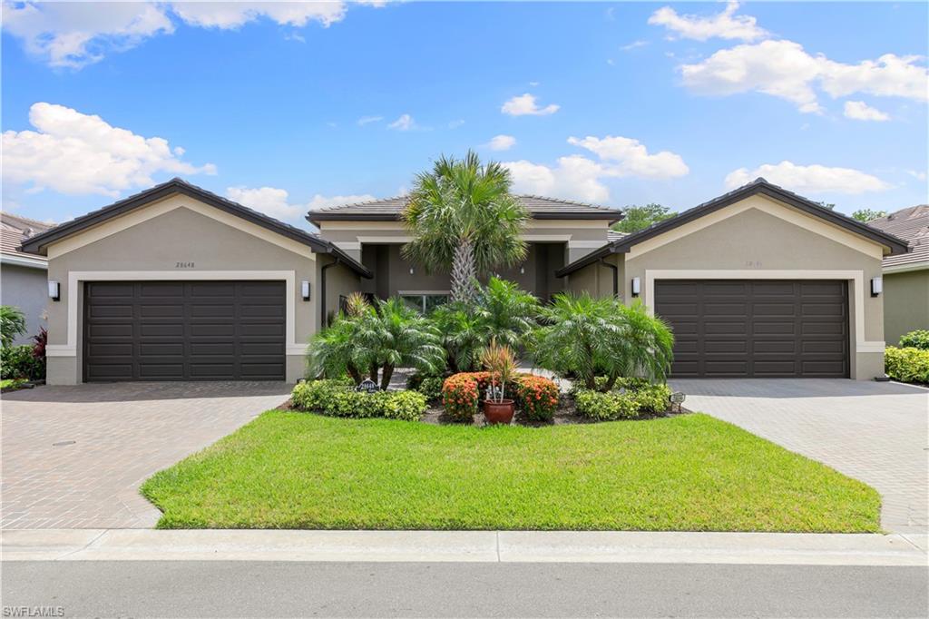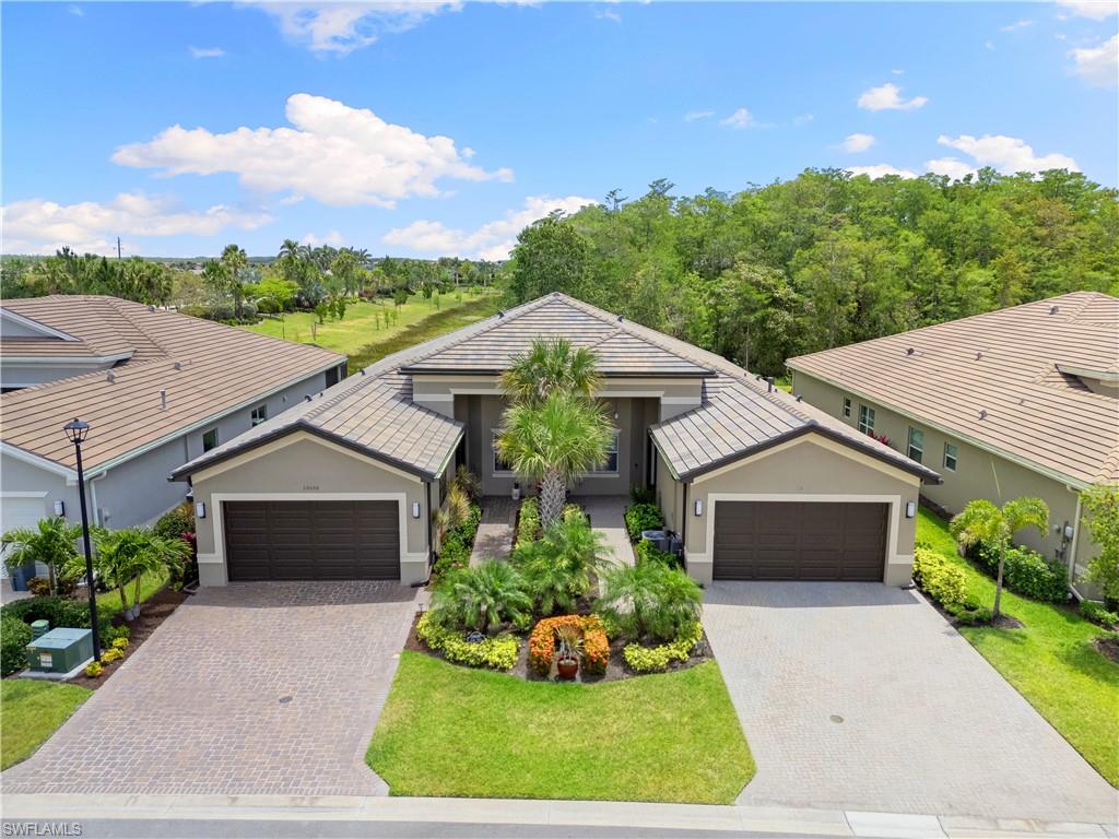 Step into pure perfection at Hampton Model Villa in the highly sought-after Valencia Bonita community! This stunning, model-like villa offers 2 bedrooms, 2 baths, a versatile den, and a convenient 2-car garage. Prepare to be wowed by the tons of upgrades thoughtfully incorporated throughout this immaculate home. The heart of this villa is undoubtedly the outstanding oversized kitchen island, a true centerpiece for entertaining and everyday living. Culinary enthusiasts will adore the gourmet kitchen, complete with sleek gas appliances and an abundance of storage, including all pull-out drawers throughout with soft-close cabinets and drawers. Inside, you'll appreciate the attention to detail, from the laundry room with cabinets and a laundry sink for added functionality to the stylish epoxy flooring in the garage. The interior boasts elegant 36" tile laid on the diagonal, upgraded window treatments, and sophisticated seagrass wallpaper, creating a warm and inviting ambiance. Enjoy energy efficiency and endless hot water with the tankless hot water heater. The impact glass windows and doors not only enhance security but also contribute to a quiet and comfortable living environment. One of the most desirable features of this property is the backyard view with no rear houses, offering exceptional privacy and tranquility. Extend your living space outdoors with a convenient connection hook up on the lanai for a gas grill, perfect for enjoying Florida's beautiful weather. Peace of mind comes standard with a generator and hurricane windows providing exceptional protection. Indulge in the one-of-a-kind resort-style amenities offered by Valencia Bonita is a 55 & Up Community and grants you access to a premier 45,000-square-foot clubhouse and luxe lifestyle with resort-style pools, lap and resistance pools, a full-service spa, fitness center with 40-plus weekly classes, indoor/outdoor dining, and a theater for Broadway-style shows. Stay active with tennis, pickleball, bocce, a dog park, and dozens of social clubs tailored to your lifestyle. Just minutes from golf courses, sandy beaches, I-75, Naples, RSW Airport and Fort Myers, this home offers the ideal blend of luxury, privacy and community living. Schedule your private showing today and experience the vacation-inspired lifestyle Valencia Bonita has to offer!