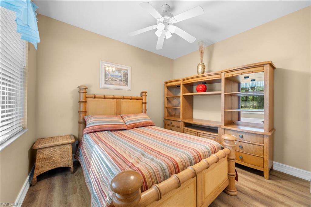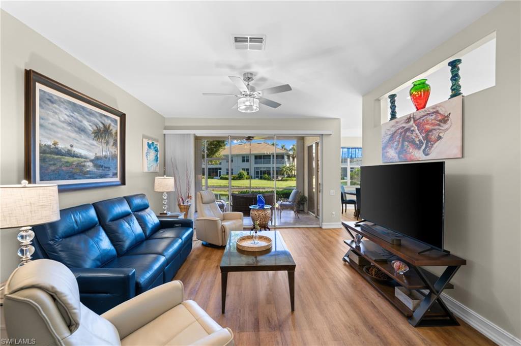 Prime Location • Turn-Key Furnished • Incredible Value • Positioned on one of the most desirable lots in Tarpon Cove, this beautifully updated first-floor end unit offers rare privacy with an expansive side yard and serene pond views with a water fountain feature out back. Offered turn-key furnished with designer pieces from Stickley, Fjords, and Divani—including power reclining sofas and loungers—this residence is the perfect blend of luxury, comfort, and effortless living. A private entry breezeway with newly installed porcelain tile sets the tone, leading into an inviting interior with warm vinyl plank flooring throughout. The open floor plan includes two bedrooms, two full bathrooms, and a versatile den with a large closet—ideal for use as a third bedroom, office, or media space. The updated kitchen and primary bath feature granite countertops, custom lighting, and quality finishes. Storm shutters on all windows and the fully tiled lanai offer peace of mind. Tarpon Cove is a gated, west-of-41 community with lush landscaping, three resort-style pools, a spa, and community clubhouse. Residents enjoy easy access to the Gulf—bikeable to the beach—and are just minutes from the vibrant shops and restaurants of Mercato. Proximity to the newly developed Kinsale Golf Club adds even more value and lifestyle appeal. With no history of flooding or water intrusion, this meticulously maintained "storm-surge safe" property is move-in ready and priced to sell. Rarely does a lot and location like this become available—schedule your private showing today.