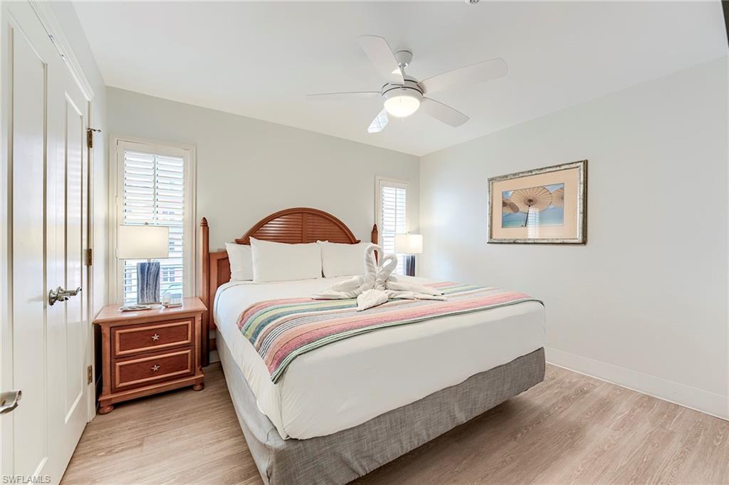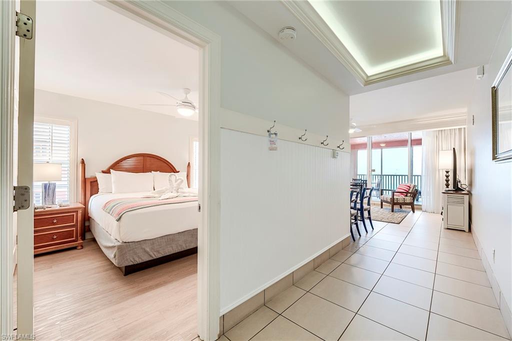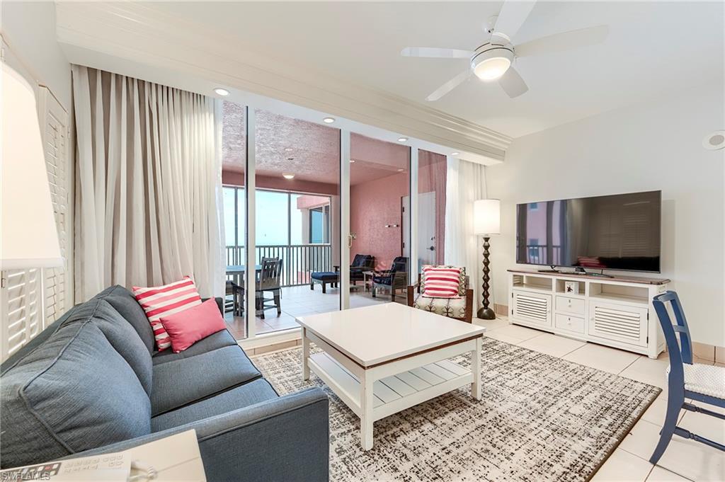 Enjoy panoramic Gulf views from this 4th-floor condo in the Captiva Villas at Pink Shell Resort. This beachfront unit includes two private lanais—one overlooking the Gulf of Mexico and the other facing the back bay and marina. The kitchen features granite countertops and white cabinetry. The bedroom offers a king bed, and the living area includes a sleeper sofa and one flat screen TV. The bathroom, located off the hallway, includes a walk-in shower and provides access to the rear lanai. Owners enjoy access to resort amenities including three pools, a spa, fitness center, game room, marina, and on-site dining. The on-site management company provides carefree ownership through a professional rental program. Owner usage is limited to 14 days in-season and 14 days off-season. Owners may also request access to the amenities for personal use with prior approval. Unit is turnkey furnished.
