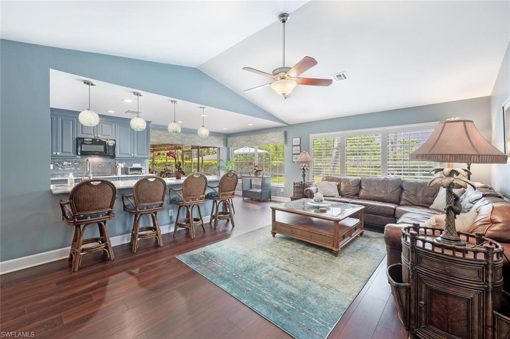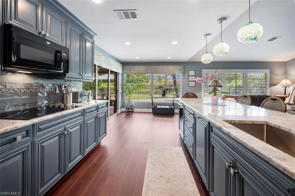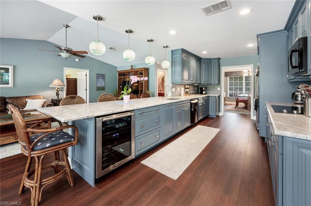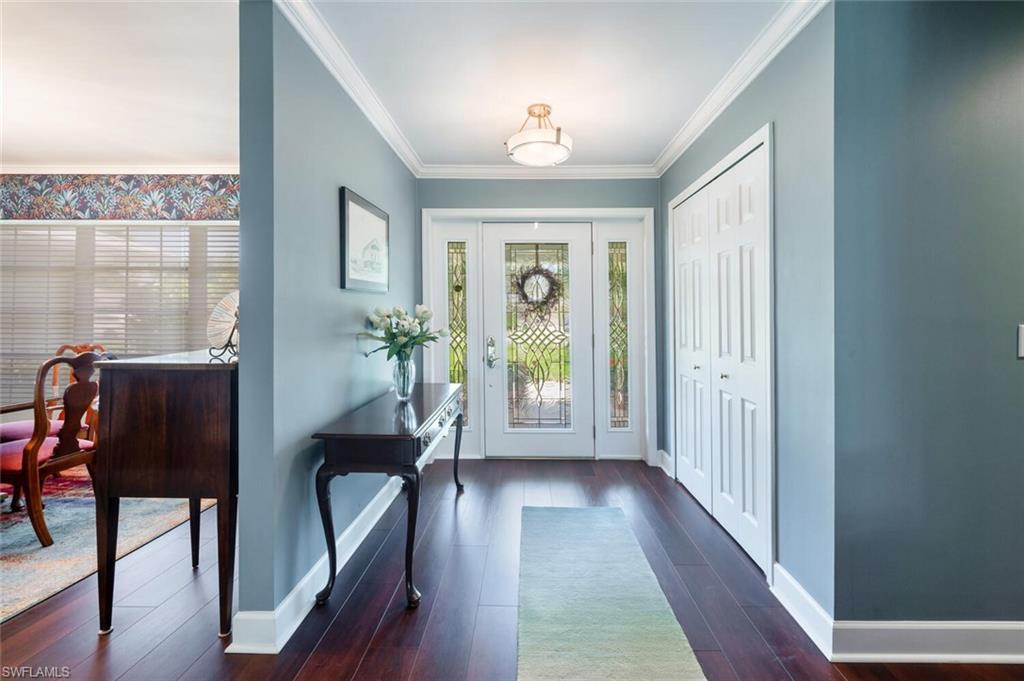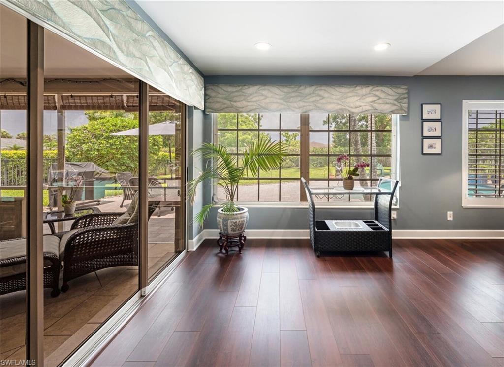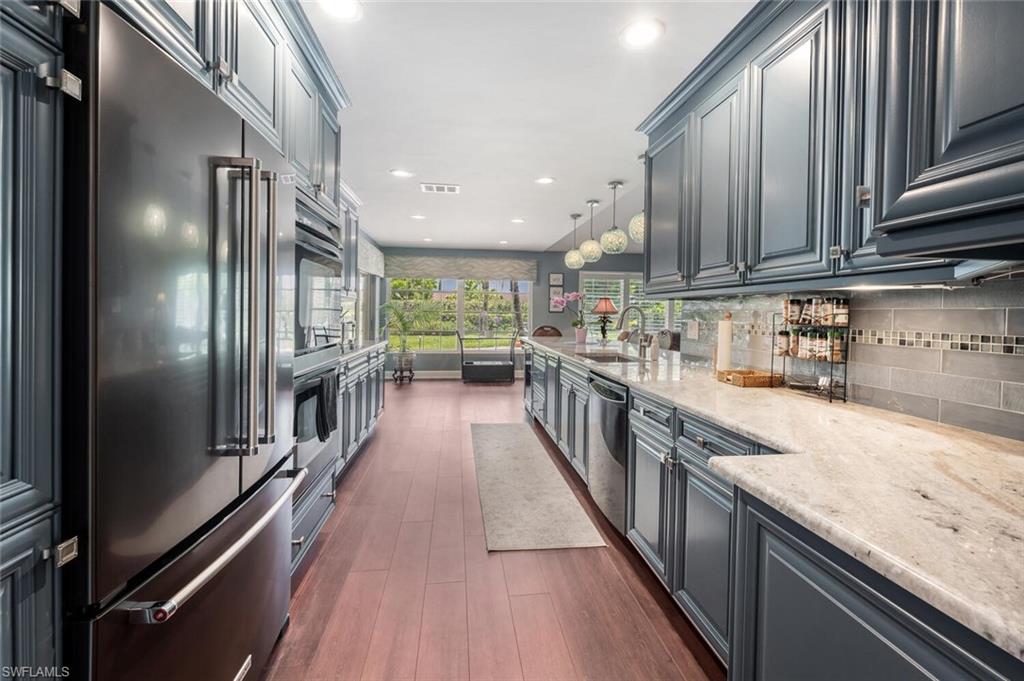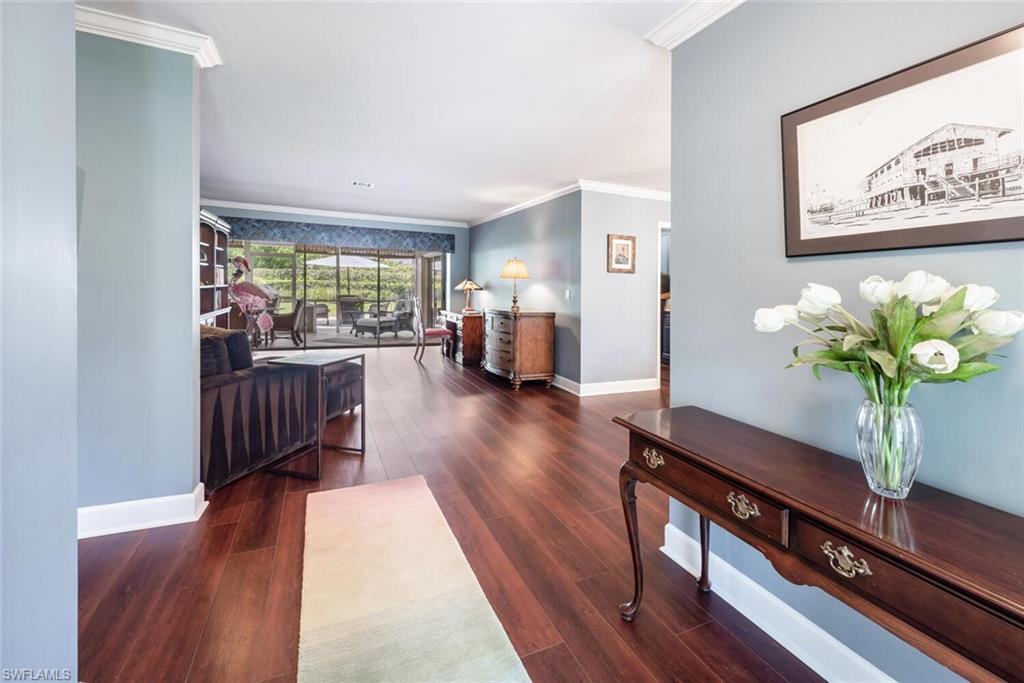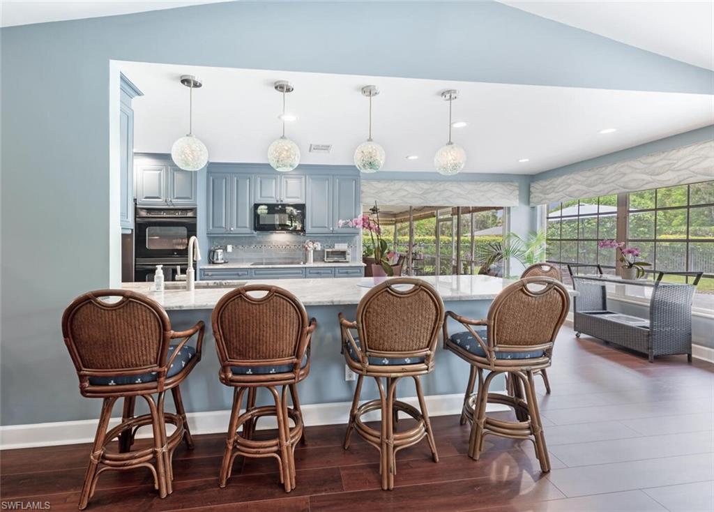 This beautiful three bedroom, two and one-half bath pool home within Victoria Park features a gorgeous refashioned kitchen finished with custom cabinetry with dolomite counters complimented by a designer tile backsplash, stainless appliances with double ovens including a convection oven, large center island with wine cooler. Throughout this home you will find elegant designer finishes of LVP flooring, crown molding, plantation shutters & designer lighting. Your private outdoor retreat awaits where a sparkling pool with sun shelf and waterfall feature is surrounded by lush, colorful foliage, timed landscape lighting, spring-fed water irrigation system and a fenced backyard. The setting is both tranquil and picturesque. This wonderful family neighborhood includes community amenities such as a pool, tennis courts, basketball and park. Prime North Naples location within minutes everything Mercato, shopping, dining & beaches. A+ school district, Pelican Marsh Elementary, North Naples Middle and Barron Collier High. This property IS NOT located in a flood zone!