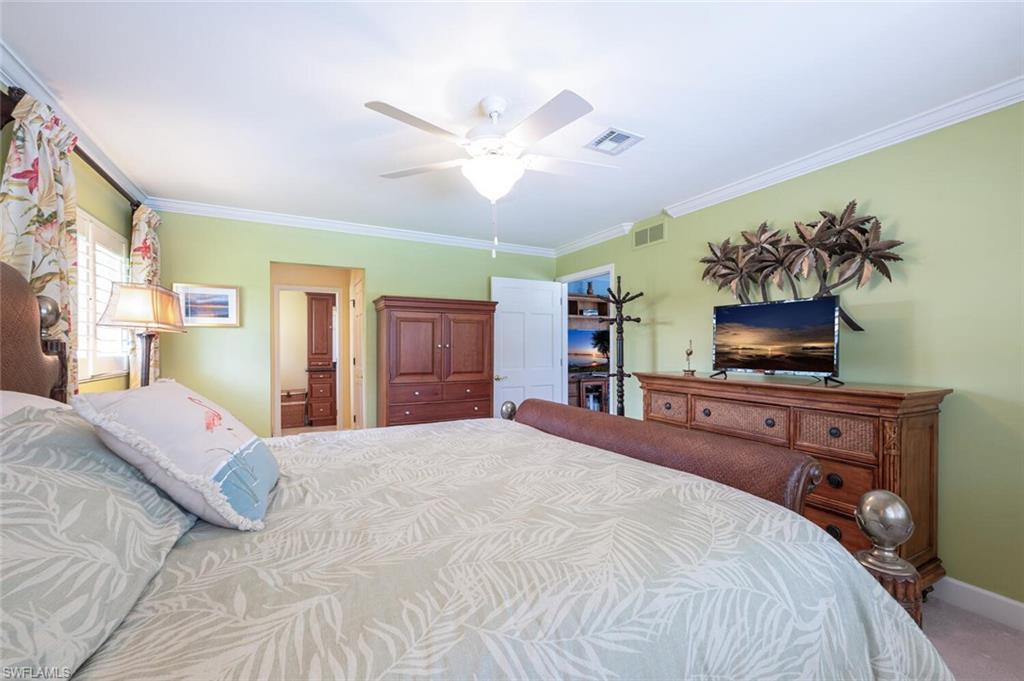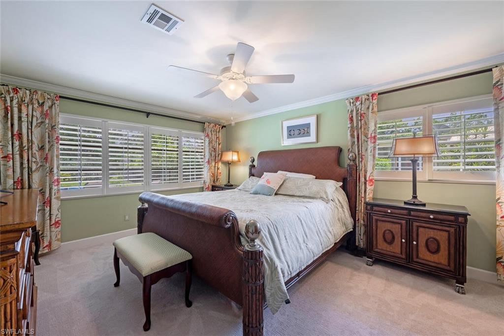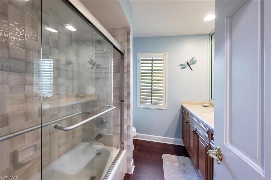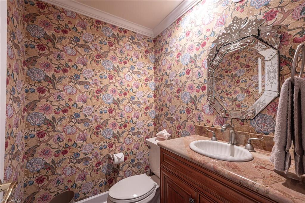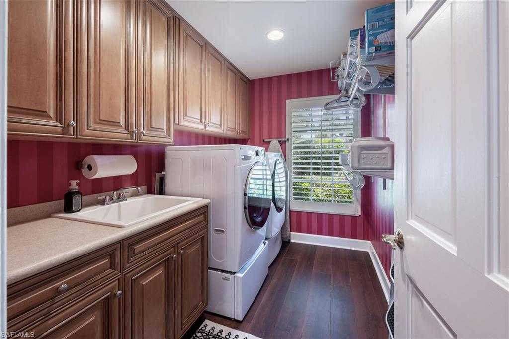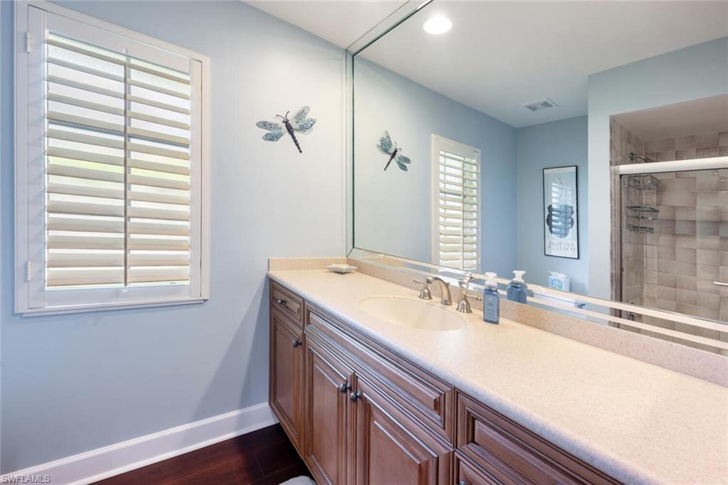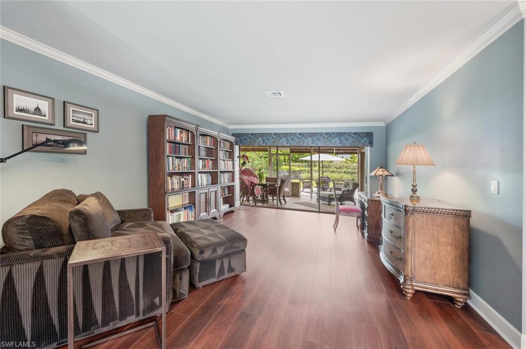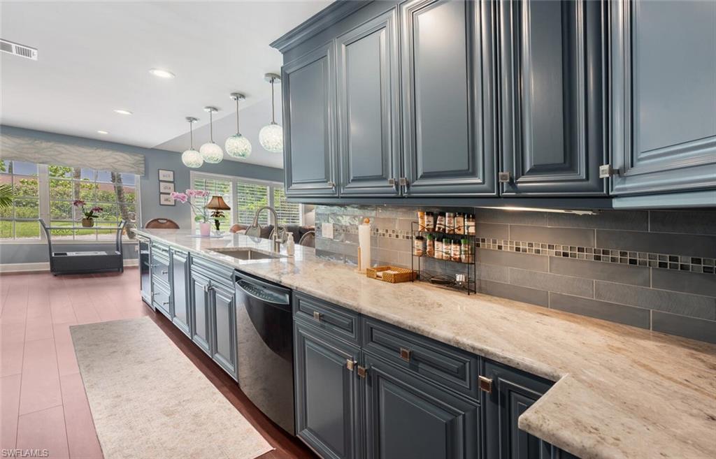 This beautiful three bedroom, two and one-half bath pool home within Victoria Park features a gorgeous refashioned kitchen finished with custom cabinetry with dolomite counters complimented by a designer tile backsplash, stainless appliances with double ovens including a convection oven, large center island with wine cooler. Throughout this home you will find elegant designer finishes of LVP flooring, crown molding, plantation shutters & designer lighting. Your private outdoor retreat awaits where a sparkling pool with sun shelf and waterfall feature is surrounded by lush, colorful foliage, timed landscape lighting, spring-fed water irrigation system and a fenced backyard. The setting is both tranquil and picturesque. This wonderful family neighborhood includes community amenities such as a pool, tennis courts, basketball and park. Prime North Naples location within minutes everything Mercato, shopping, dining & beaches. A+ school district, Pelican Marsh Elementary, North Naples Middle and Barron Collier High. This property IS NOT located in a flood zone!
