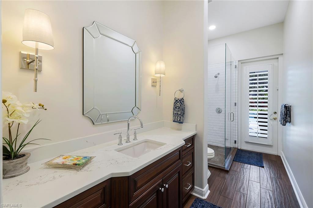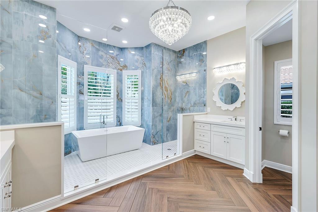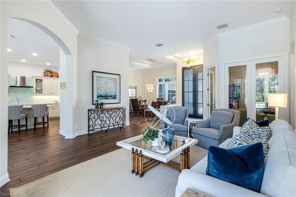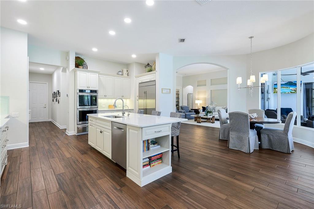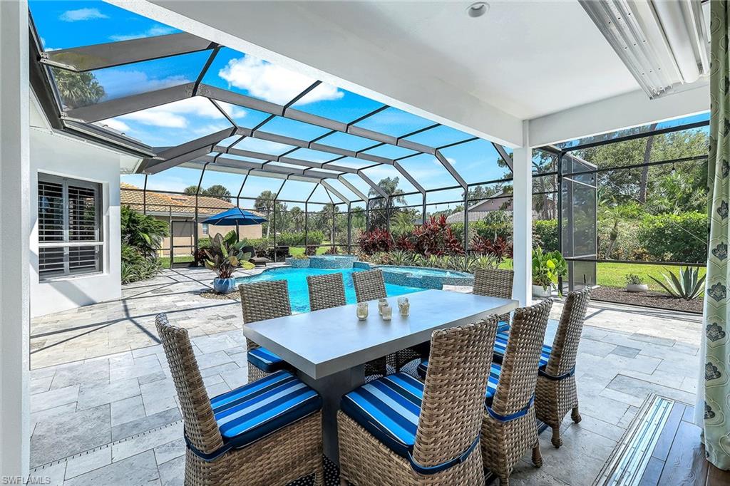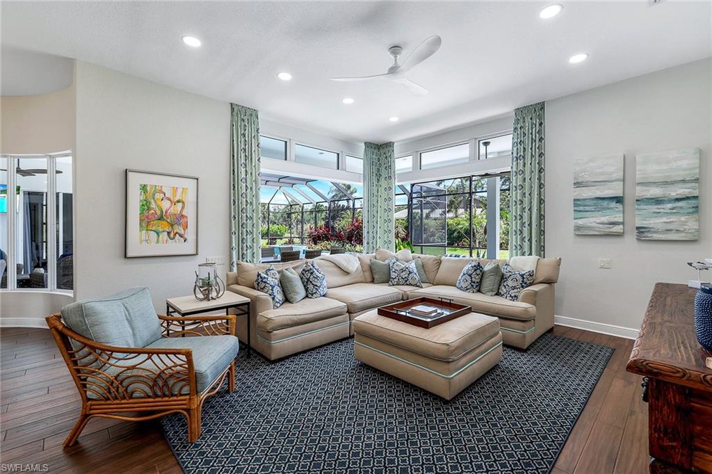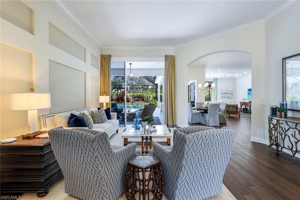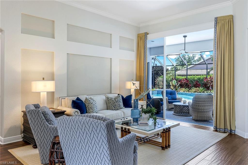 This reimagined residence blends sophisticated design with modern convenience in one of Southwest Florida’s most prestigious communities. Offering four bedrooms, a private den, and four full baths across 3,401 square feet of air-conditioned space, over 6,600 in total, every inch of this home has been thoughtfully curated for elevated living. From the moment you enter, the home’s reinspired layout and curated finishes evoke a single sentiment: Hello, gorgeous. New wood plank tile flows seamlessly throughout, complementing plantation shutters and expansive corner sliding glass doors that connect to a lush lanai. The redesigned kitchen and guest baths, executed by Cornerstone Kitchens, showcase premium finishes, a reverse osmosis system and custom cabinetry. The primary bath, redesigned by Alvarez Construction, exemplifies a commitment to elevated living with timeless detail and refined craftsmanship. The spa-inspired primary suite features a herringbone-patterned floor, wet-room design with multiple showers, a custom tub set in a bay window, dual vanities, a Toto toilet and a statement chandelier. Set within a quiet enclave framed by a serene lake on one end and a protected nature preserve on the other, the residence offers an intimate and peaceful setting, yet remains conveniently close to premier shopping, dining and cultural attractions. Exterior upgrades include a saltwater pool with full automation (resurfaced in 2023), outdoor kitchen, waterfall spa, new landscaping, and enhanced privacy. A new roof, hurricane-rated front windows, a whole-house water softener and new HVAC ensure turnkey peace of mind. In amenity-rich Pelican Landing with access to a private 34-acre Gulf-front Island beach, tennis, fitness, pickleball, kayaking, and optional golf memberships at The Colony Golf and Country Club or Pelican’s Nest Golf Club. Schedule your private showing today.