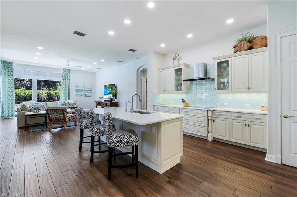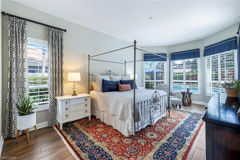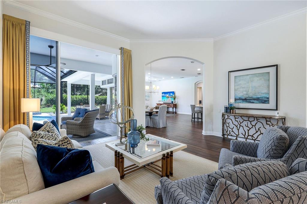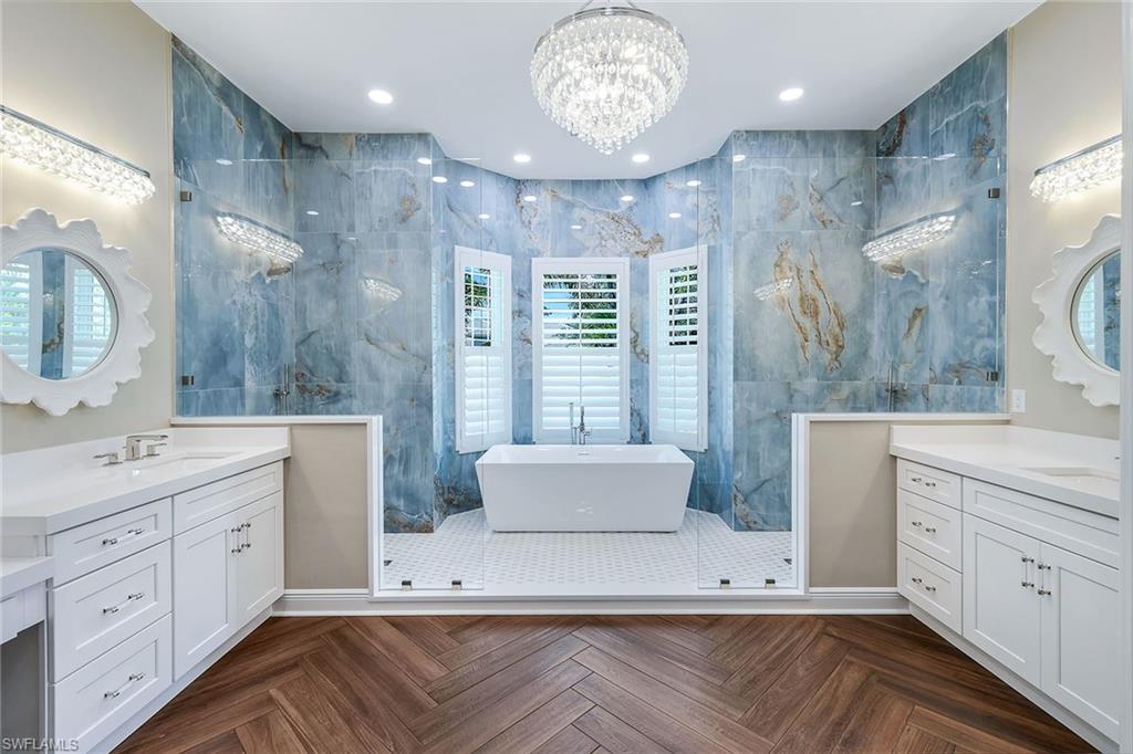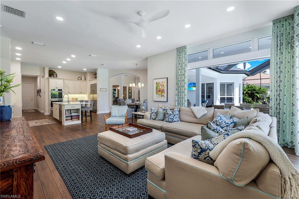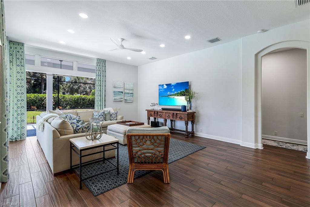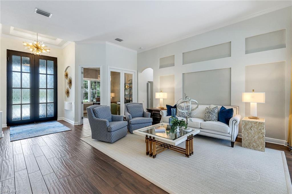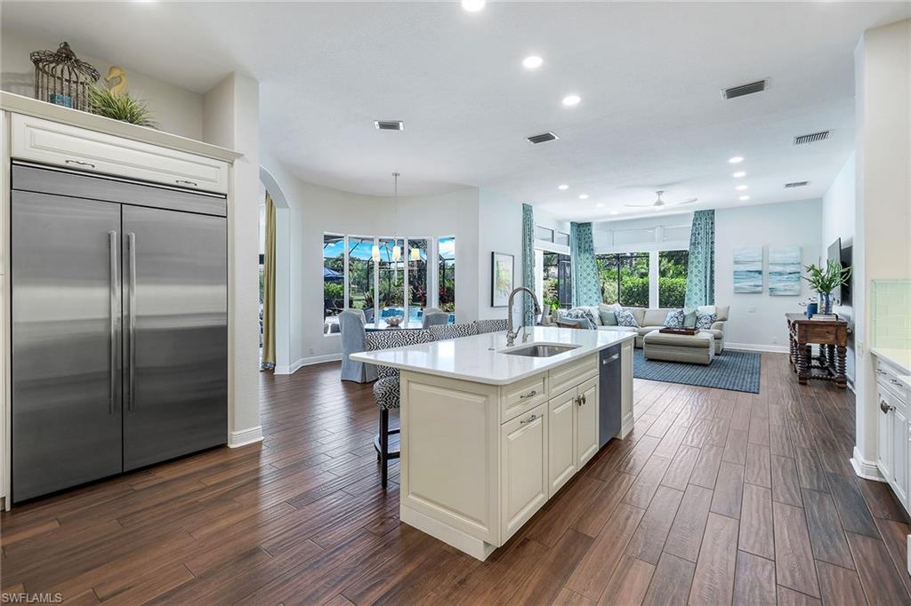 This reimagined residence blends sophisticated design with modern convenience in one of Southwest Florida’s most prestigious communities. Offering four bedrooms, a private den, and four full baths across 3,401 square feet of air-conditioned space, over 6,600 in total, every inch of this home has been thoughtfully curated for elevated living. From the moment you enter, the home’s reinspired layout and curated finishes evoke a single sentiment: Hello, gorgeous. New wood plank tile flows seamlessly throughout, complementing plantation shutters and expansive corner sliding glass doors that connect to a lush lanai. The redesigned kitchen and guest baths, executed by Cornerstone Kitchens, showcase premium finishes, a reverse osmosis system and custom cabinetry. The primary bath, redesigned by Alvarez Construction, exemplifies a commitment to elevated living with timeless detail and refined craftsmanship. The spa-inspired primary suite features a herringbone-patterned floor, wet-room design with multiple showers, a custom tub set in a bay window, dual vanities, a Toto toilet and a statement chandelier. Set within a quiet enclave framed by a serene lake on one end and a protected nature preserve on the other, the residence offers an intimate and peaceful setting, yet remains conveniently close to premier shopping, dining and cultural attractions. Exterior upgrades include a saltwater pool with full automation (resurfaced in 2023), outdoor kitchen, waterfall spa, new landscaping, and enhanced privacy. A new roof, hurricane-rated front windows, a whole-house water softener and new HVAC ensure turnkey peace of mind. In amenity-rich Pelican Landing with access to a private 34-acre Gulf-front Island beach, tennis, fitness, pickleball, kayaking, and optional golf memberships at The Colony Golf and Country Club or Pelican’s Nest Golf Club. Schedule your private showing today.