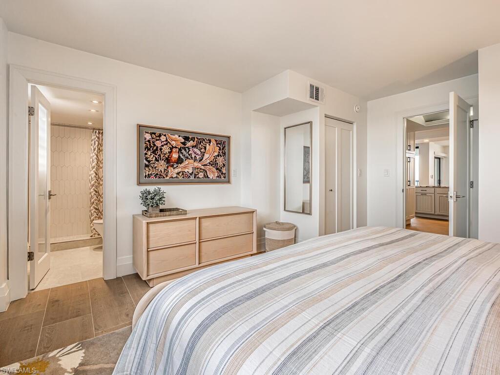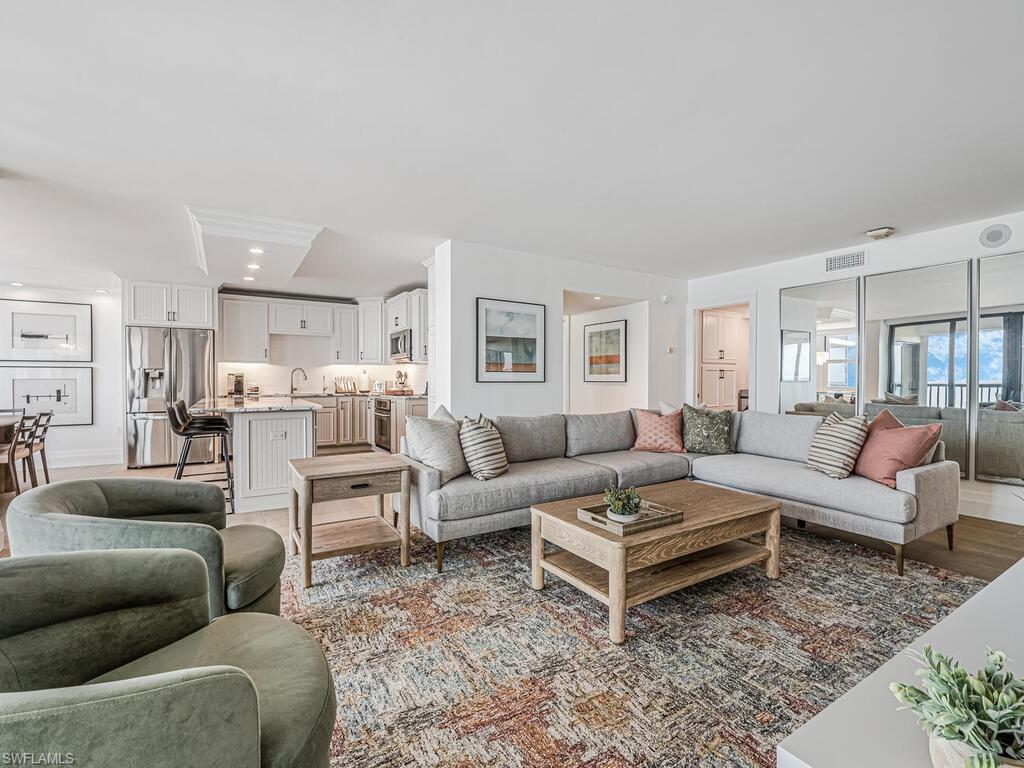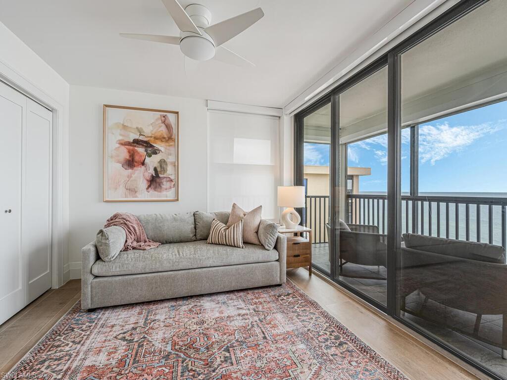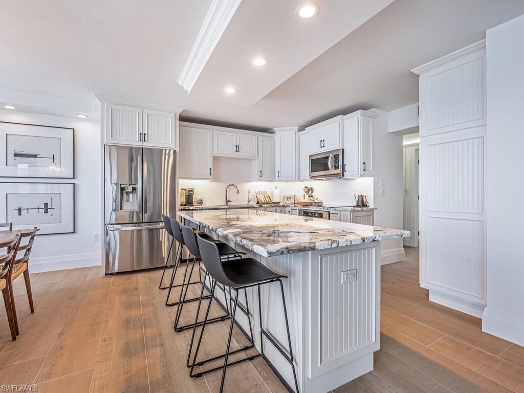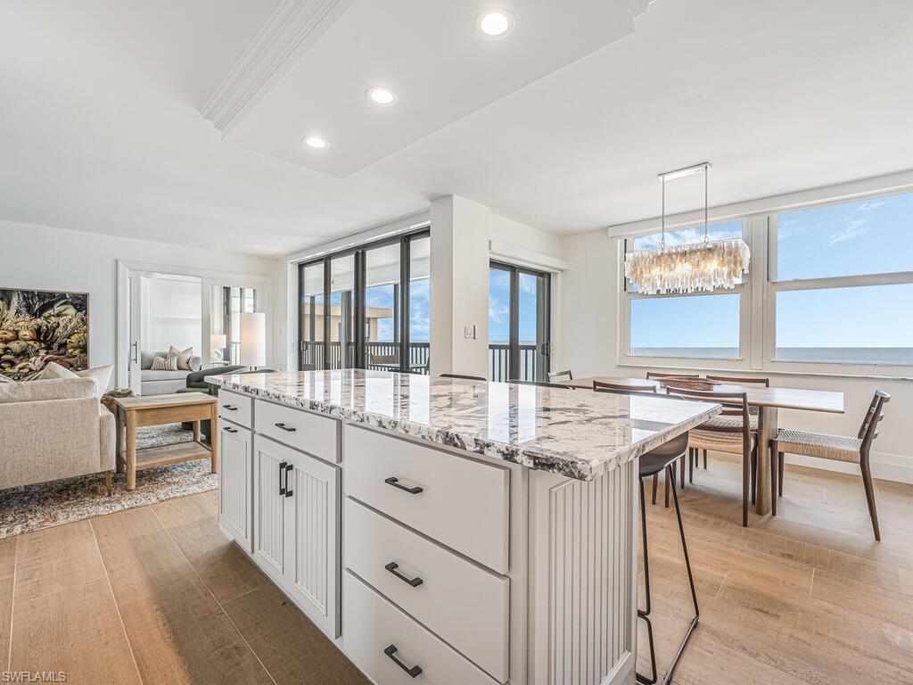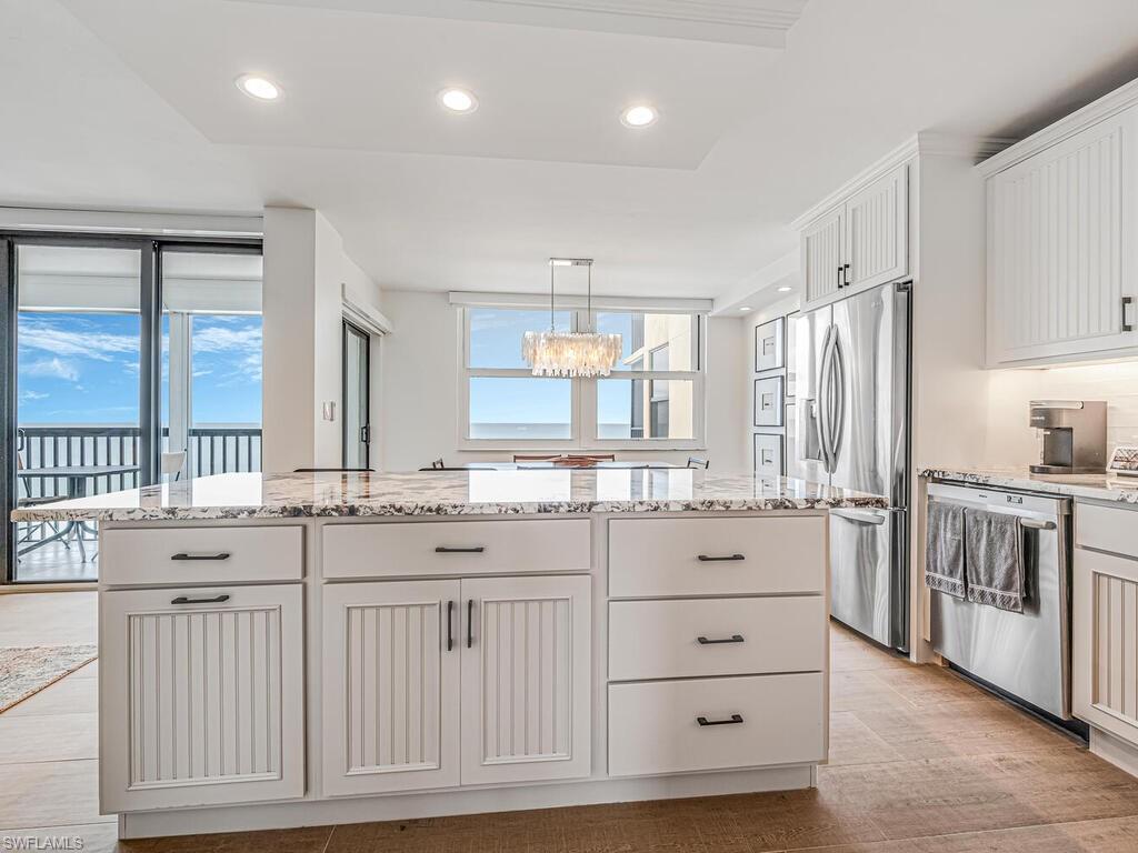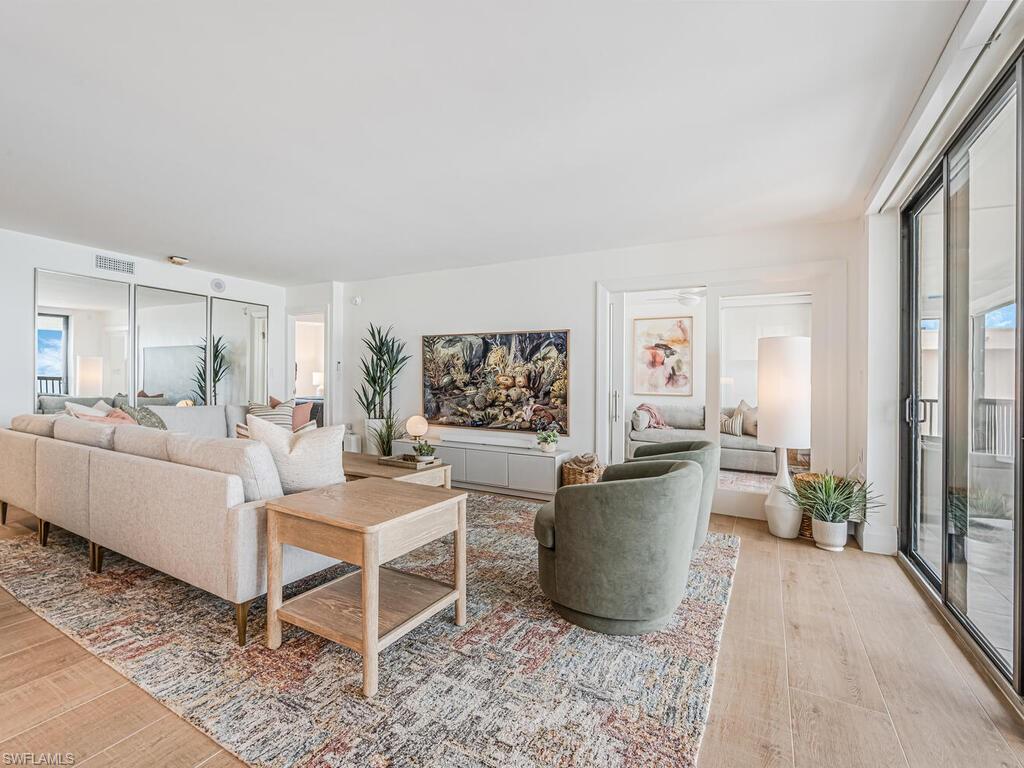 Exquisite turnkey-furnished, beachfront end-unit in the coveted Seawatch, offering breathtaking west and southwest views of pristine sunsets and stunning sunrises. Recently remodeled, this beautiful 3-bedroom condo features private bathroom access from each bedroom, with 2 elegantly updated bathrooms. Enjoy the luxury of new, barefoot-friendly tile flooring throughout, custom window coverings, motorized Hunter Douglas blinds, and 3 sleek Frame TVs. The open-concept kitchen boasts induction stove top, ample cabinetry, soft-close drawers, stone counters and specialty compartments, ideal for seamless meal prep or entertaining family and guests. The primary suite features a walk-in closet with custom cabinets, east-facing windows, sliding glass doors, and a private lanai, perfect for sunrise and savoring morning coffee with serene views of Vanderbilt Lagoon. Designed for peace of mind, the unit is equipped with hurricane-rated glass and electric shutters. Modern upgrades include a newer dishwasher, new washer and dryer, a 1.5-year-old HVAC system, and a water heater replaced just one year ago. Also features a lockable storage closet great for owner’s effects during rentals. The Seawatch building shines with a fully remodeled lobby, common areas, swimming pool, ba"NOTE: Building is in process of installing brand new roof which should be completed shortly." Ideal for both end users and investors, the property allows monthly rentals. Located just five buildings north of Vanderbilt Beach’s public access point, Seawatch offers a tranquil beach experience, steps from the Turtle Club, La Playa, and Ritz-Carlton beachfront dining. Embrace coastal living at its finest in this meticulously updated retreat.