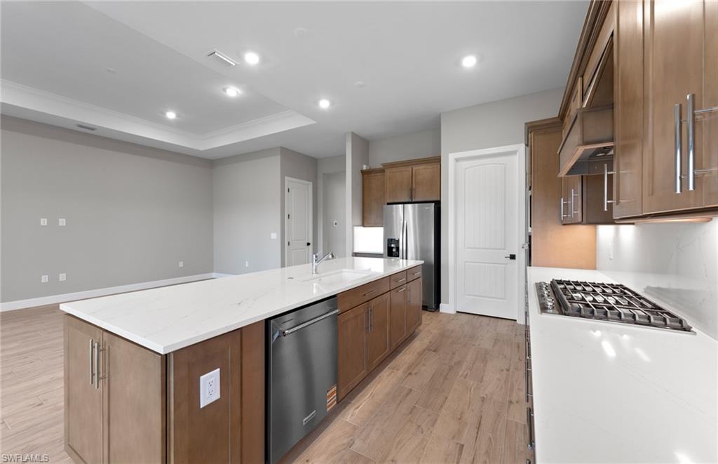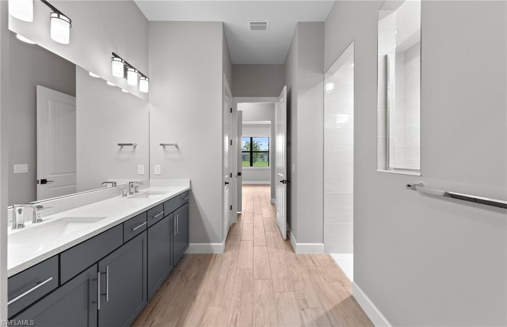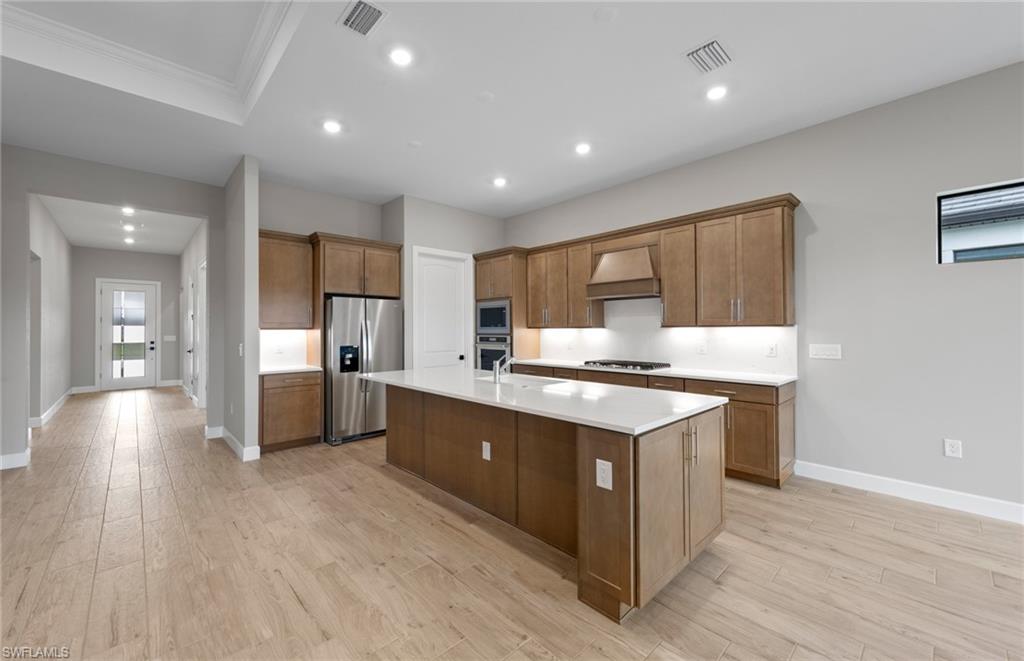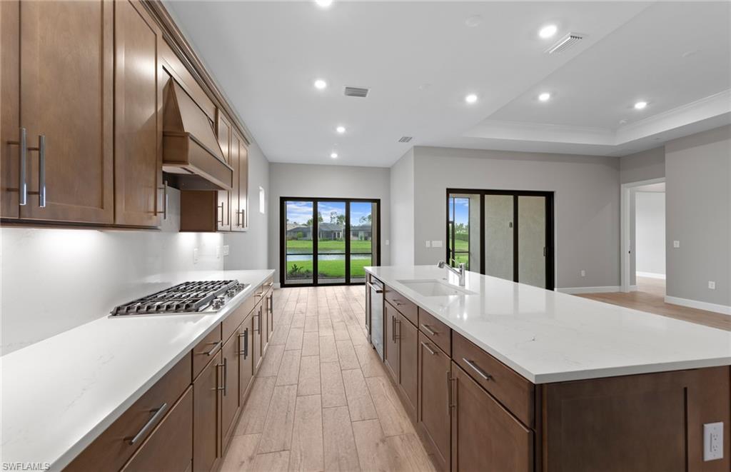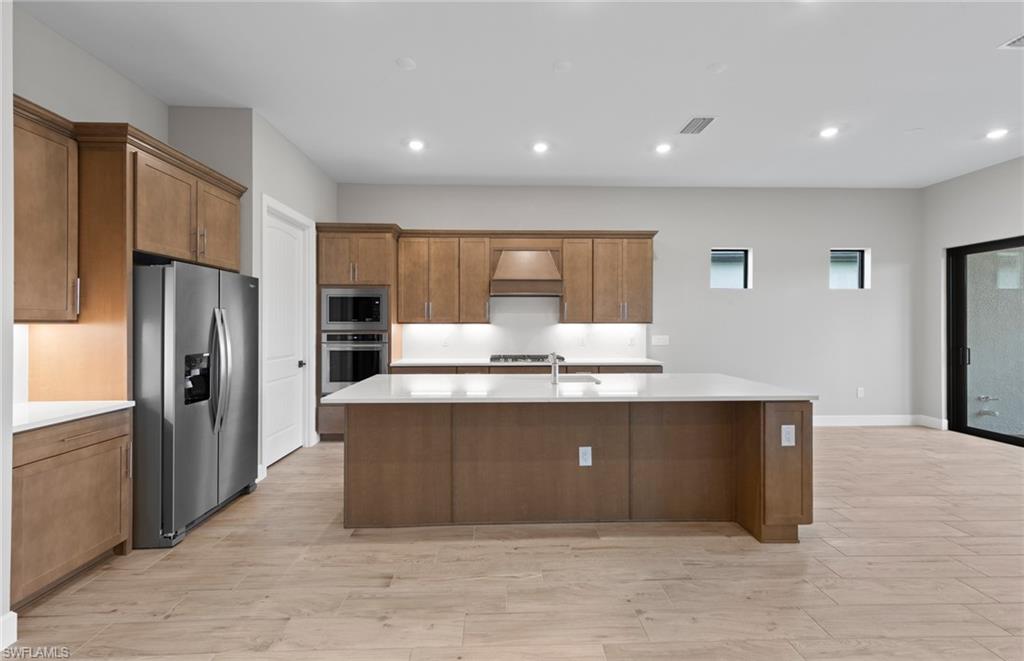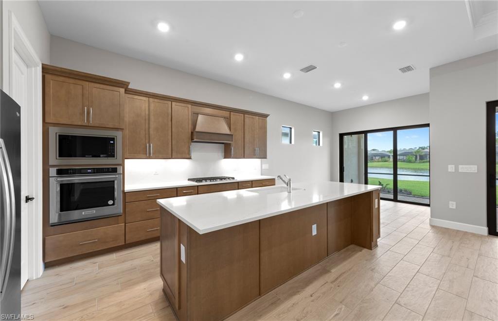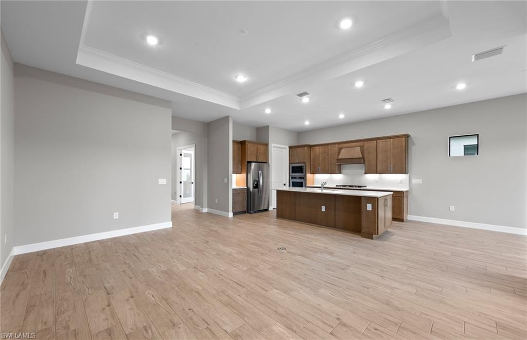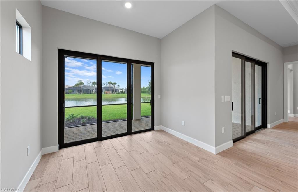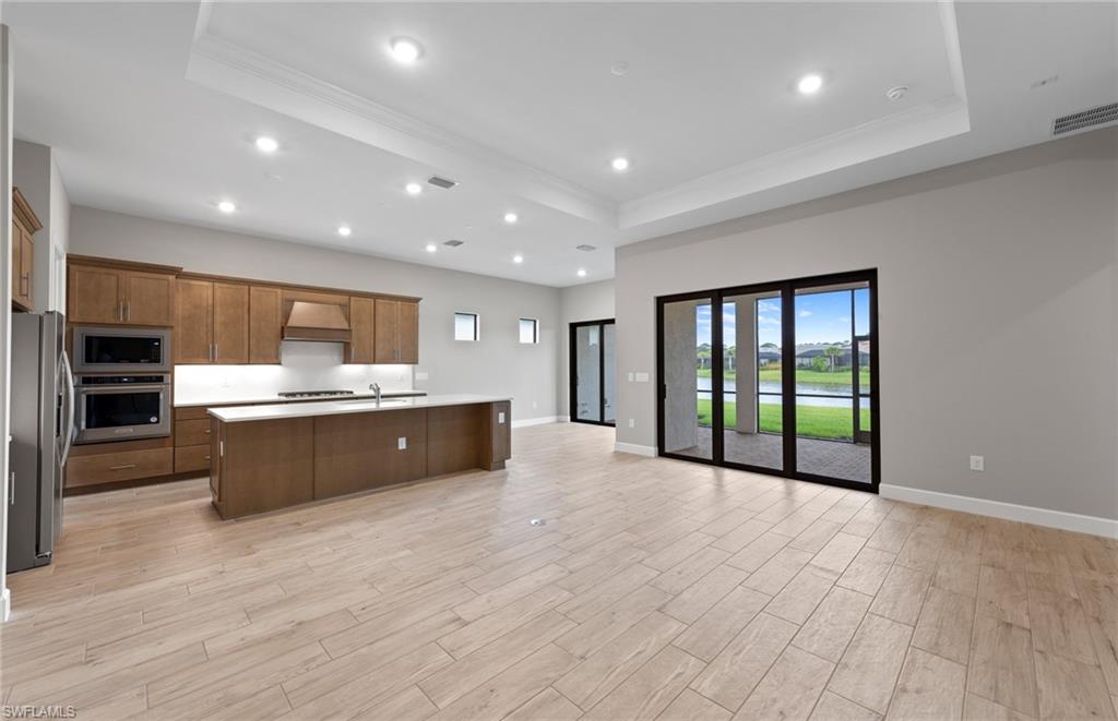 Now available and move-in ready, the newly constructed Prestige floorplan in Terreno by DiVosta offers 2 spacious en suite bedrooms, 2.5 bathrooms, a den, and an oversized garage—perfectly blending luxury, functionality, and style. Designed with open-concept living in mind, this home features an extended covered lanai with outdoor kitchen pre-plumb and a sliding glass door at the café area, ideal for indoor-outdoor entertaining. Interior upgrades include built-in stainless steel kitchen appliances, a designer cabinet hood, quartz countertops, and elegant two-tone paint. Tray ceilings enhance the gathering room, flex space, and owner’s suite, adding architectural interest and sophistication. The owner’s suite is a true retreat with a large walk-in shower, while the laundry room offers built-in cabinets and countertop workspace. Additional finishes include 8"x32" tile flooring throughout, 8' interior doors, epoxy-coated garage flooring, and a tankless water heater for added efficiency. Terreno by DiVosta is a premier gated community in Naples offering a true resort-style lifestyle. Residents enjoy access to a 15,000 sq. ft. grand clubhouse with a large event space and catering kitchen, a state-of-the-art fitness center, exercise studio, resort-style pool with lap lanes and a heated spa, and numerous recreational amenities. These include 8 pickleball courts, 2 tennis courts, a playground, fire pit lounge, two dog parks, and an on-site full-service restaurant and bar & grill. The community is also adjacent to an 18-hole public golf course and features a dedicated food truck drive-up area.