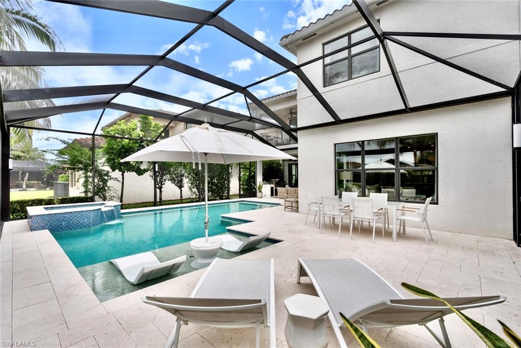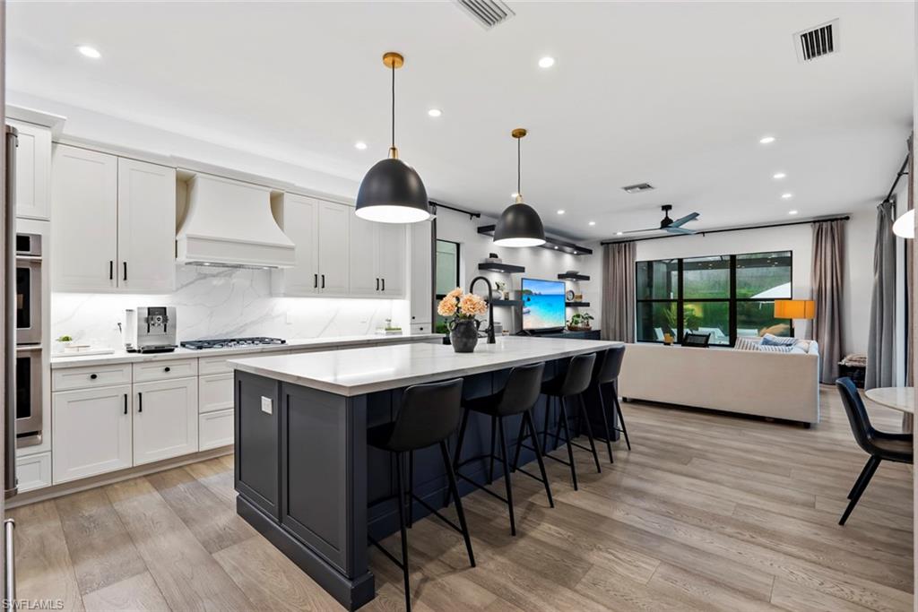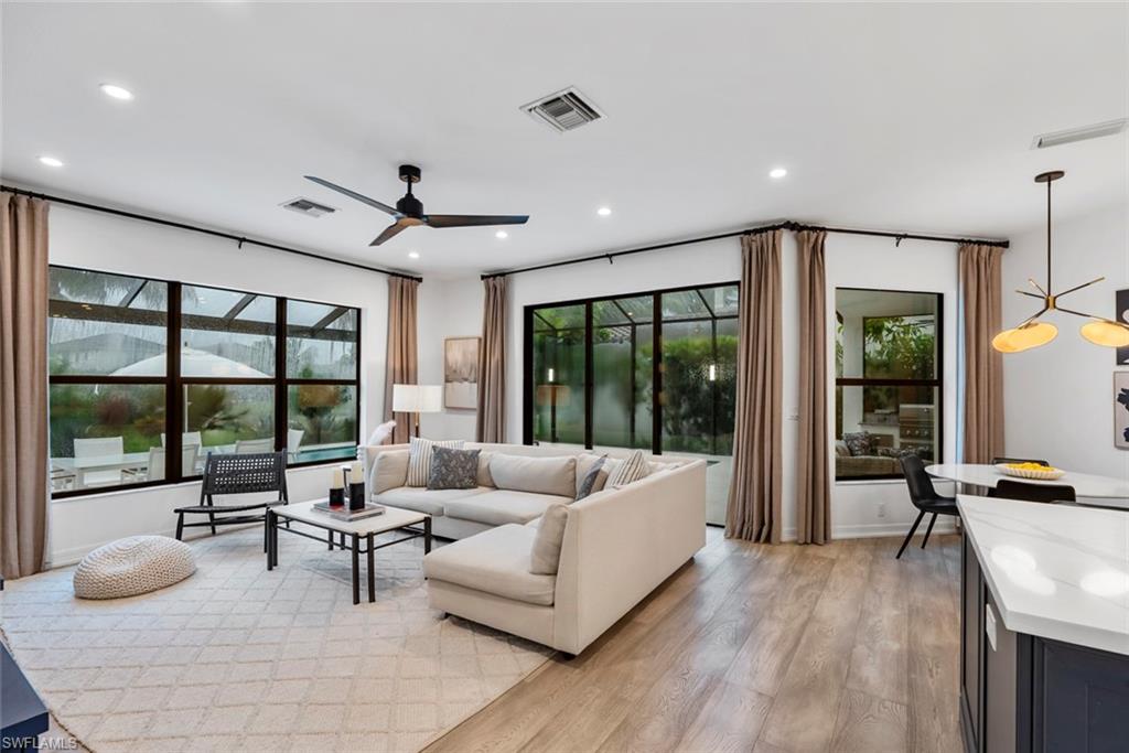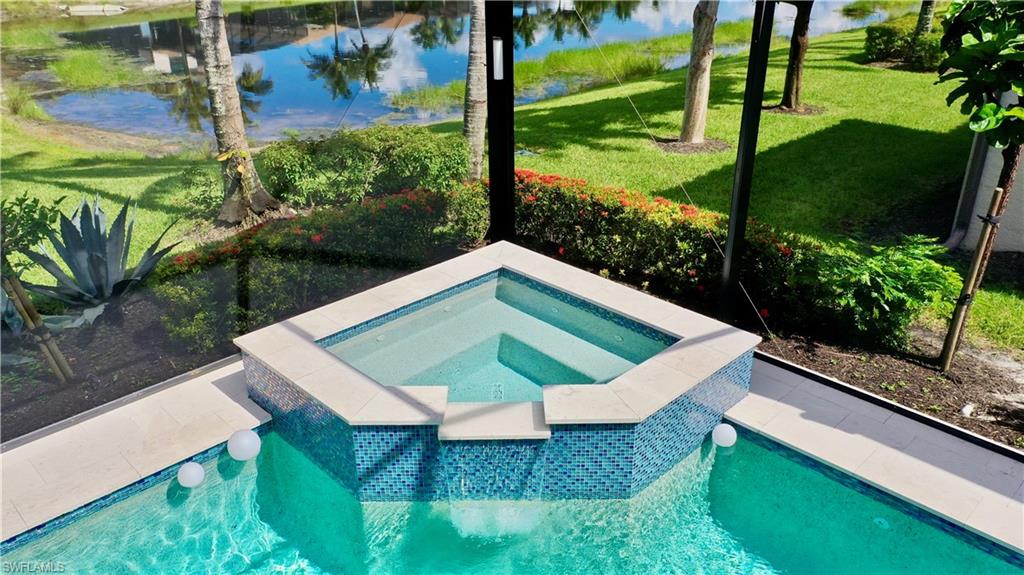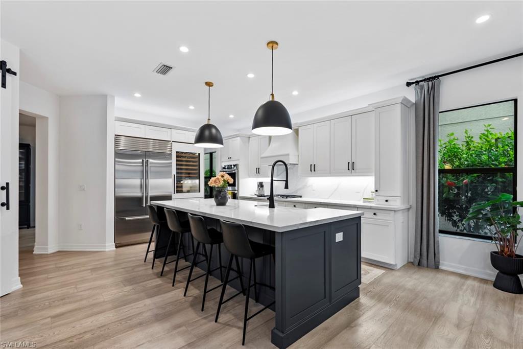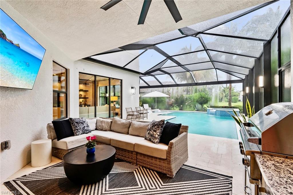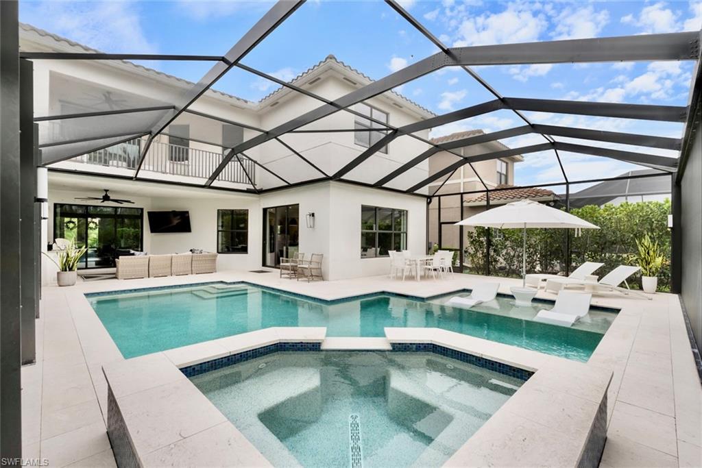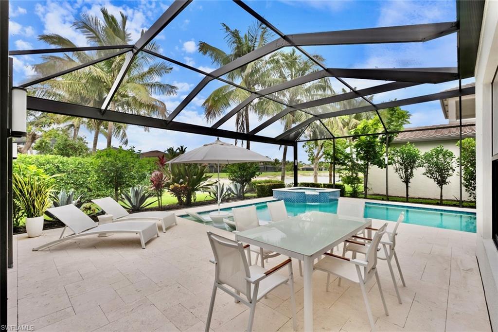 Welcome to your dream home—an elegant retreat designed for modern family living in one of Naples’ most desirable communities. Tucked away on a quiet, low-traffic street, this upgraded residence occupies a premium lot with serene pond views and exceptional privacy. It blends refined finishes with family-friendly comfort, creating a sophisticated yet inviting atmosphere. Inside, wide-plank white oak hardwood floors flow seamlessly throughout, including the laundry and mudroom, adding warmth and continuity. Custom stair rails, elevated ceiling fans, and designer lighting set a polished tone, while tasteful wallpaper accents in the office, dining room, and baths lend unique character. The fully remodeled 2022 kitchen is the centerpiece featuring a Sub-Zero 42" refrigerator, 30" Sub-Zero wine tower with refrigerator/freezer drawers and ice maker, Monogram double oven, cooktop, drawer microwave, and dishwasher. A 10-foot quartz island with under-cabinet lighting, full quartz backsplash, and custom range hood make it perfect for everyday living and entertaining. Functionality is elevated with five custom built-ins in the living room, family room, mudroom, loft, and office/6th bedroom. Clever under-stair storage maximizes space, while the versatile den/6th bedroom adds flexibility. The primary suite offers a tranquil retreat with an upstairs veranda overlooking the pond. Outdoors, a 2021 saltwater pool and spa with massage jets for 6, panoramic screen enclosure, no-see um screen, set the stage for resort-style living. Travertine pavers, LED lighting, hidden drains, WiFi automation, dual heat sources, bubbler, umbrella, shallow deck, and a 4-filter water system, and auto-fill, ensure effortless enjoyment. The outdoor kitchen with Delta gas grill, refrigerator, and storage makes entertaining a delight. The garage is equally impressive: epoxy floors, overhead racks, heavy-duty shelving, an 11kWh EV charger, air conditioning, and insulated doors perfect for a gym, golf cart, workshop, simulator, or collectible car storage. Additional features include a whole-house natural gas generator, fiber optic internet, and dual hurricane-impact entry doors. Community amenities rival a resort: three heated pools (lap, kids, and resort-style with spa), clubhouse with gym, indoor basketball, game lounge, card room, pickleball, tennis, volleyball, and playground—all with low HOA fees. Located in an A-rated school district and close to beaches, shopping, dining, and the airport, this home offers the perfect blend of security, serenity, and style—with a touch of luxury and a vibrant sense of community.
