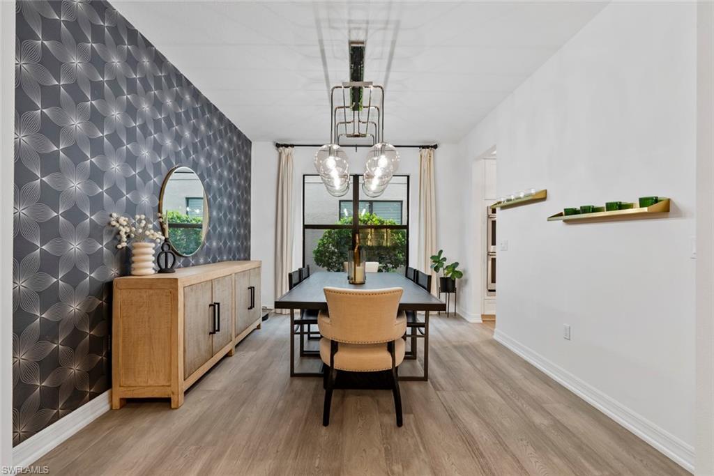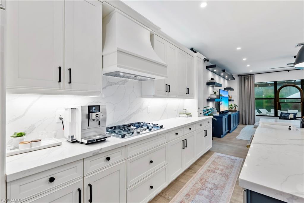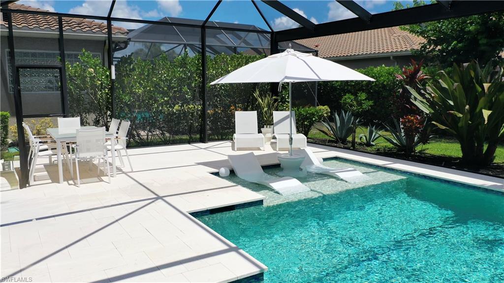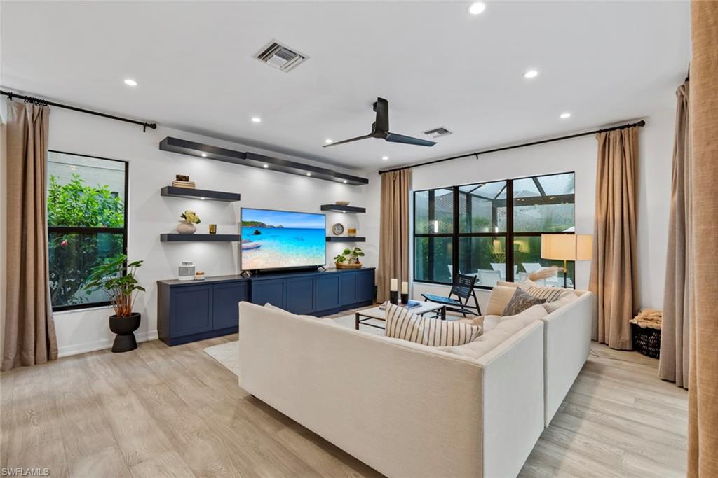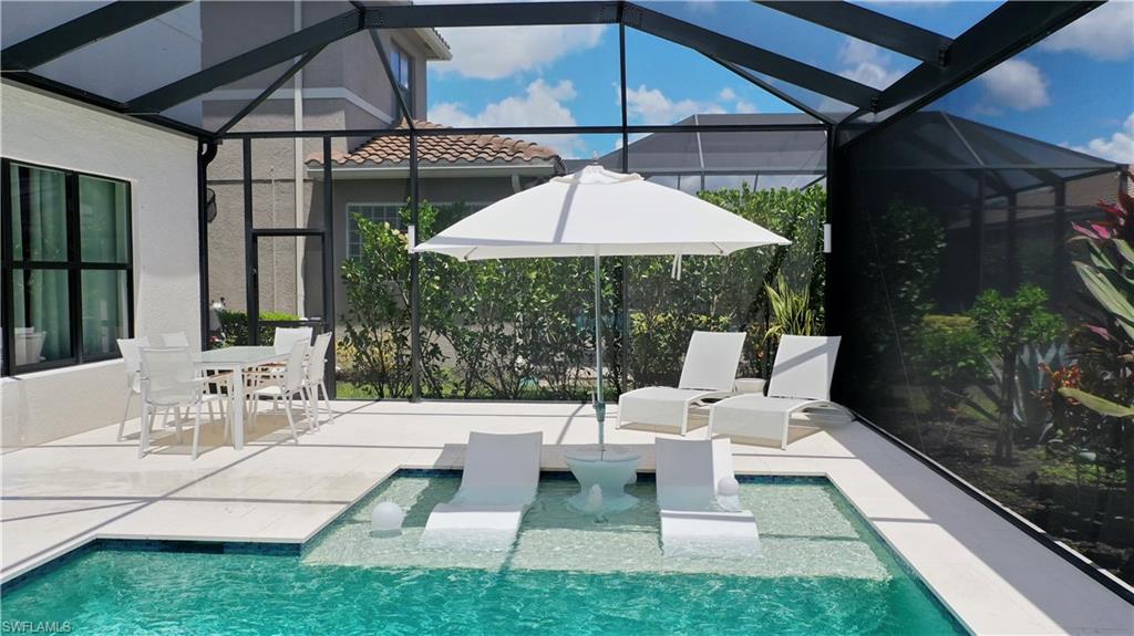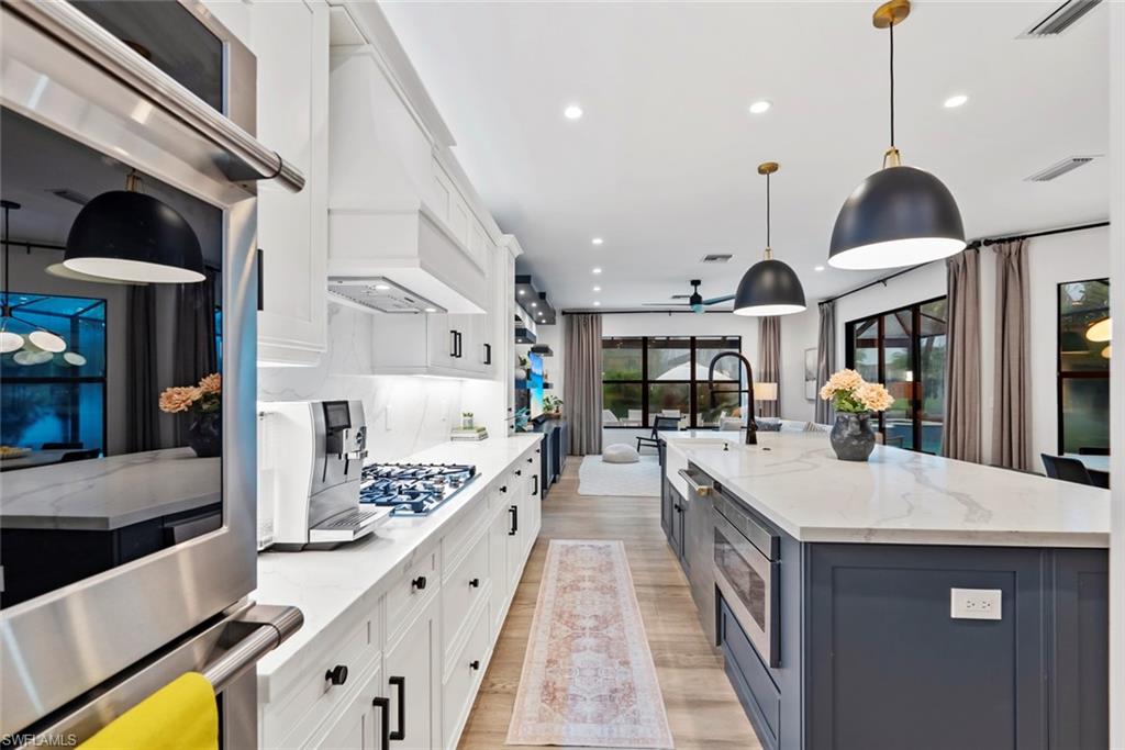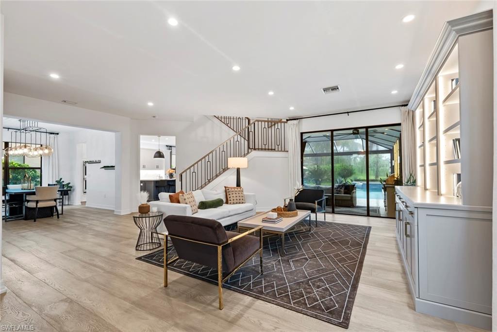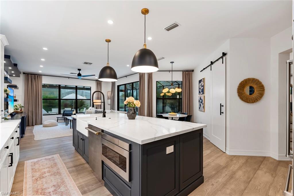 Welcome to your dream home—an elegant retreat designed for modern family living in one of Naples’ most desirable communities. Tucked away on a quiet, low-traffic street, this upgraded residence occupies a premium lot with serene pond views and exceptional privacy. It blends refined finishes with family-friendly comfort, creating a sophisticated yet inviting atmosphere. Inside, wide-plank white oak hardwood floors flow seamlessly throughout, including the laundry and mudroom, adding warmth and continuity. Custom stair rails, elevated ceiling fans, and designer lighting set a polished tone, while tasteful wallpaper accents in the office, dining room, and baths lend unique character. The fully remodeled 2022 kitchen is the centerpiece featuring a Sub-Zero 42" refrigerator, 30" Sub-Zero wine tower with refrigerator/freezer drawers and ice maker, Monogram double oven, cooktop, drawer microwave, and dishwasher. A 10-foot quartz island with under-cabinet lighting, full quartz backsplash, and custom range hood make it perfect for everyday living and entertaining. Functionality is elevated with five custom built-ins in the living room, family room, mudroom, loft, and office/6th bedroom. Clever under-stair storage maximizes space, while the versatile den/6th bedroom adds flexibility. The primary suite offers a tranquil retreat with an upstairs veranda overlooking the pond. Outdoors, a 2021 saltwater pool and spa with massage jets for 6, panoramic screen enclosure, no-see um screen, set the stage for resort-style living. Travertine pavers, LED lighting, hidden drains, WiFi automation, dual heat sources, bubbler, umbrella, shallow deck, and a 4-filter water system, and auto-fill, ensure effortless enjoyment. The outdoor kitchen with Delta gas grill, refrigerator, and storage makes entertaining a delight. The garage is equally impressive: epoxy floors, overhead racks, heavy-duty shelving, an 11kWh EV charger, air conditioning, and insulated doors perfect for a gym, golf cart, workshop, simulator, or collectible car storage. Additional features include a whole-house natural gas generator, fiber optic internet, and dual hurricane-impact entry doors. Community amenities rival a resort: three heated pools (lap, kids, and resort-style with spa), clubhouse with gym, indoor basketball, game lounge, card room, pickleball, tennis, volleyball, and playground—all with low HOA fees. Located in an A-rated school district and close to beaches, shopping, dining, and the airport, this home offers the perfect blend of security, serenity, and style—with a touch of luxury and a vibrant sense of community.