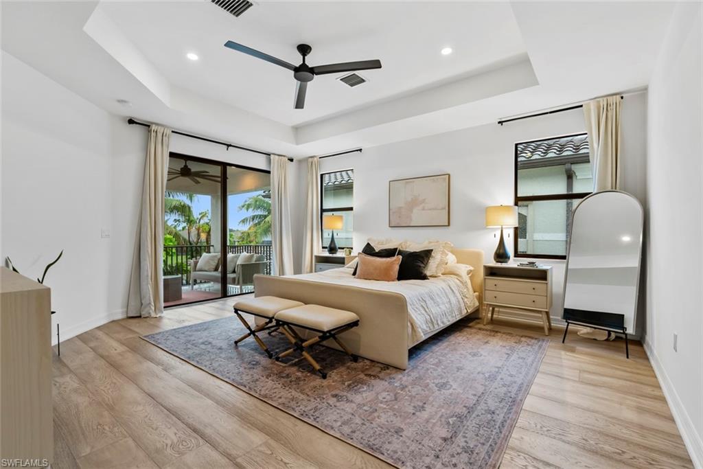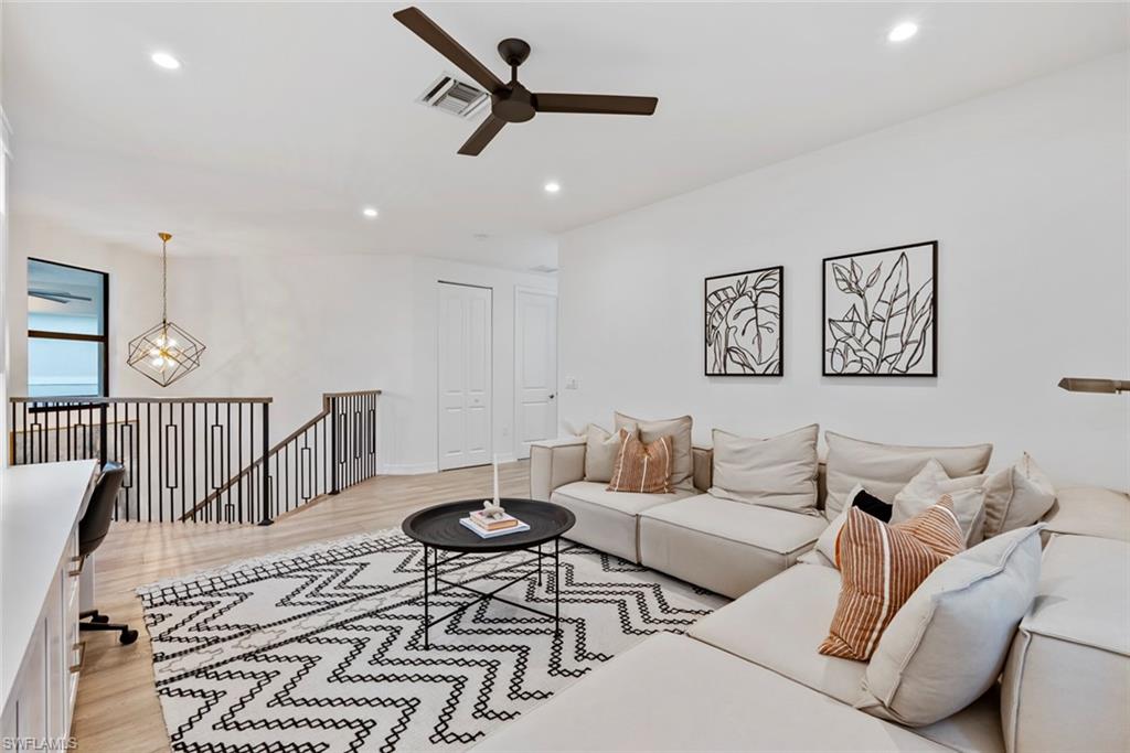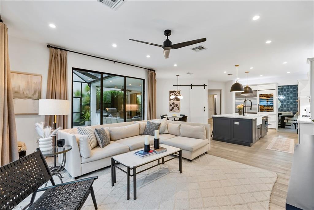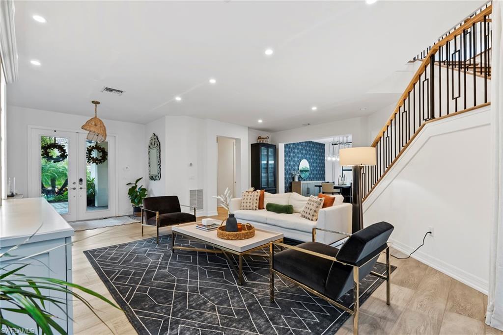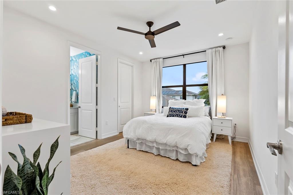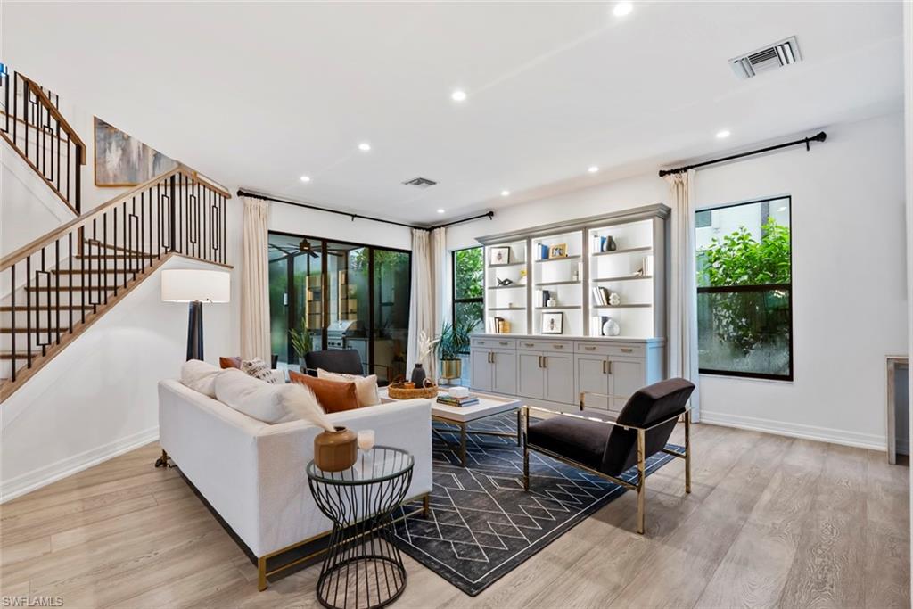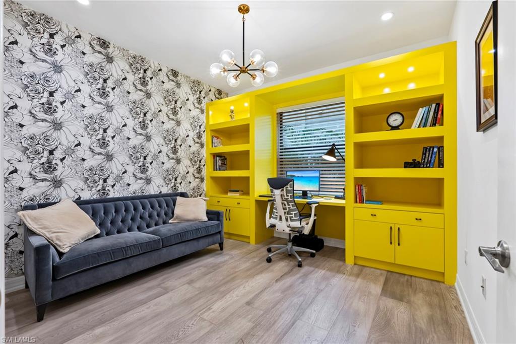 Welcome to your dream home—an elegant retreat designed for modern family living in one of Naples’ most desirable communities. Tucked away on a quiet, low-traffic street, this upgraded residence occupies a premium lot with serene pond views and exceptional privacy. It blends refined finishes with family-friendly comfort, creating a sophisticated yet inviting atmosphere. Inside, wide-plank white oak hardwood floors flow seamlessly throughout, including the laundry and mudroom, adding warmth and continuity. Custom stair rails, elevated ceiling fans, and designer lighting set a polished tone, while tasteful wallpaper accents in the office, dining room, and baths lend unique character. The fully remodeled 2022 kitchen is the centerpiece featuring a Sub-Zero 42" refrigerator, 30" Sub-Zero wine tower with refrigerator/freezer drawers and ice maker, Monogram double oven, cooktop, drawer microwave, and dishwasher. A 10-foot quartz island with under-cabinet lighting, full quartz backsplash, and custom range hood make it perfect for everyday living and entertaining. Functionality is elevated with five custom built-ins in the living room, family room, mudroom, loft, and office/6th bedroom. Clever under-stair storage maximizes space, while the versatile den/6th bedroom adds flexibility. The primary suite offers a tranquil retreat with an upstairs veranda overlooking the pond. Outdoors, a 2021 saltwater pool and spa with massage jets for 6, panoramic screen enclosure, no-see um screen, set the stage for resort-style living. Travertine pavers, LED lighting, hidden drains, WiFi automation, dual heat sources, bubbler, umbrella, shallow deck, and a 4-filter water system, and auto-fill, ensure effortless enjoyment. The outdoor kitchen with Delta gas grill, refrigerator, and storage makes entertaining a delight. The garage is equally impressive: epoxy floors, overhead racks, heavy-duty shelving, an 11kWh EV charger, air conditioning, and insulated doors perfect for a gym, golf cart, workshop, simulator, or collectible car storage. Additional features include a whole-house natural gas generator, fiber optic internet, and dual hurricane-impact entry doors. Community amenities rival a resort: three heated pools (lap, kids, and resort-style with spa), clubhouse with gym, indoor basketball, game lounge, card room, pickleball, tennis, volleyball, and playground—all with low HOA fees. Located in an A-rated school district and close to beaches, shopping, dining, and the airport, this home offers the perfect blend of security, serenity, and style—with a touch of luxury and a vibrant sense of community.