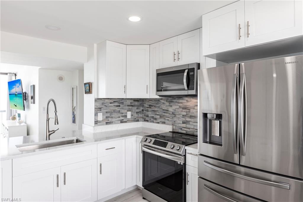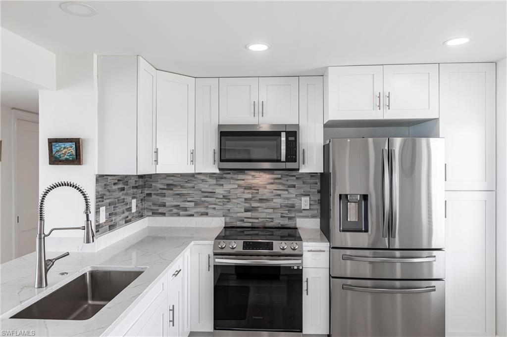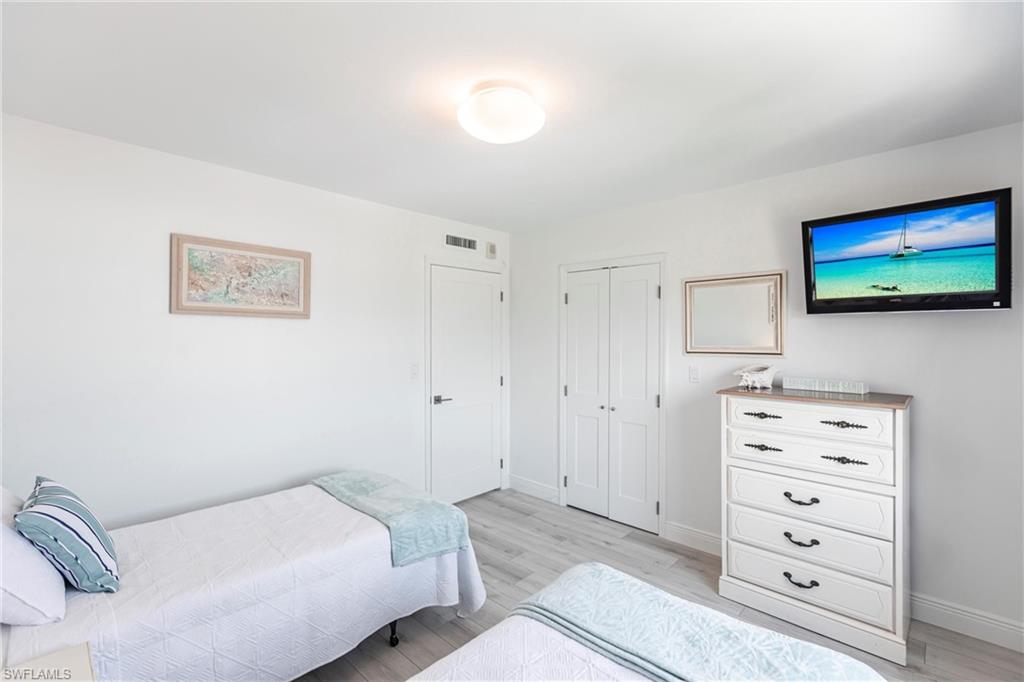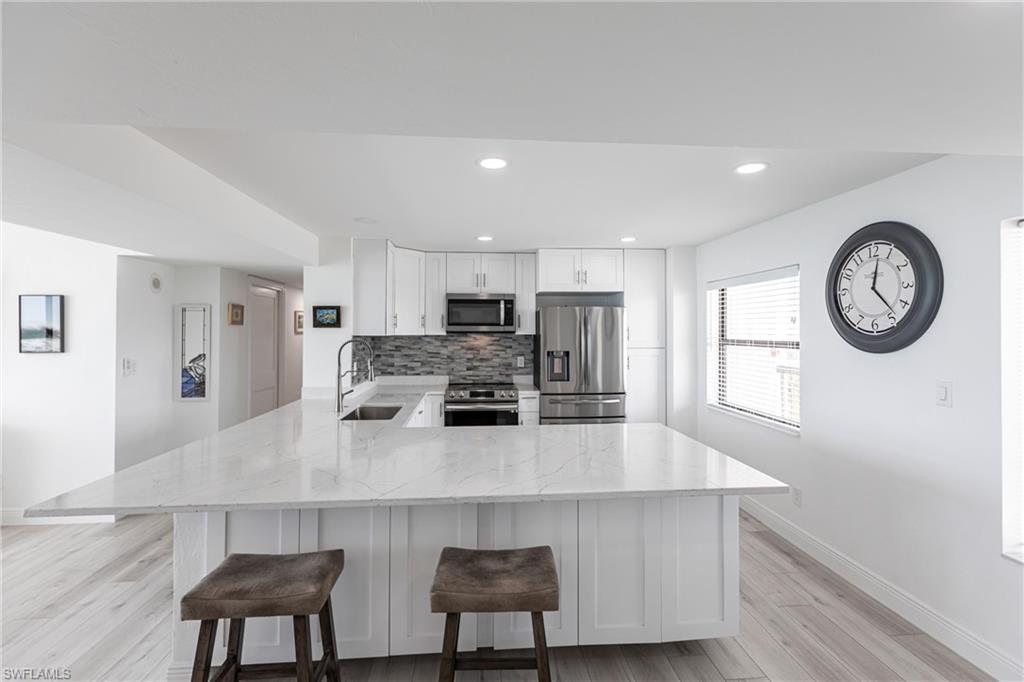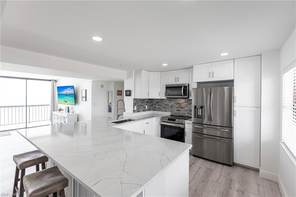 SELLER FINANCING AVAILABLE! Enjoy the ultimate beachfront lifestyle in this fully renovated corner-unit condo on Bonita Beach. A brand-new pool and spa are slated for completion soon, adding even more appeal to this standout property. Perched directly on the sand, the condo showcases panoramic Gulf views from the largest open-air balcony on the beach—the perfect spot for coastal breezes and unforgettable sunsets. Inside, the unit feels completely new. A new HVAC system and water heater ensure year-round comfort, while luxury vinyl plank flooring flows throughout. The kitchen and bathrooms have been fully remodeled with clean, modern, high-end finishes. Offered fully furnished—including designer pieces and LED TVs—the condo is truly move-in ready. Additional upgrades include inset LED lighting throughout the kitchen, living areas, bathrooms, and primary closet, giving the home a bright, contemporary feel. A rare under-building parking space (valued at over $40,000) provides secure, convenient access just steps from the beach. The open, spacious layout is one of the most desirable on Bonita Beach—perfect for everyday living or hosting guests. Set away from public beach access, the building offers a more private and peaceful environment. The community has undergone significant improvements as well: a renovated community room, updated elevators, fresh exterior paint, new landscaping, and a 2023 roof replacement. On-site management makes ownership effortless. Just 25 minutes from RSW Airport and close to top restaurants and shopping, this turnkey beachfront retreat is a rare opportunity in one of Southwest Florida’s most coveted locations.
