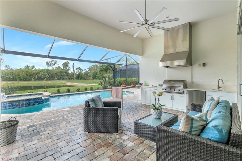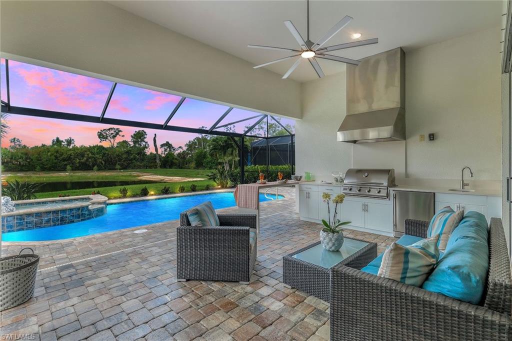 PRICE ADJUSTMENT-Luxury Living in the Heart of Greyhawk at Golf Club of the Everglades: Welcome to elevated living in one of Naples’ most prestigious gated communities—Greyhawk at Golf Club of the Everglades. Whether you’re seeking a year-round residence or a seasonal escape, this exceptional Pinnacle model delivers the perfect blend of sophistication, comfort, and resort-style amenities. Perfectly situated on a quiet cul-de-sac with an oversized paver driveway, this home impresses from the moment you arrive. Tucked away on a premium southern-exposure lot, enjoy sweeping lake views and a serene sense of privacy. The extended, covered lanai is a true outdoor oasis—complete with a panoramic screen enclosure, heated saltwater pool and spa, and a fully equipped, built-in outdoor kitchen perfect for dining and entertaining. Inside, this thoughtfully designed home showcases a highly functional, open-concept layout with elegant designer finishes throughout. With 3 spacious bedrooms, 3 full baths, a dedicated home office with French doors and custom built-ins, and a formal dining space, there’s room for everyone and every occasion. The chef’s kitchen is a showstopper—featuring upgraded cabinetry, high-end stainless steel gas appliances, a generous center island with bar seating, and a walk-in pantry fitted with a custom organizer. The primary suite is a peaceful retreat with stunning lake views, an oversized walk-in closet, and a walk-in shower and built-in bench seating. Additional upgrades include plantation shutters, crown molding, coffered ceilings, volume ceilings, zero-corner doors to lanai, and a whole-house Kinetico water filtration system. Even the utility spaces have been elevated—with a spacious laundry room offering abundant cabinetry, and a 3-car garage complete with built-in storage systems to keep everything organized. Living in Greyhawk means access to a vibrant, resort-style lifestyle. Residents enjoy low HOA fees, no CDD, social golf membership is mandatory, purchase of full golf membership is optional at the renowned 18-hole championship course. The community’s amenity-rich offerings include tennis, pickleball, bocce, a state-of-the-art fitness center, resort-style pool and lap pool, fire pit lounge areas, a Tiki bar, on-site dining, and more—all framed by three of Naples’ premier golf courses. Don’t miss your opportunity to own in this highly sought-after enclave, where luxury meets leisure, and every day feels like a vacation. Schedule your private tour today and experience the Greyhawk lifestyle for yourself.