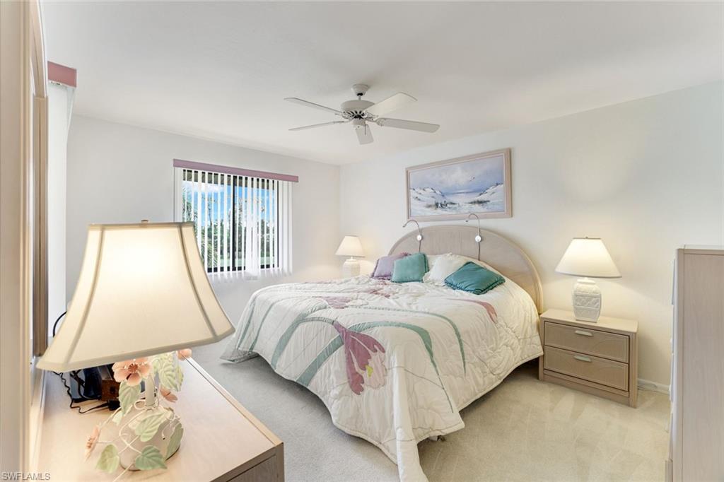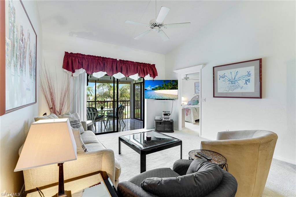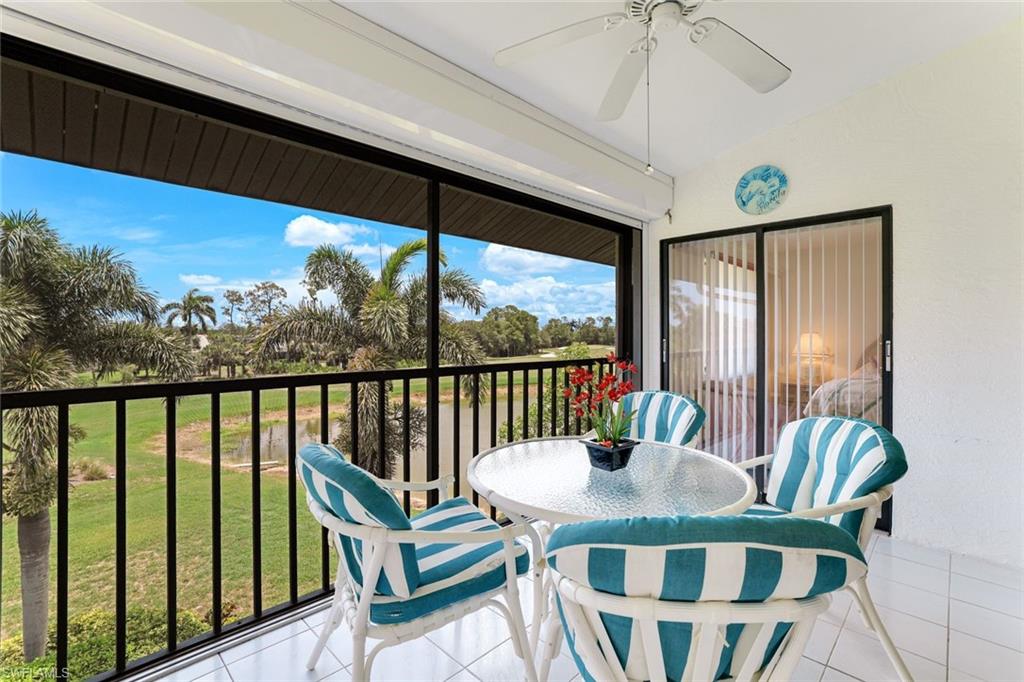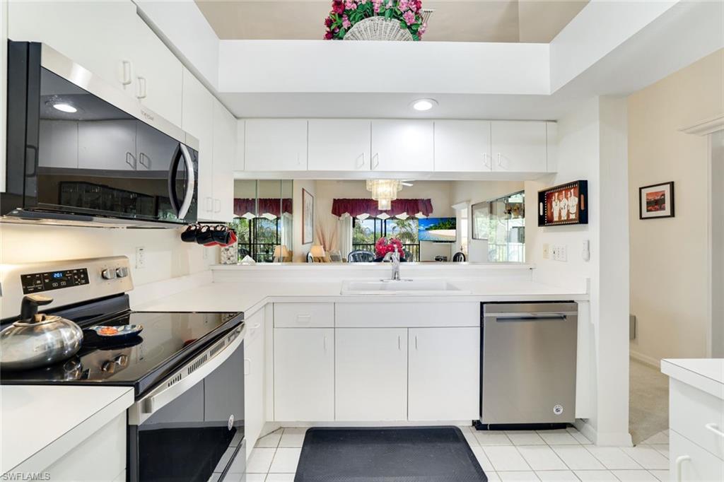 Discover effortless indoor-outdoor living in this bright, third-floor condo in Country Manor. Freshly painted and bathed in natural lighting, boasts vaulted cathedral ceilings and sweeping views of the 3rd hole of the golf course. Two bedrooms and two baths offer comfort and style, while the updated kitchen cabinetry and bathroom vanities enhance modern living. All kitchen appliances were installed in 2020, with a new microwave added in February 2025. Recent upgrades include New A/C ductwork (2022) and a motorized lanai hurricane shutter (2022). Enjoy resort-style amenities—golf course, pickleball, bocce, and tennis courts—plus two sparkling community pools, all just steps from your door.
