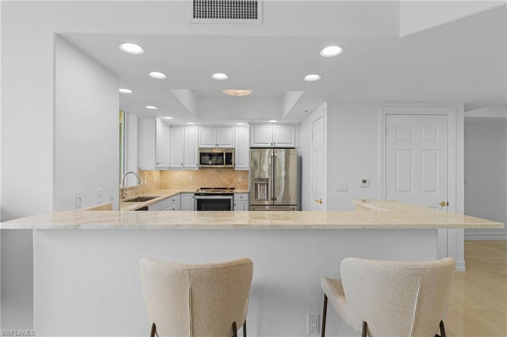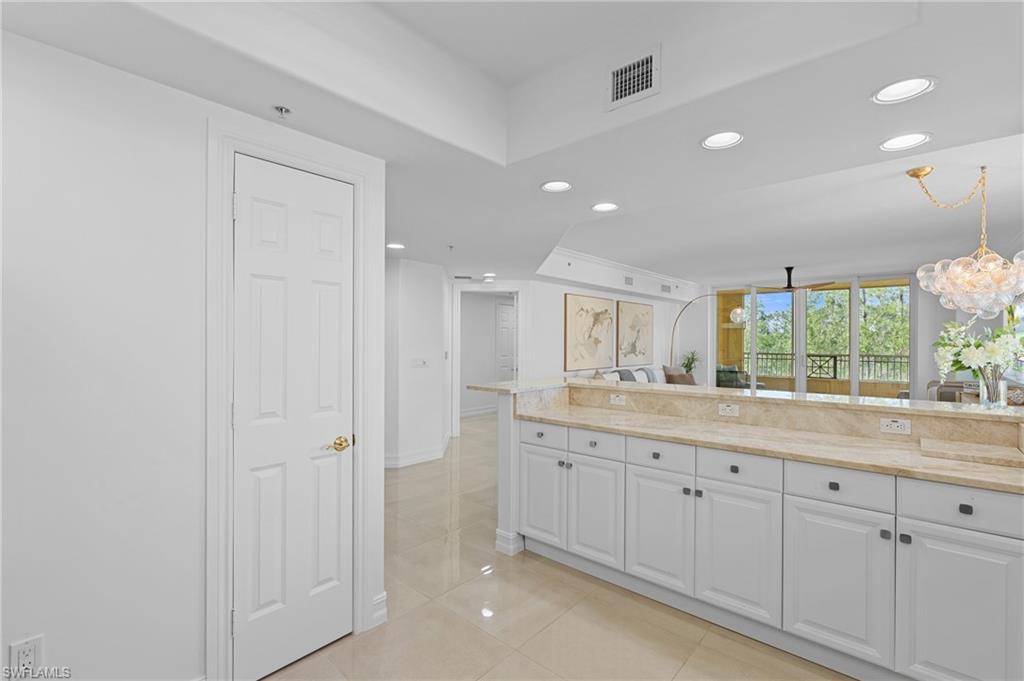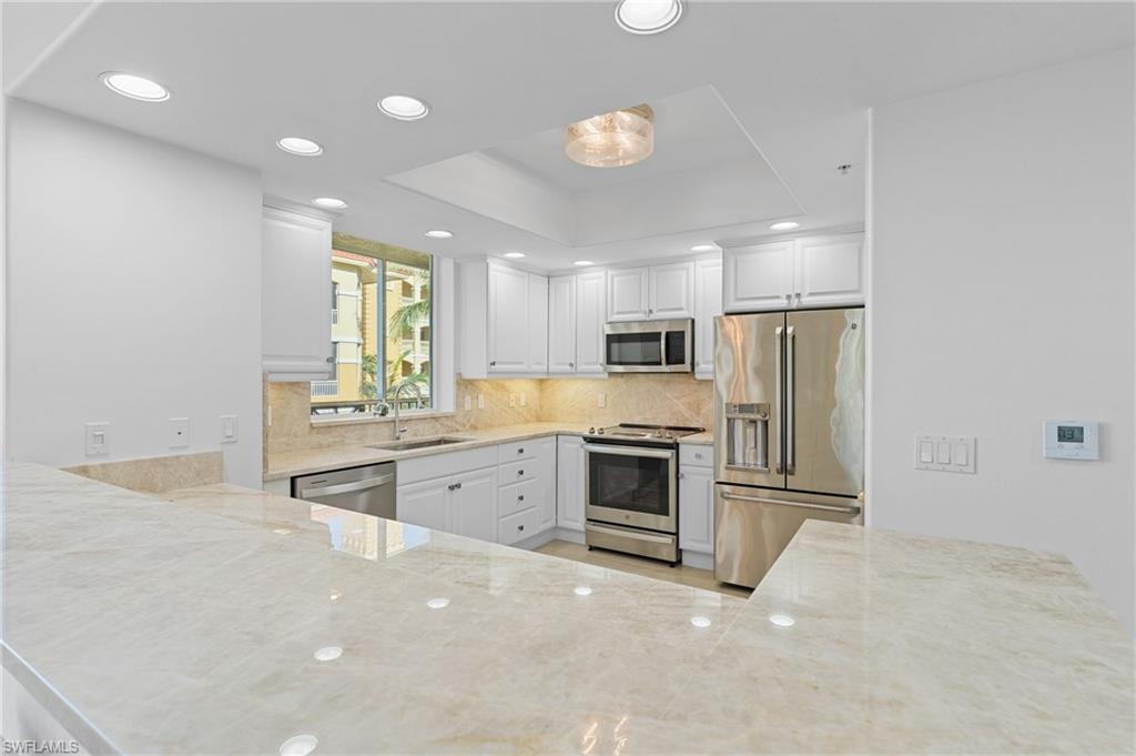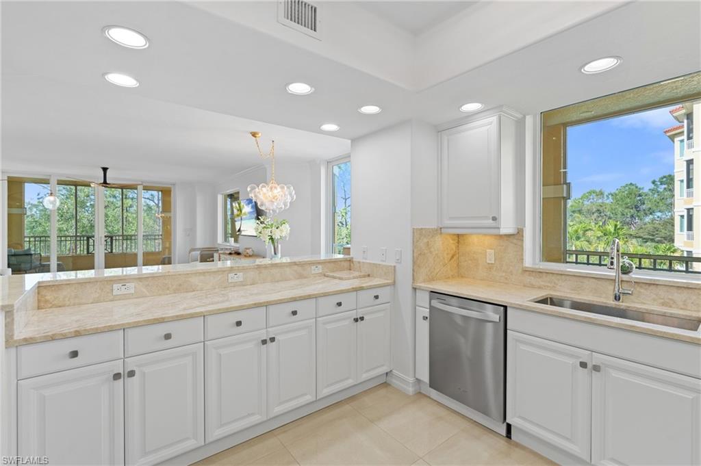 INCREDIBLE NEW RENOVATION of this special corner unit with TWO wrap around screened balconies, floor to ceiling IMPACT WINDOWS & sliding doors and elegant neutral porcelain tile flooring throughout living areas & bedrooms! 2 oversize bedroom suites, NEWLY remodeled and with a private screened balcony and golf course views from both. The grand Master suite features 2 walk-in closets, sitting area and access to the wrap around screened balcony with golf course views. A large open kitchen features NEW Taj Mahal Quartzite Countertops, a picture window, stainless appliances, pantry and bar stool seating at the large breakfast bar. The laundry room is complete with a sink and plenty of counter space PLUS this corner unit offers the additional half bath - powder room. Ventanas features a golf front lap pool, spa, gas grills & cabana dining area on the oversize brick paver pool deck. The roofs were NEW in 2020 & the building parking garage is attached with an option to lease additional spaces, if desired.. A membership purchase is not mandatory. We do have FULL golf memberships available IMMEDIATELY which are 80% REFUNDABLE!