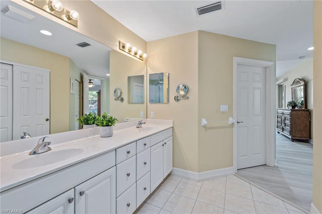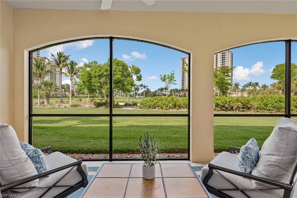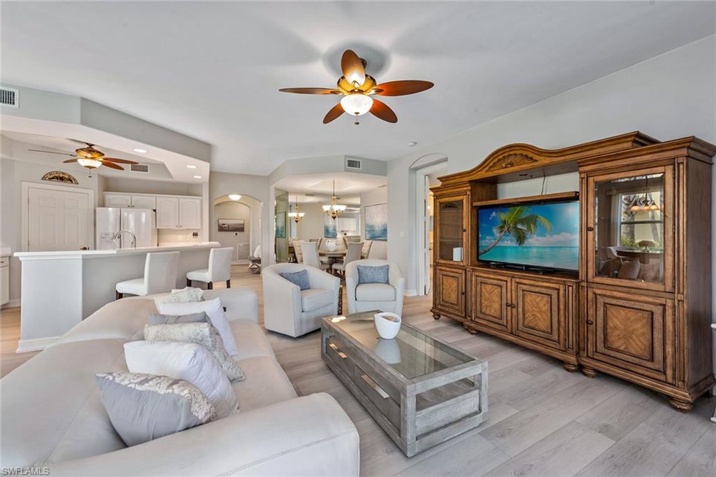 Experience the ease of luxury living in this beautifully furnished first-floor coach home, in the sought-after Rialto enclave of the prestigious gated Hammock Bay Golf & Country Club. Combining the spacious feel of a single-family home with the low-maintenance convenience of condominium ownership, this residence features three bedrooms, two baths and a two-car garage, ideal for seasonal or year-round living. Enjoy desirable western exposure from your expansive screened lanai with no-see-um screening, offering peaceful golf course views and a seamless extension of your indoor living space. Impact-resistant doors and windows provide enhanced security and year-round peace of mind. Inside, you’ll find abundant natural light and new tile flooring throughout the main living areas, elevating the home’s elegance and style. The open-concept kitchen is appointed with white cabinetry, under-cabinet lighting, recessed ceiling lights, a pantry and a full suite of appliances including a refrigerator with icemaker, range, microwave and new dishwasher (2022). A charming breakfast nook framed by a large window provides lanai access, while the formal dining room features custom wall mirrors that visually expand the space. The light-filled living room flows effortlessly to the outdoor lanai through glass sliders, ideal for relaxed lounging and entertaining guests. The spacious primary suite offers direct lanai access, a generous walk-in closet and an en-suite bath with dual vanities, full-width mirrors, walk-in shower with bench and a linen closet. Two guest bedrooms enjoy their private wing and share a well-appointed bath with a shower/tub combination. A functional laundry room includes a washer and dryer, utility sink and overhead storage cabinets. A new water heater (2023) adds further value and peace of mind. This exceptional residence is within a sought-after community offering resort-style living just minutes from the executive airport, award-winning white sand beaches, renowned golf courses, fine dining, casual waterfront restaurants, boutique shopping, grocery stores, parks, art galleries, marinas and yacht clubs, and all the popular cultural and recreational offerings of Naples and Marco Island.