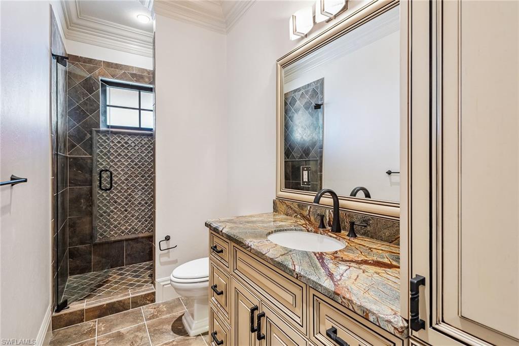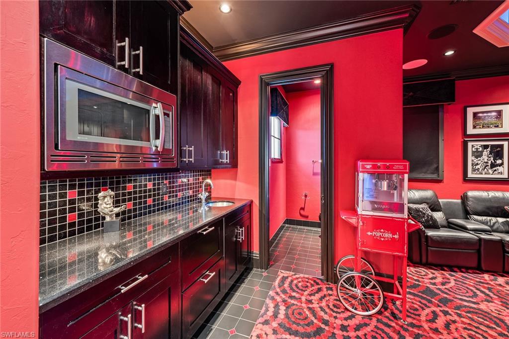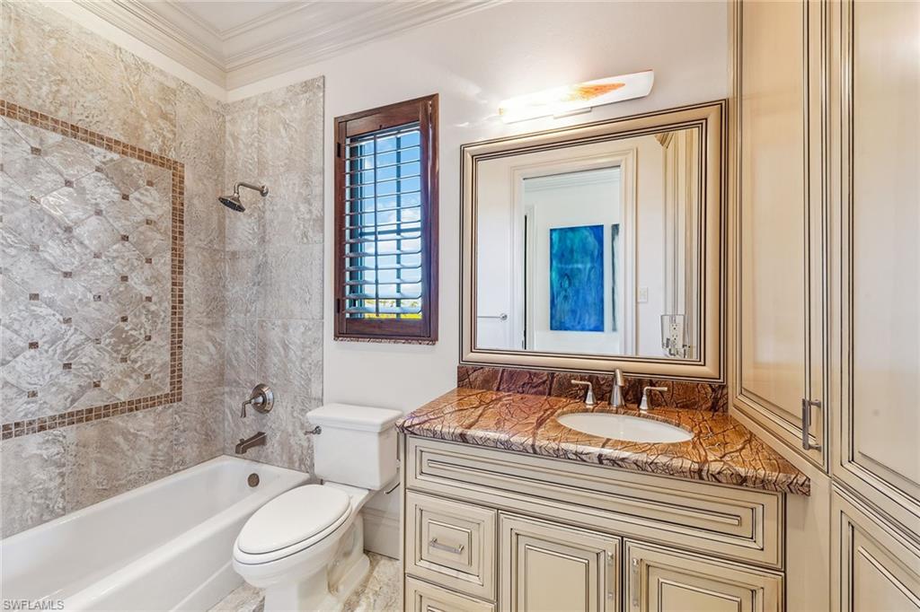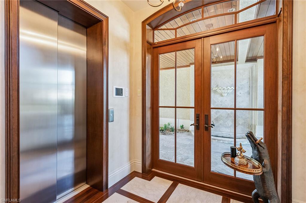 On the south side of Caxambas Court in Marco Island's prestigious Estates neighborhood, this exceptional three-story waterfront estate epitomizes luxury coastal living. Boasting 125 feet of deep-water frontage, the property offers direct Gulf access and panoramic southern views, further enhanced by a unique fourth-floor observation deck. Encompassing 6,370 square feet of air-conditioned space and totaling 11,679 square feet under roof, this residence features five bedrooms, an office, a theater, and five full and two half baths, all meticulously designed with the finest materials and craftsmanship. Inside, soaring coffered ceilings, intricate three-piece crown molding and travertine flooring create an atmosphere of refined elegance. The gourmet kitchen is a chef’s dream, equipped with custom wood cabinetry, granite countertops, dual center islands, a seven-seat breakfast bar and top-of-the-line JennAir appliances, including a six-burner gas range and double wall ovens. The great room features a mosaic tile accent wall, built-in gas fireplace and custom bookcases, seamlessly connecting to the expansive lanai through glass sliders. The owner's suite serves as a private sanctuary, offering a tray ceiling, walk-in closet and a spa-like en-suite bath with dual custom vanities, an open walk-in shower with multiple heads, a jetted soaking tub and dual water closets with a bidet. Each guest suite is thoughtfully appointed with tray ceilings, walk-in closets and en-suite baths, ensuring comfort and privacy for all. The state-of-the-art theater room, complete with a wet bar, surround sound and built-in projector cabinetry, provides an ideal space for entertainment. The exterior is equally impressive, featuring a fully fenced backyard, four balconies, impact-resistant doors and windows, and a stamped concrete circular driveway. The outdoor living area includes a heated saltwater pool with spa, an outdoor kitchen equipped with a Fire Magic gas grill and mini refrigerator, and a gas fire pit surrounded by a tranquil fountain. Boating enthusiasts will appreciate the private composite dock with a captain’s walk, two Hi-Tide boat lifts and a 40-foot slip with provisions for a 30,000-pound lift, offering unparalleled access to the Gulf. Modern conveniences abound, including a private elevator, in-ceiling speakers, a video security system, Honeywell 240V central vacuum, two Rinnai tankless water heaters, a Generac 48-kilowatt whole-home generator and a 1,000-gallon propane tank. The six-car air-conditioned garage is outfitted with built-in storage cabinets, a workbench and a gym area, catering to automotive enthusiasts and fitness aficionados. This remarkable estate seamlessly blends luxury, comfort and cutting-edge technology, offering an unparalleled coastal lifestyle in one of Marco Island’s exclusive enclaves.