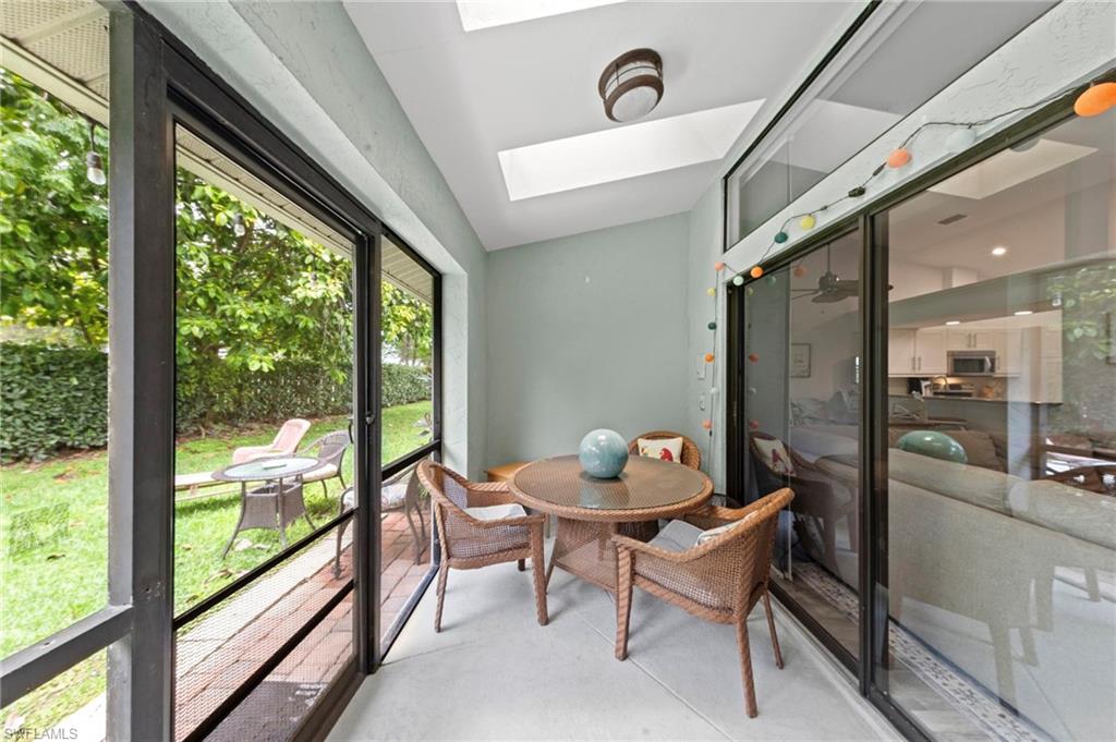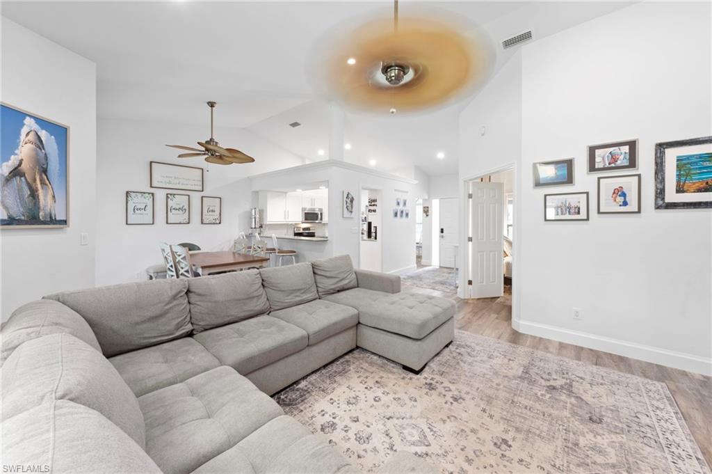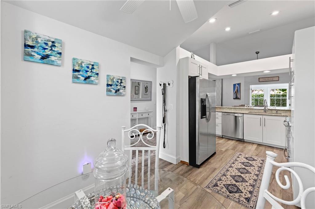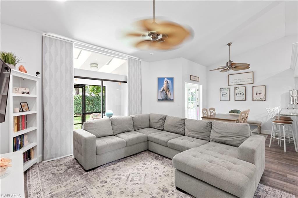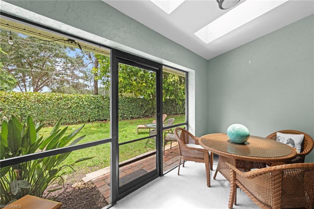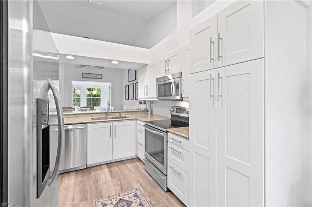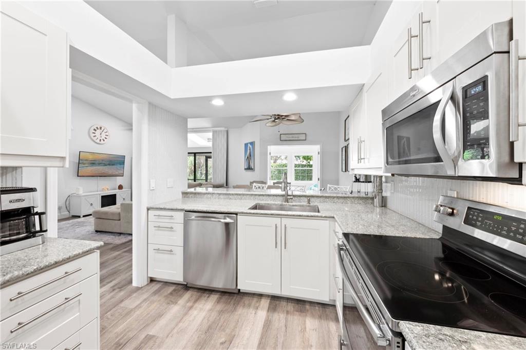 Discover this stunningly renovated 3-bedroom, 2-bath residence, complete with a DEN or private office space. This home features stylish vinyl flooring, along with marble finishes in the bathrooms. The master suite is a highlight, offering an en-suite bath and a generous walk-in closet. The modern eat-in kitchen is designed for culinary enthusiasts, equipped with stainless steel appliances, beautiful granite countertops, and a chic glass backsplash. Natural light floods the spacious living room through sliding glass doors that lead to an enclosed lanai, which boasts skylights for added brightness. Additional features include a sizable 2-car garage, 2023 AC, and an extended driveway for extra parking. Situated in a peaceful cul-de-sac within the Regent Park community in North Naples, this property provides convenient access to I-75 and comes with low HOA fees. Enjoy community perks like a swimming pool and tennis courts. Located in the esteemed Pelican Marsh school district, this home is also a short drive from numerous shopping, dining, and beach destinations. Seize the opportunity to make this exquisite home your own!