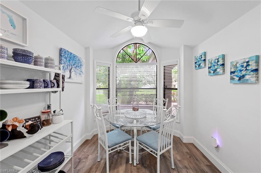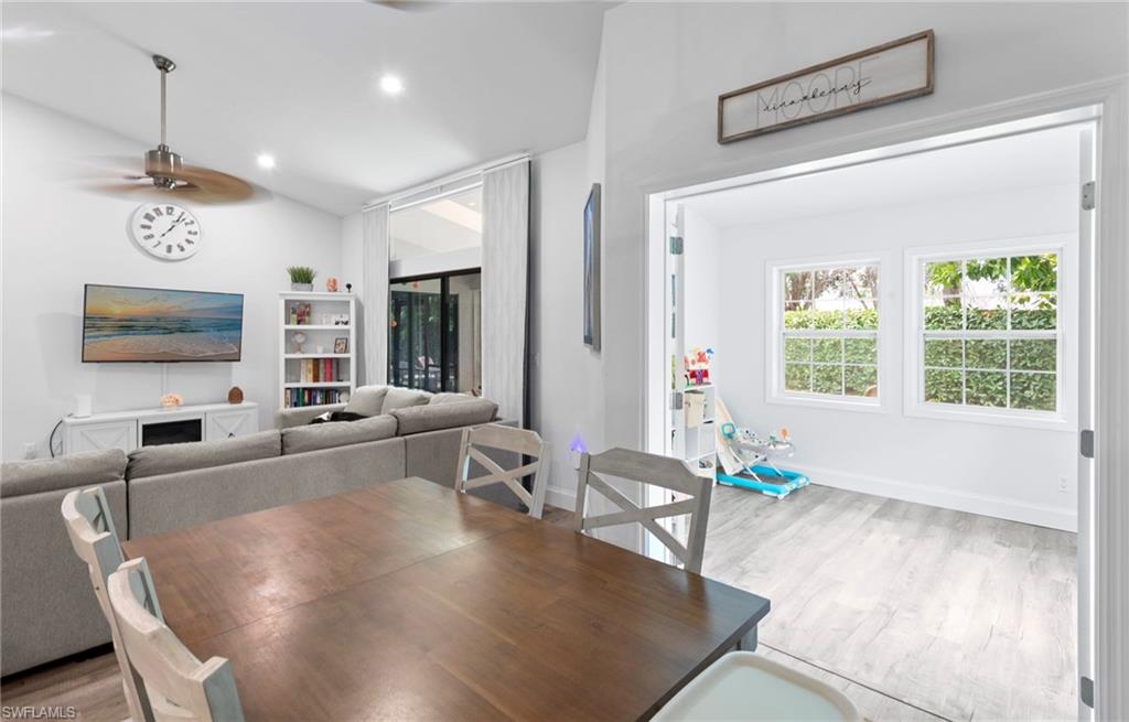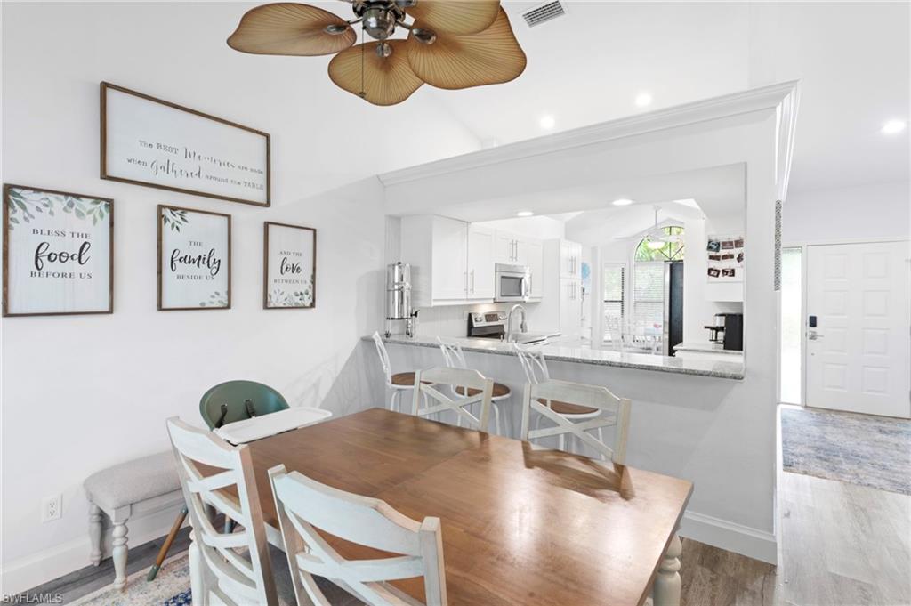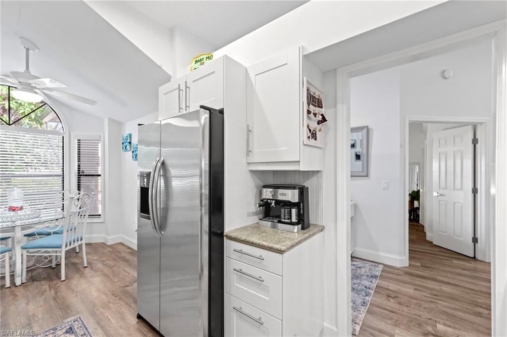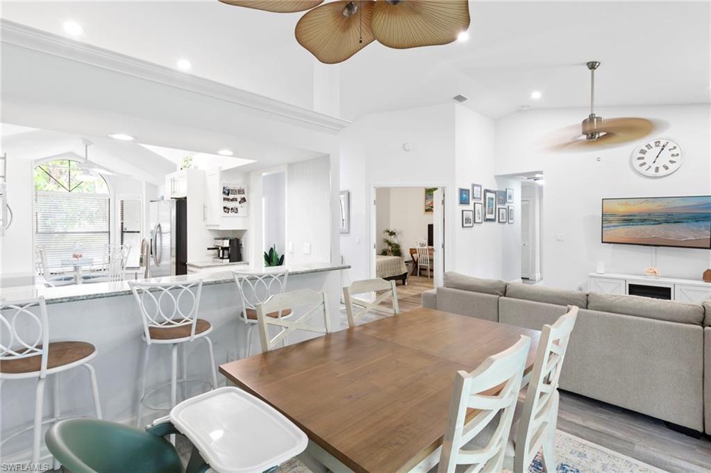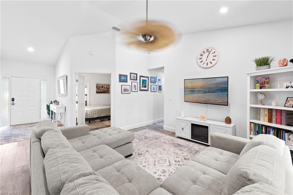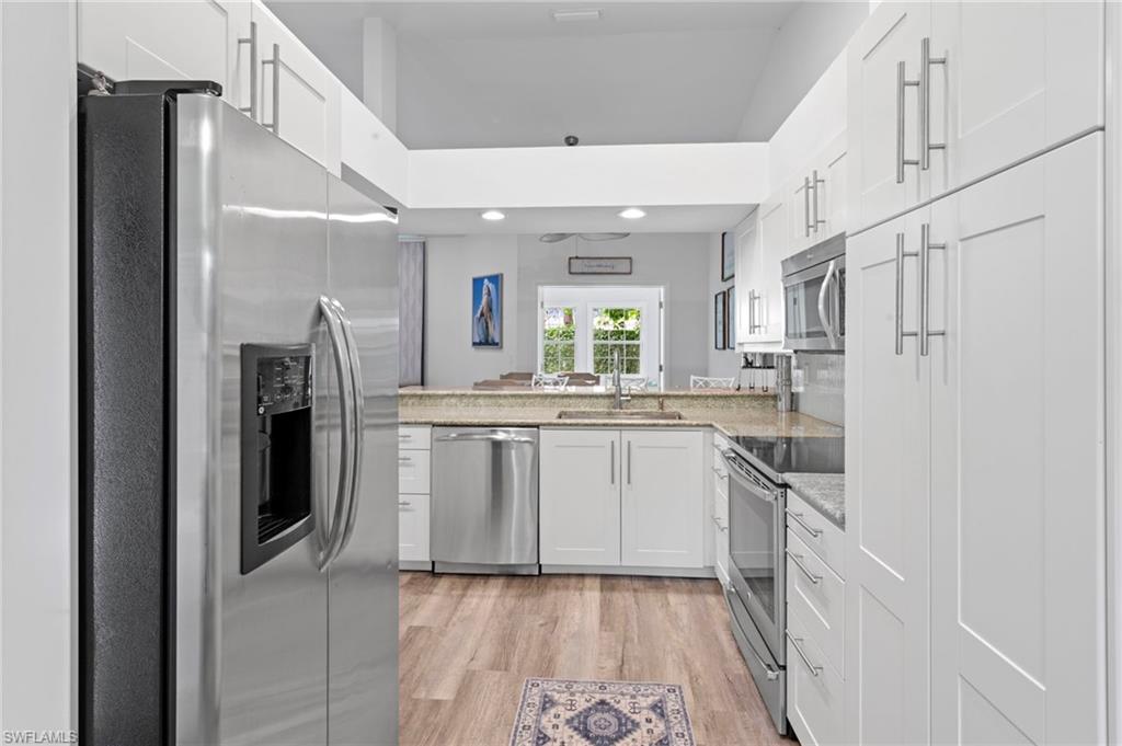 Discover this stunningly renovated 3-bedroom, 2-bath residence, complete with a DEN or private office space. This home features stylish vinyl flooring, along with marble finishes in the bathrooms. The master suite is a highlight, offering an en-suite bath and a generous walk-in closet. The modern eat-in kitchen is designed for culinary enthusiasts, equipped with stainless steel appliances, beautiful granite countertops, and a chic glass backsplash. Natural light floods the spacious living room through sliding glass doors that lead to an enclosed lanai, which boasts skylights for added brightness. Additional features include a sizable 2-car garage, 2023 AC, and an extended driveway for extra parking. Situated in a peaceful cul-de-sac within the Regent Park community in North Naples, this property provides convenient access to I-75 and comes with low HOA fees. Enjoy community perks like a swimming pool and tennis courts. Located in the esteemed Pelican Marsh school district, this home is also a short drive from numerous shopping, dining, and beach destinations. Seize the opportunity to make this exquisite home your own!