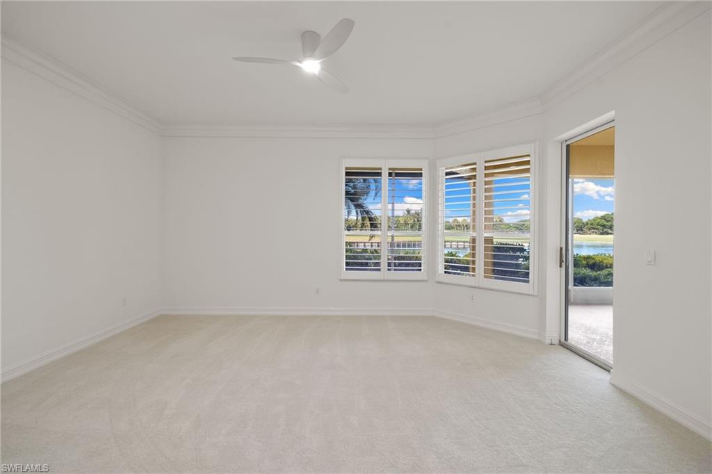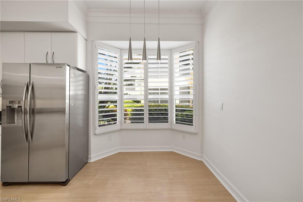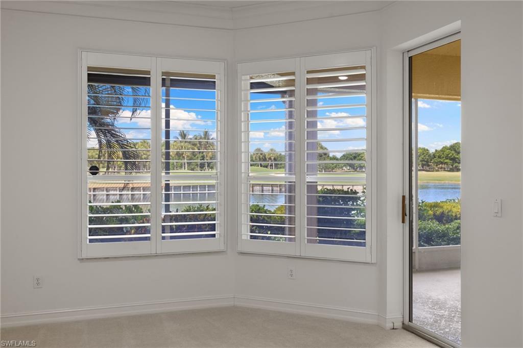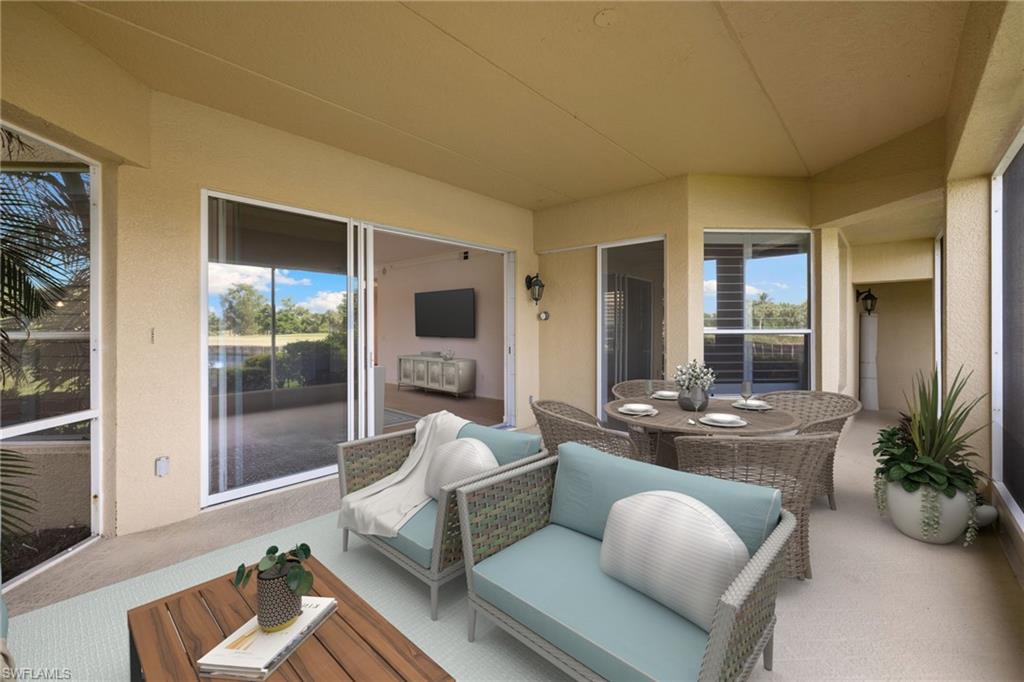 Discover timeless elegance in this beautifully designed 2,216 sq. ft. first-floor end-unit condo in the prestigious gated community of Pelican Marsh, located in the Les Chateaux neighborhood. Offering exceptional privacy and a premium North Naples location, this home is perfectly situated on a quiet cul-de-sac with stunning views of a tranquil pond and the 18th hole of the championship golf course. Step inside to a bright, open floor plan with neutral finishes, featuring 9-foot volume ceilings, rich wood flooring, refined crown molding, and plantation shutters in the living room, dining area, kitchen, and primary suite. The gourmet eat-in kitchen features stainless steel appliances, white cabinetry, and a cozy breakfast nook. Just off the kitchen, a sunlit morning room offers a bright, inviting flex space—perfect for a reading nook or office—with future potential for an expanded gourmet kitchen, chef’s zone, custom banquette seating, or bar area. The spacious primary suite includes a large walk-in closet, spa-like en-suite bath, and sliding glass doors that open to the oversized screened lanai—perfect for enjoying peaceful sunsets. Two additional bedrooms and 2.5 bathrooms provide privacy and flexibility for guests or a home office. A full laundry room with a full-size washer and dryer completes the space. Freshly painted interiors and upgraded carpeting create a move-in-ready feel, while a $5,000 designer lighting credit allows you to personalize with your style. Residents enjoy resort-style amenities, including a sparkling pool, 8 Har-Tru tennis courts, 6 pickleball courts, 3 bocce courts, a fitness center with classes and trainers, a playground, and scenic walking and biking paths. The new Courtside Restaurant offers convenient onsite dining just minutes away. Pelican Marsh Golf Club is a private, member-only facility with a Robert von Hagge-designed, Audubon-certified 18-hole championship course, premier practice facility, and on-site PGA professionals. Ideally located minutes from Vanderbilt Beach, Mercato, and only 7 miles from Downtown 5th Avenue South, this home combines luxury, lifestyle, and coastal convenience in one of Naples’ most desirable communities.