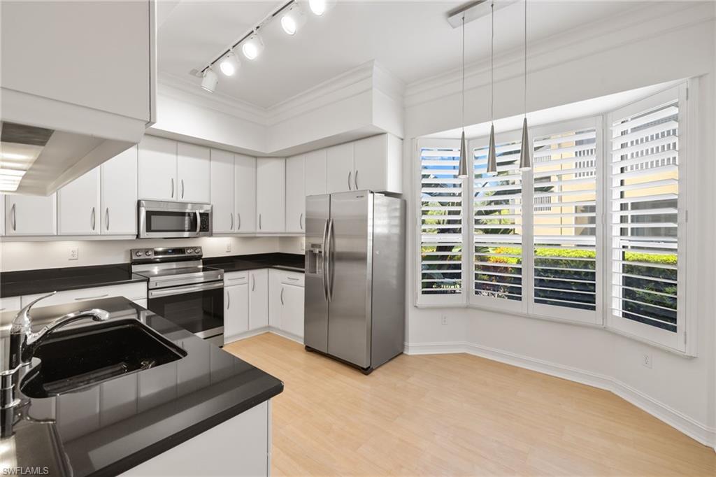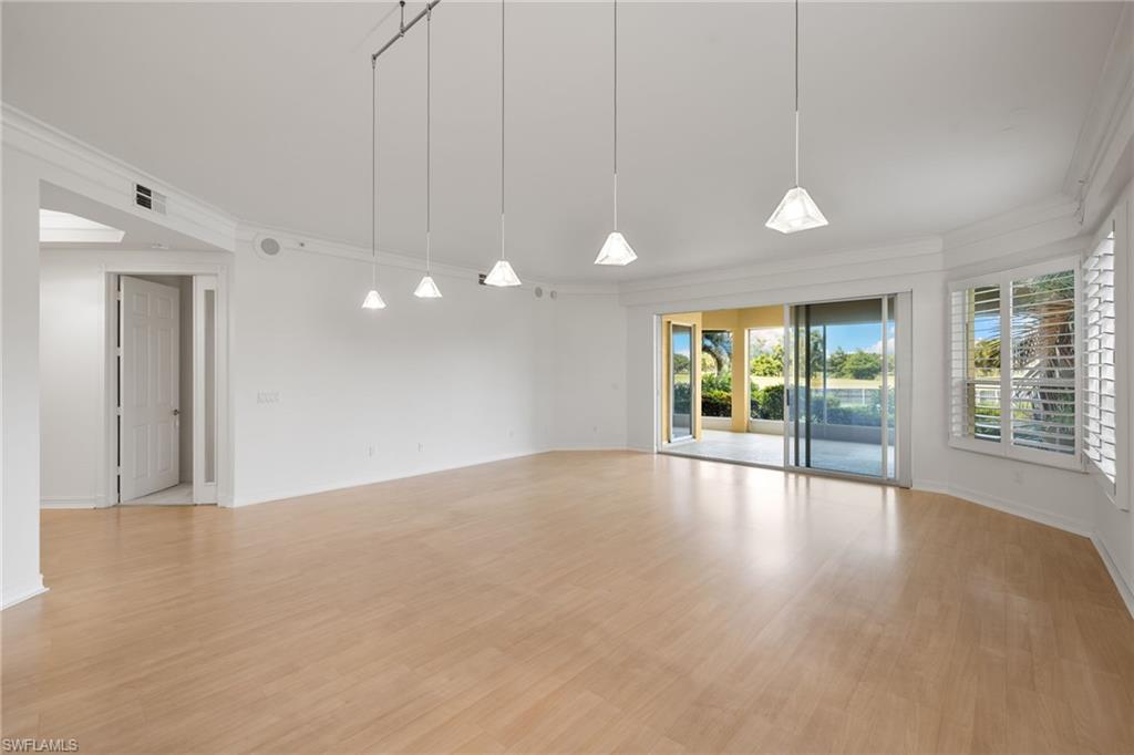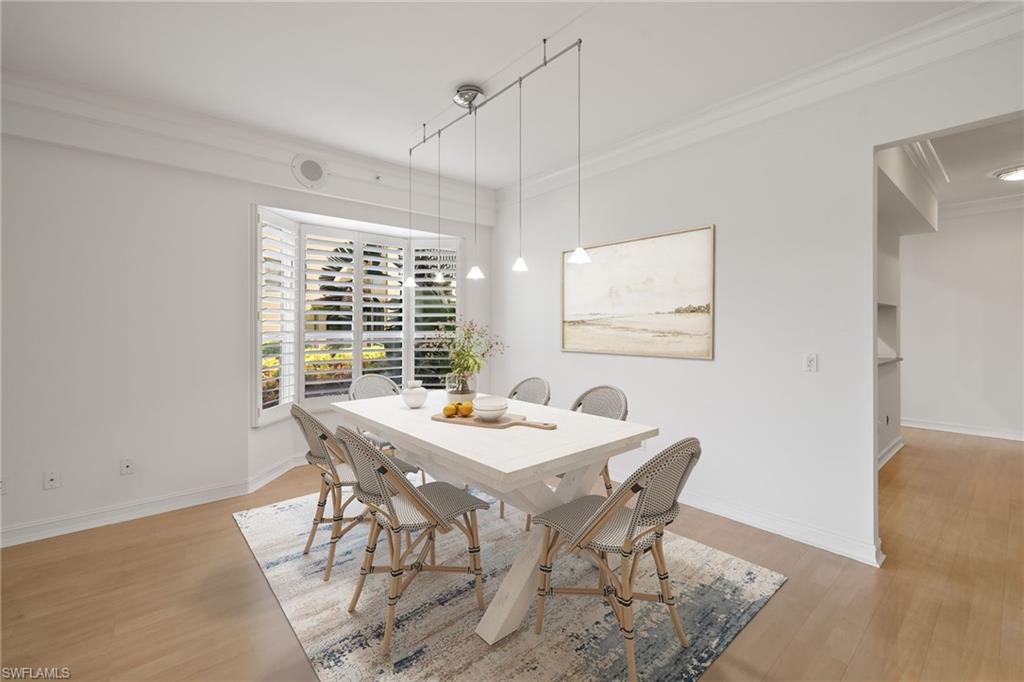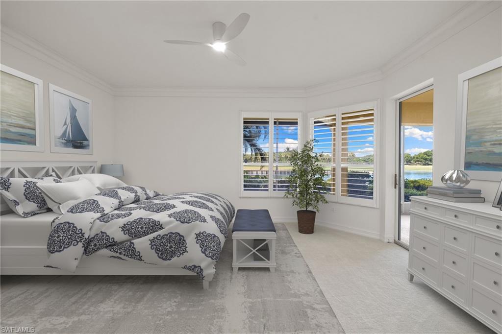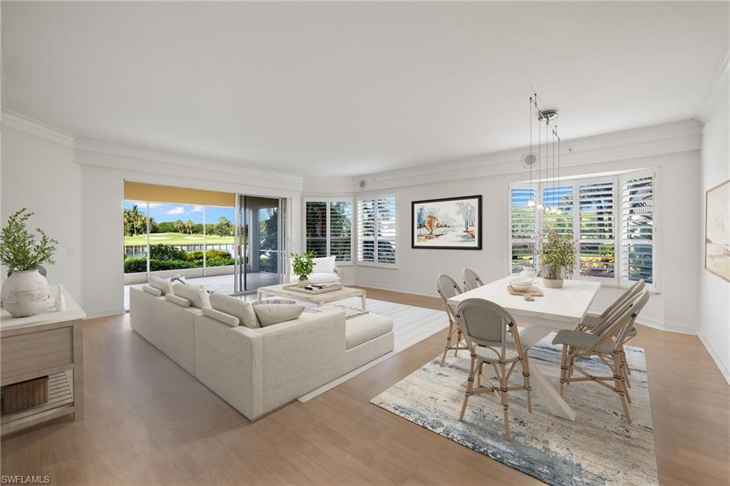 Discover timeless elegance in this beautifully designed 2,216 sq. ft. first-floor end-unit condo in the prestigious gated community of Pelican Marsh, located in the Les Chateaux neighborhood. Offering exceptional privacy and a premium North Naples location, this home is perfectly situated on a quiet cul-de-sac with stunning views of a tranquil pond and the 18th hole of the championship golf course. Step inside to a bright, open floor plan with neutral finishes, featuring 9-foot volume ceilings, rich wood flooring, refined crown molding, and plantation shutters in the living room, dining area, kitchen, and primary suite. The gourmet eat-in kitchen features stainless steel appliances, white cabinetry, and a cozy breakfast nook. Just off the kitchen, a sunlit morning room offers a bright, inviting flex space—perfect for a reading nook or office—with future potential for an expanded gourmet kitchen, chef’s zone, custom banquette seating, or bar area. The spacious primary suite includes a large walk-in closet, spa-like en-suite bath, and sliding glass doors that open to the oversized screened lanai—perfect for enjoying peaceful sunsets. Two additional bedrooms and 2.5 bathrooms provide privacy and flexibility for guests or a home office. A full laundry room with a full-size washer and dryer completes the space. Freshly painted interiors and upgraded carpeting create a move-in-ready feel, while a $5,000 designer lighting credit allows you to personalize with your style. Residents enjoy resort-style amenities, including a sparkling pool, 8 Har-Tru tennis courts, 6 pickleball courts, 3 bocce courts, a fitness center with classes and trainers, a playground, and scenic walking and biking paths. The new Courtside Restaurant offers convenient onsite dining just minutes away. Pelican Marsh Golf Club is a private, member-only facility with a Robert von Hagge-designed, Audubon-certified 18-hole championship course, premier practice facility, and on-site PGA professionals. Ideally located minutes from Vanderbilt Beach, Mercato, and only 7 miles from Downtown 5th Avenue South, this home combines luxury, lifestyle, and coastal convenience in one of Naples’ most desirable communities.