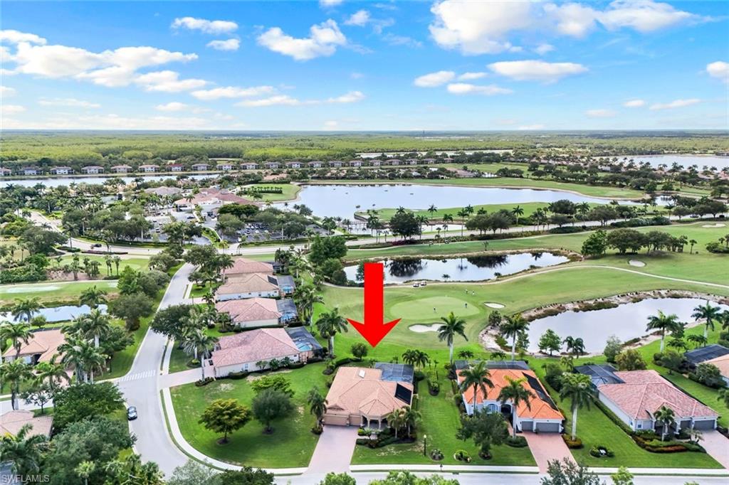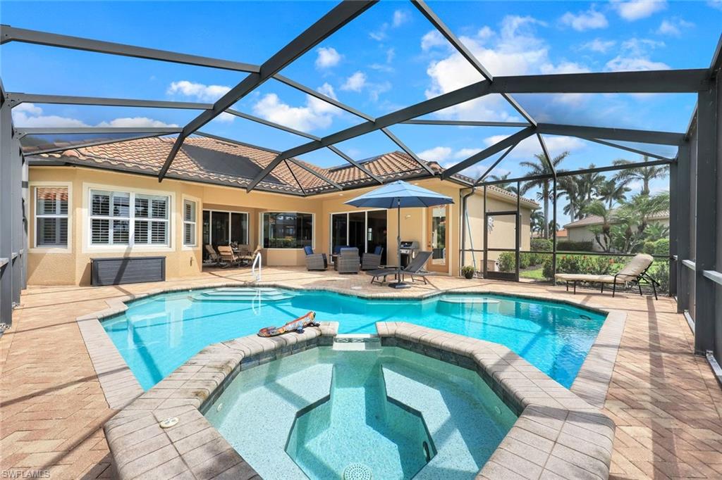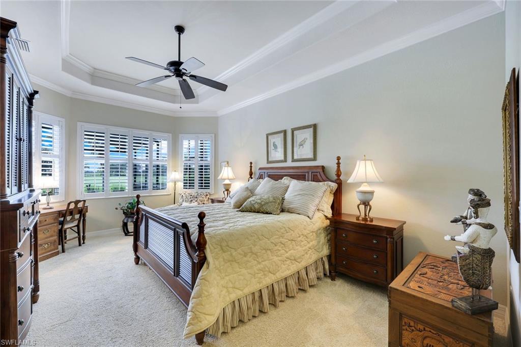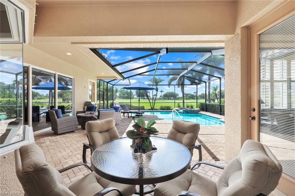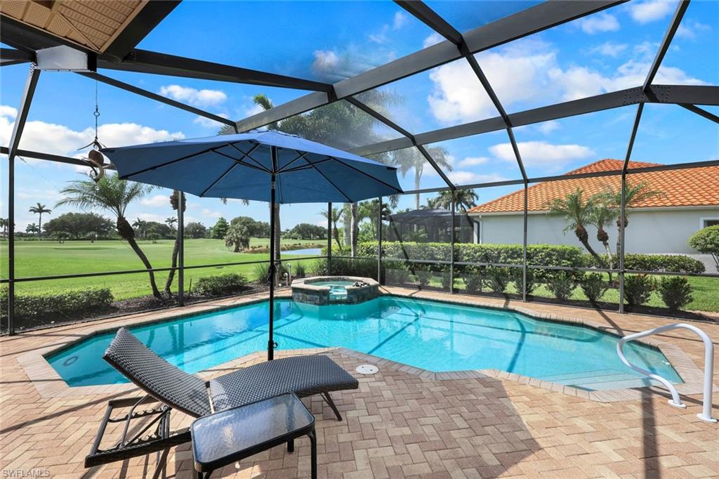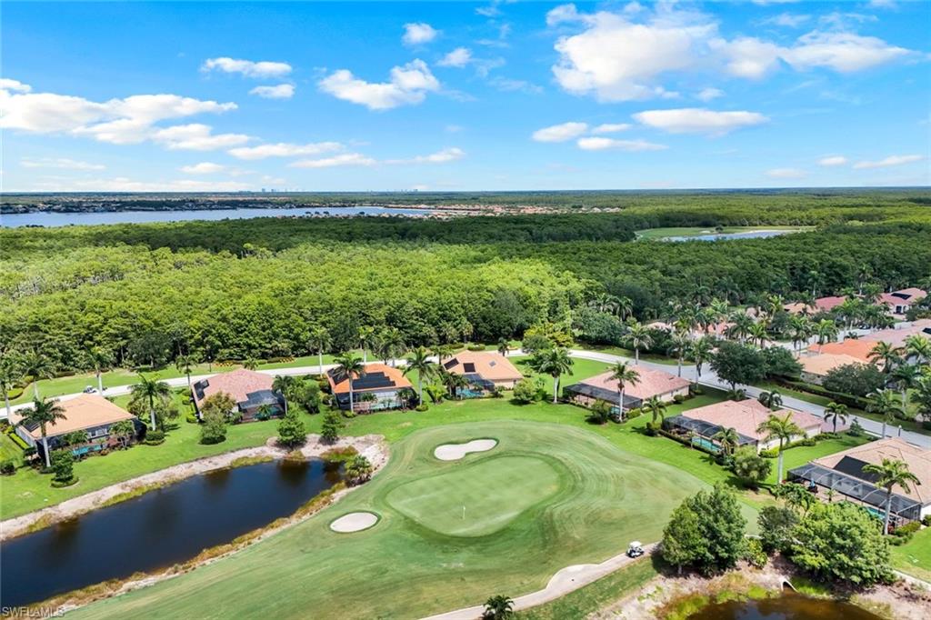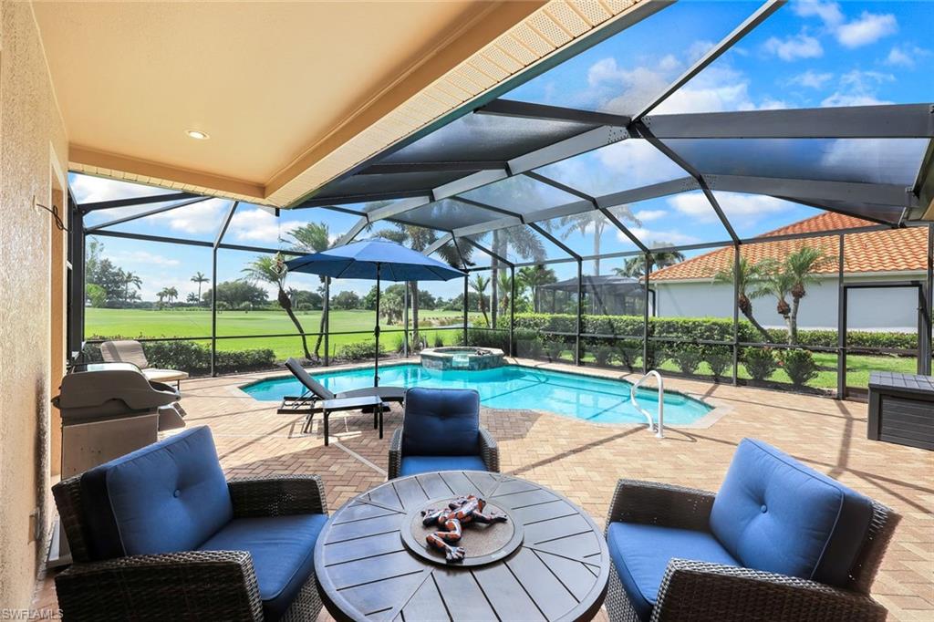Full golf membership included! This immaculate Doral model is situated on one of the largest oversized pie-shaped lots in Heritage Bay and is one of only four homes in the entire community with no adjacent neighbor in the front, offering added privacy and stunning views. Enjoy breathtaking, panoramic southeastern exposure overlooking the #4 green and lake. Offered furnished, this home is loaded with upgrades including custom closets, coffered ceilings, crown molding throughout, granite countertops, stainless steel appliances, hurricane panels, plantation shutters on every window,new pool/spa electric heater installed in 2025, variable speed pool pump installed in 2023 and a 5 ton HVAC system installed in 2022. Located just a short 3-minute walk from the newly completed resort-style pool and full-service outdoor restaurant, this home is perfectly positioned to enjoy the best of what Heritage Bay has to offer. The recently renovated clubhouse and brand-new Grille Room overlooking the golf course and lake elevate the lifestyle even further. Heritage Bay is one of Naples' premier bundled golf communities, featuring 27 holes of championship golf, 7 HAR-TRU tennis courts, a state-of-the-art fitness center with yoga, spin, and weight rooms, as well as pickleball, bocce, and more. The special assessment for community improvements has been paid in full by the seller—just move in and enjoy!