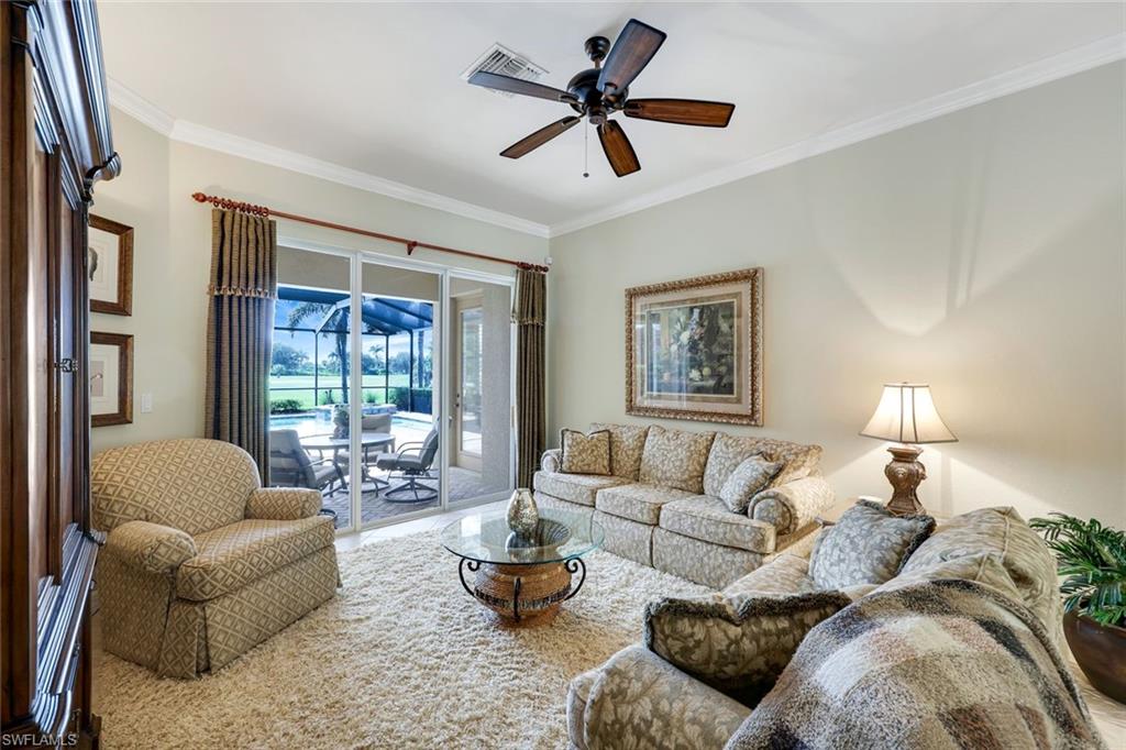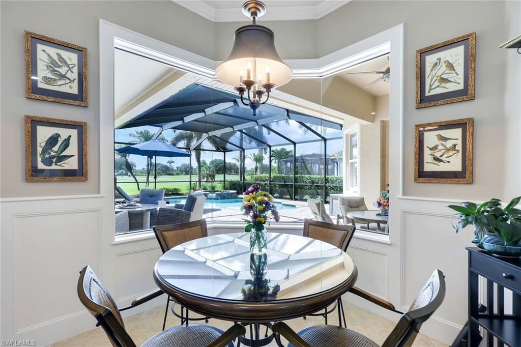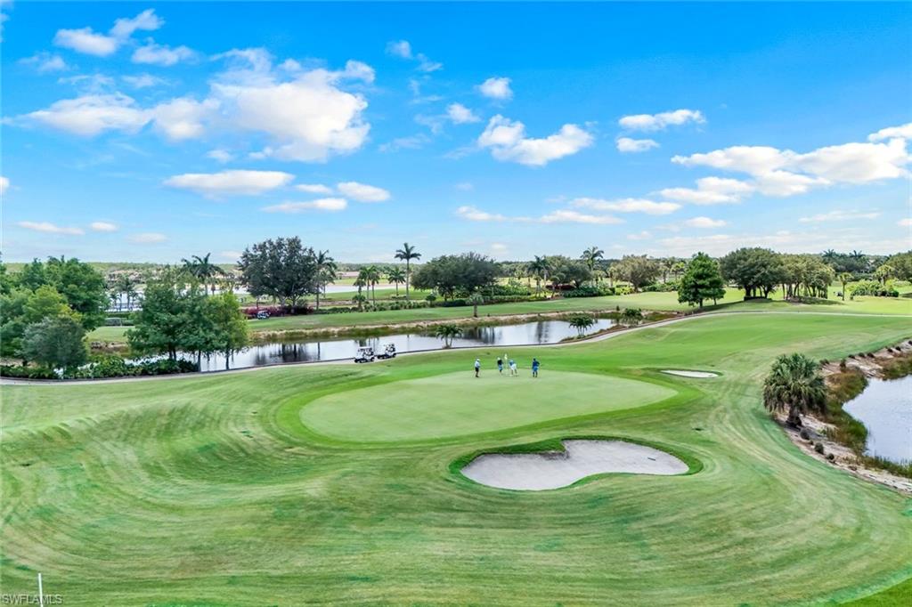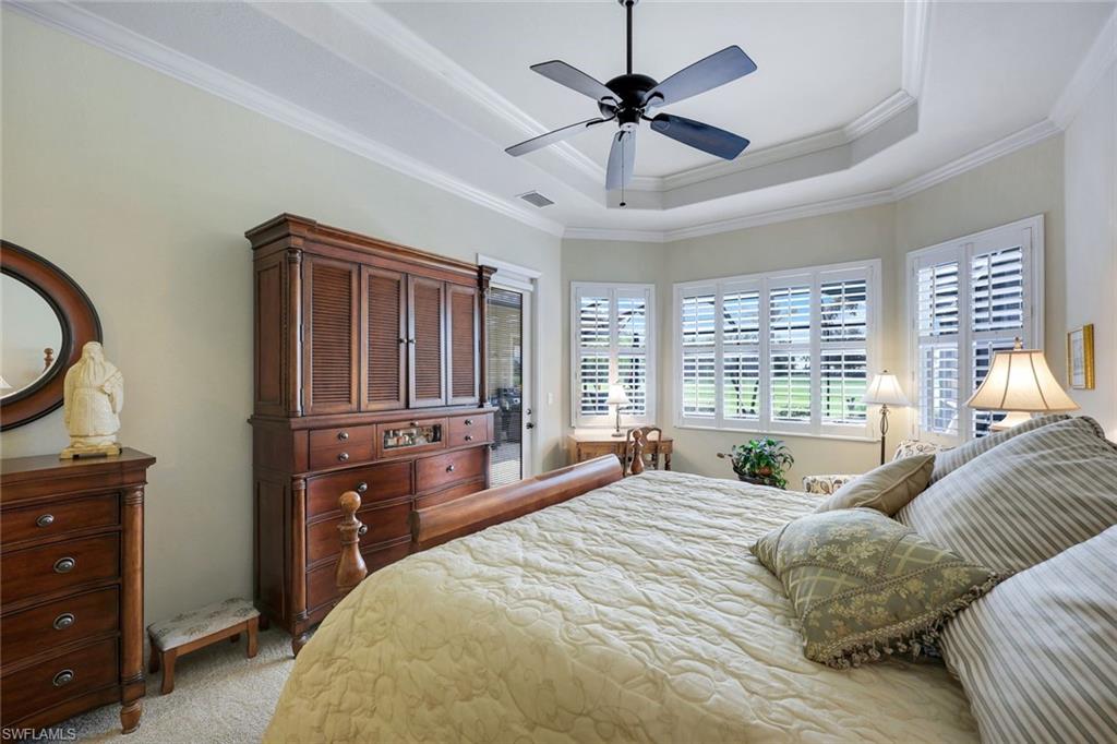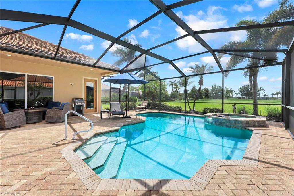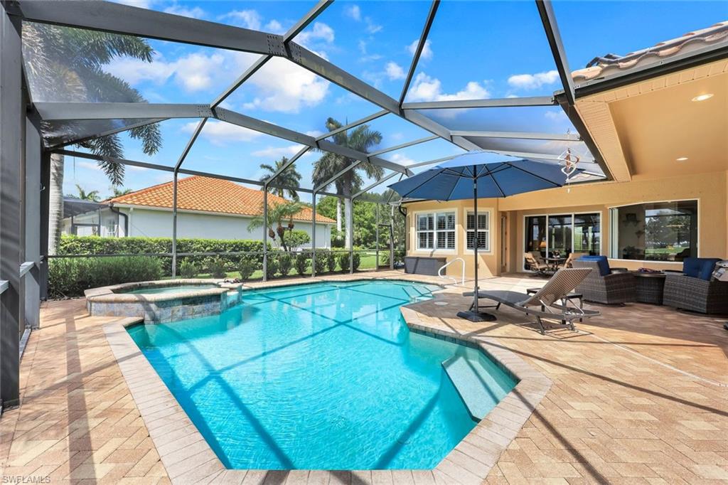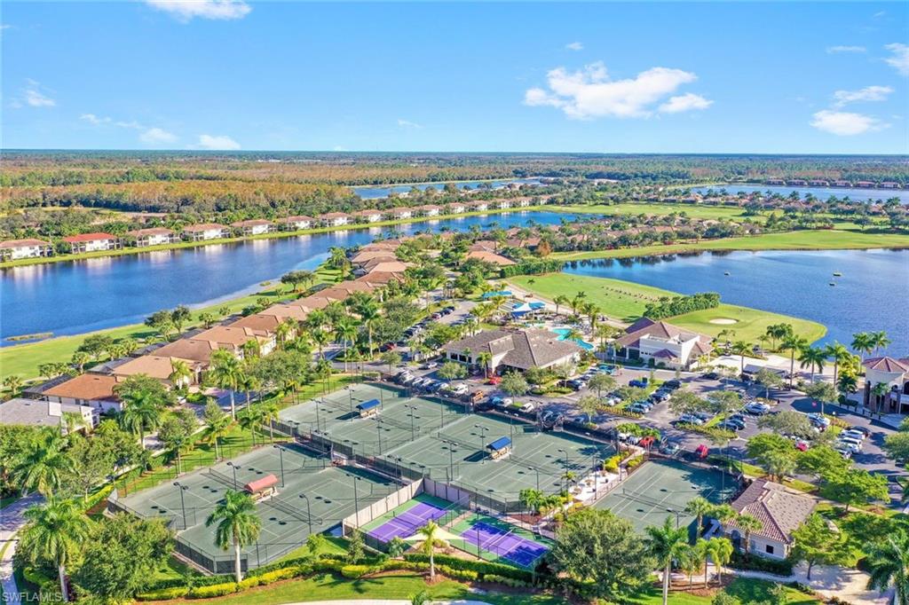 Full golf membership included! This immaculate Doral model is situated on one of the largest oversized pie-shaped lots in Heritage Bay and is one of only four homes in the entire community with no adjacent neighbor in the front, offering added privacy and stunning views. Enjoy breathtaking, panoramic southeastern exposure overlooking the #4 green and lake. Offered furnished, this home is loaded with upgrades including custom closets, coffered ceilings, crown molding throughout, granite countertops, stainless steel appliances, hurricane panels, plantation shutters on every window,new pool/spa electric heater installed in 2025, variable speed pool pump installed in 2023 and a 5 ton HVAC system installed in 2022. Located just a short 3-minute walk from the newly completed resort-style pool and full-service outdoor restaurant, this home is perfectly positioned to enjoy the best of what Heritage Bay has to offer. The recently renovated clubhouse and brand-new Grille Room overlooking the golf course and lake elevate the lifestyle even further. Heritage Bay is one of Naples' premier bundled golf communities, featuring 27 holes of championship golf, 7 HAR-TRU tennis courts, a state-of-the-art fitness center with yoga, spin, and weight rooms, as well as pickleball, bocce, and more. The special assessment for community improvements has been paid in full by the seller—just move in and enjoy!
