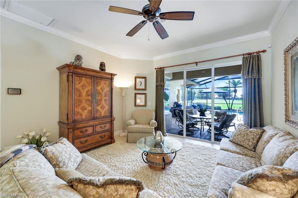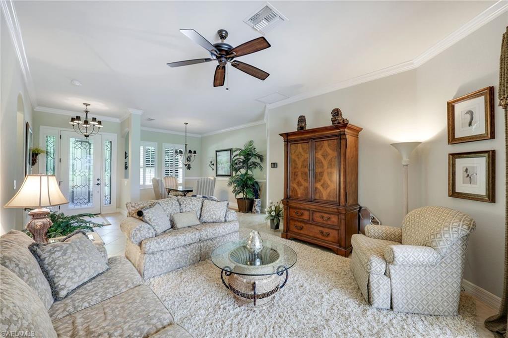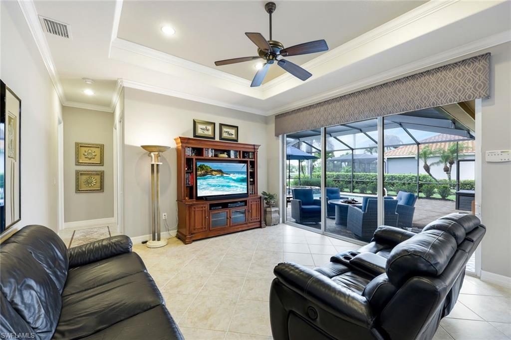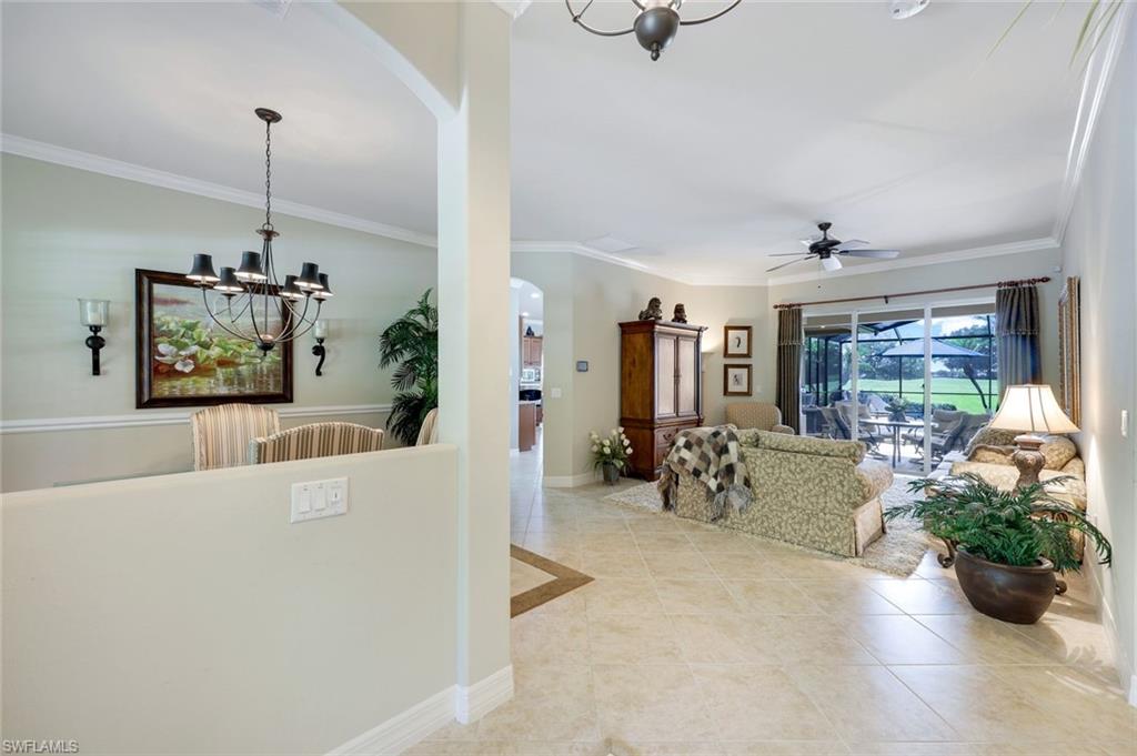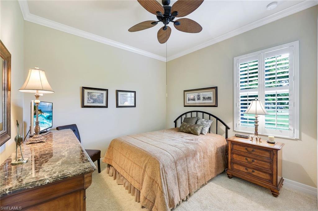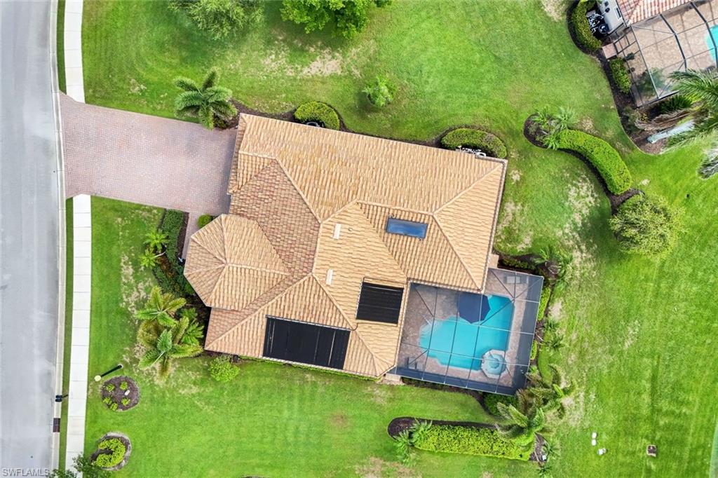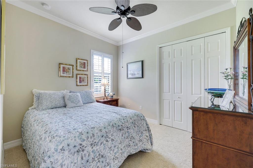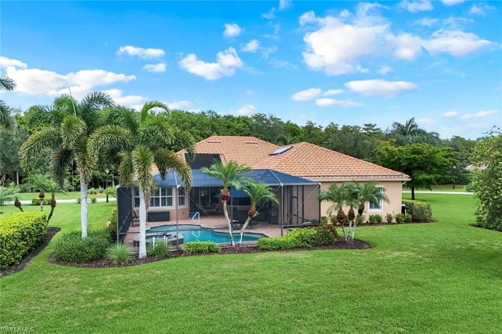 Full golf membership included! This immaculate Doral model is situated on one of the largest oversized pie-shaped lots in Heritage Bay and is one of only four homes in the entire community with no adjacent neighbor in the front, offering added privacy and stunning views. Enjoy breathtaking, panoramic southeastern exposure overlooking the #4 green and lake. Offered furnished, this home is loaded with upgrades including custom closets, coffered ceilings, crown molding throughout, granite countertops, stainless steel appliances, hurricane panels, plantation shutters on every window,new pool/spa electric heater installed in 2025, variable speed pool pump installed in 2023 and a 5 ton HVAC system installed in 2022. Located just a short 3-minute walk from the newly completed resort-style pool and full-service outdoor restaurant, this home is perfectly positioned to enjoy the best of what Heritage Bay has to offer. The recently renovated clubhouse and brand-new Grille Room overlooking the golf course and lake elevate the lifestyle even further. Heritage Bay is one of Naples' premier bundled golf communities, featuring 27 holes of championship golf, 7 HAR-TRU tennis courts, a state-of-the-art fitness center with yoga, spin, and weight rooms, as well as pickleball, bocce, and more. The special assessment for community improvements has been paid in full by the seller—just move in and enjoy!