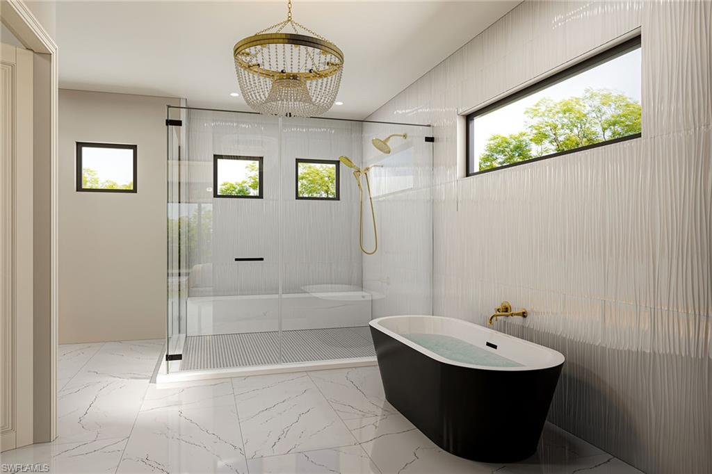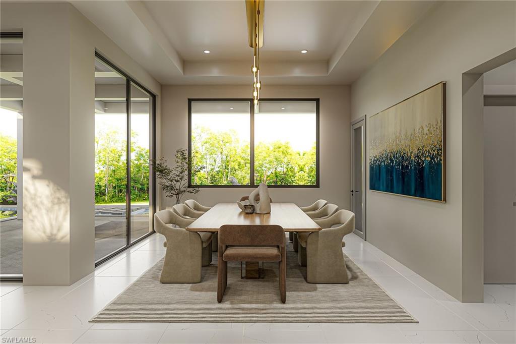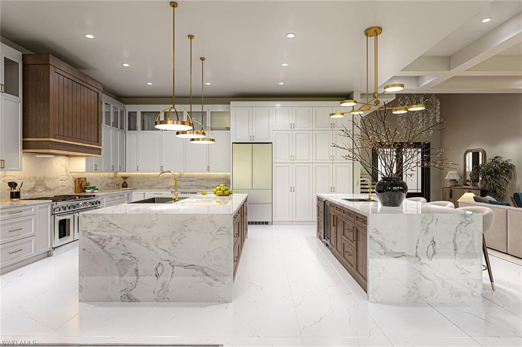 Discover the epitome of luxury in this custom-built five-bedroom plus den, five-bath contemporary home. This remarkable two-story residence spans over 4,900 square feet of air-conditioned living space, offering opulence and comfort in every corner. Enter into the expansive great room, where a custom feature stone wall with built-in electric fireplace creates a breathtaking focal point. Adjacent, the gourmet chef's dream kitchen awaits, boasting working and social islands, hand-crafted custom cabinetry, Thermador gas range and a spacious butler's pantry. Completing this culinary haven is a unique built-in wine cooler. The intelligently designed floor plan ensures privacy and convenience, featuring a primary suite retreat and guest bedroom en-suite on the first floor with an additional three en-suite guest bedrooms, additional laundry room, loft and private balcony on the second floor. Tile floors throughout the home add a touch of elegance and durability. Enjoy the long water canal views and embrace the Florida lifestyle with an exceptional outdoor living space designed for relaxation and entertainment. The saltwater pool, spa, summer kitchen with bar, beverage cooler and ice machine, outdoor shower and firepit provide a haven for enjoyment. The covered deck areas are equipped with electric shutters and screens offering comfort and protection. Additional features include a whole-house generator, 500-gallon propane tank, three-car garage, and impact windows and doors. This home is a sanctuary of luxury, thoughtfully crafted with meticulous attention to detail. Indulge in the unparalleled elegance and sophistication of this magnificent Marco Island estate, where every amenity and feature has been designed to enhance your living experience. Estimated completion date September 2026. Photos in this listing have been virtually rendered and are not of actual home.