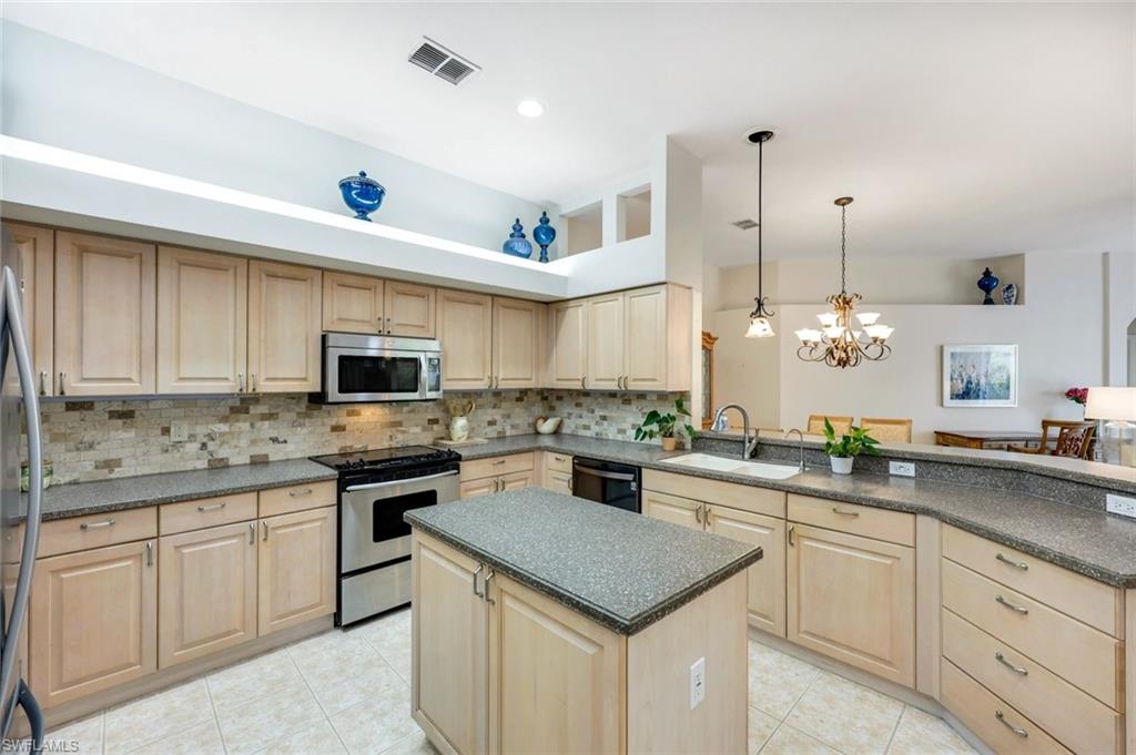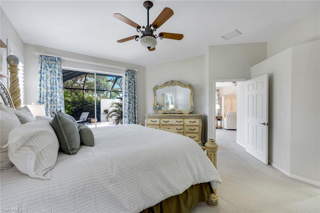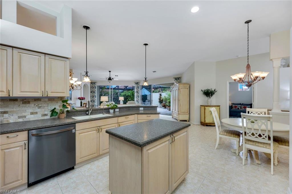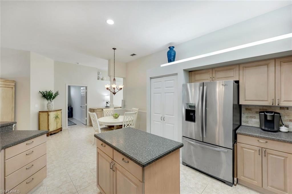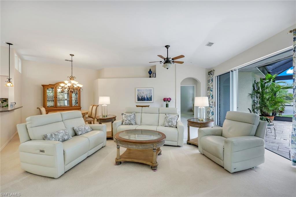 Rarely available and move-in ready! Portobello V floor plan, west facing lot with lake and fountain views! Welcome to this beautifully maintained 3-bedroom, 2-bathroom villa, offering 2,006 sq. ft. of single-level living. This home features the largest villa floor plan in the community - the coveted Portobello V layout - designed for spacious, indoor-outdoor living, full of natural light! Step into an inviting open floor plan that seamlessly connects a spacious kitchen with center island and counter seating, a generous dining area with chandelier, and a bright living room with a view! Expansive sliding glass doors span the length of the living space, opening to a large screened lanai, with tranquil lake and fountain views on a west-facing lot! The primary suite is a private retreat with its own lanai access and a spacious en-suite bath featuring a garden tub, walk-in shower, and dual vanities. The third bedroom offers flexible use as a guest room, home office, or cozy den. Additional features include a 2-car garage, abundant natural light throughout, and a premier location directly across from the bocce courts. For added peace of mind, Lighthouse Bay completed a community-wide roof replacement in 2020, featuring durable stone-coated steel shingles. Enjoy a true resort-style experience in this amenity-rich, gated community. Lighthouse Bay offers a lagoon-style pool, multiple satellite pools, a lap pool, 2.5 miles of walking and jogging paths, a bocce program, staffed tennis courts, two boathouses, a state-of-the-art fitness center, sauna, clubhouse, library, and an Arts & Learning Center. As an added bonus, this home includes a Bronze Membership to The Brooks Commons Club, providing access to a private restaurant, an enrichment center, pickleball, social events, and more. Located just minutes from Coconut Point Mall, world-class dining, entertainment, SWFL International Airport, and pristine beaches, this home is a rare opportunity to embrace the Southwest Florida lifestyle.