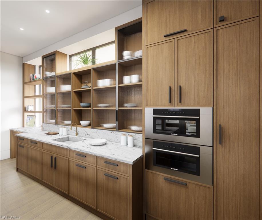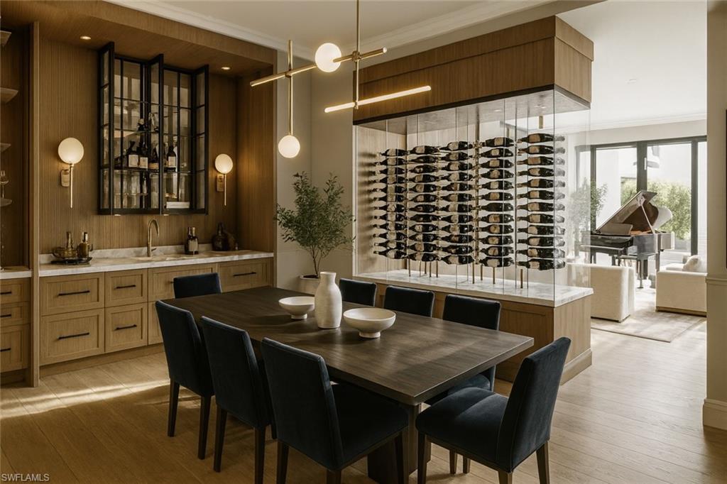 Commanding a rare, western lakefront view in Old Naples, this new construction estate redefines scale, craftsmanship, and architectural clarity. Encompassing over 9,400 square feet of interior living space, the home was conceived as a private resort - where every element supports both the grand and granular aspects of daily living. Twin infinity-edge reflecting pools frame the entrance, opening into a dramatic two-story great room with precision millwork, architectural symmetry, and a sculptural floating staircase. Adjacent, a formal dining room is anchored by a custom, glass-enclosed wine wall integrated into bespoke cabinetry. The kitchen, defined by a curved steel-and-glass partition, includes Wolf/Sub-Zero appliances, dual Miele coffee stations, and a concealed butler’s pantry equipped for large-scale entertaining. Subtle finishes and architectural restraint elevate the overall atmosphere. The first-floor primary suite is entirely self-contained, featuring a private study, two oversized dressing rooms, a discreet laundry center, and a marble-clad bath with indoor/outdoor showers. Upstairs, five additional bedroom suites are complemented by a media lounge and a concealed club room with full bar and humidor. Outdoor architecture is equally refined. A 60-foot negative-edge pool extends across the rear elevation, interrupted by a series of stepping-stones that lead to a sunken firepit lounge surrounded by water. An elevated spa, covered loggia, and summer kitchen complete the space. Above it all, a detached fitness pavilion with breath-taking wide lake vistas, introducing a compelling architectural counterpoint. Additional features include 13x Toto Neorest toilets, three laundry stations, a commercial-grade sheet ironer, full-home generator, elevator, and a five-car split garage designed for collectors. A comprehensive smart home system governs all functions discreetly. Realized by New England based developer EMB Custom Homes, and executed by MHK Architecture, Lotus Construction, and Freestyle Interiors, this fully furnished residence is a singular opportunity in the Naples luxury market. An unrivaled legacy property. Completion is scheduled for October 2025.